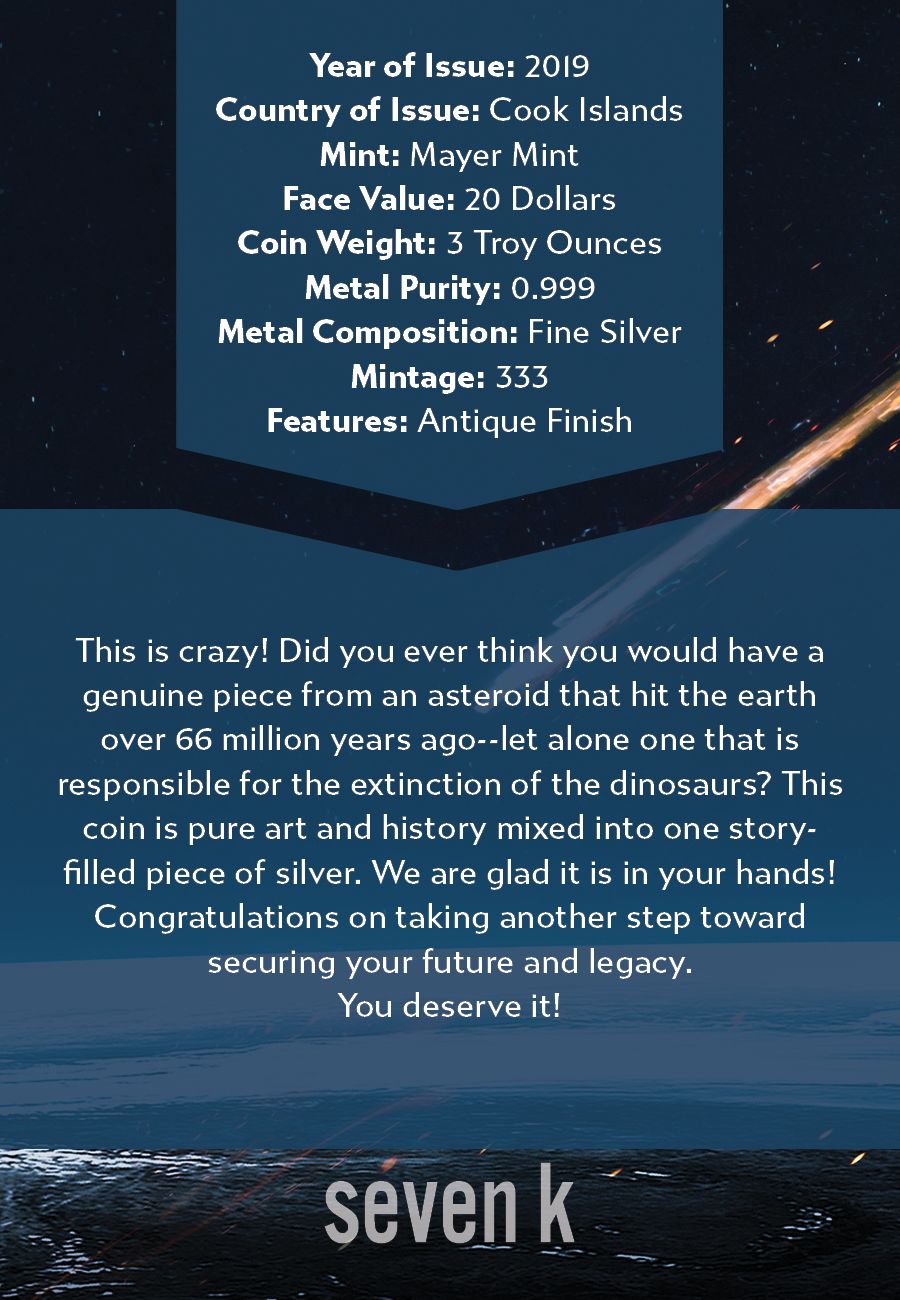 This is crazy! Did you ever think you would have a genuine piece of an asteroid that hit the earth over 66 million years ago--let alone one that is responsible for the extinction of the dinosaurs? This coin is pure art and history mixed into one story-filled piece of silver. We are glad it is in your hands!