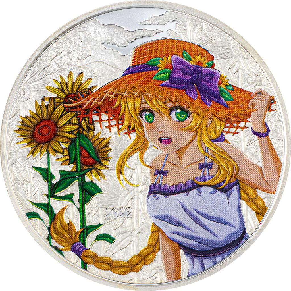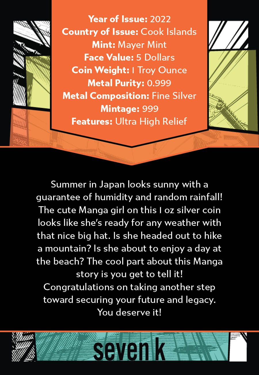 Summer in Japan looks sunny with a guarantee of humidity and random rainfall! The cute Manga girl on this 1 oz silver coin looks like she’s ready for any weather with that nice big hat. Is she headed out to hike a mountain? Is she about to enjoy a day at the beach? The cool part about this Manga story is you get to tell it!