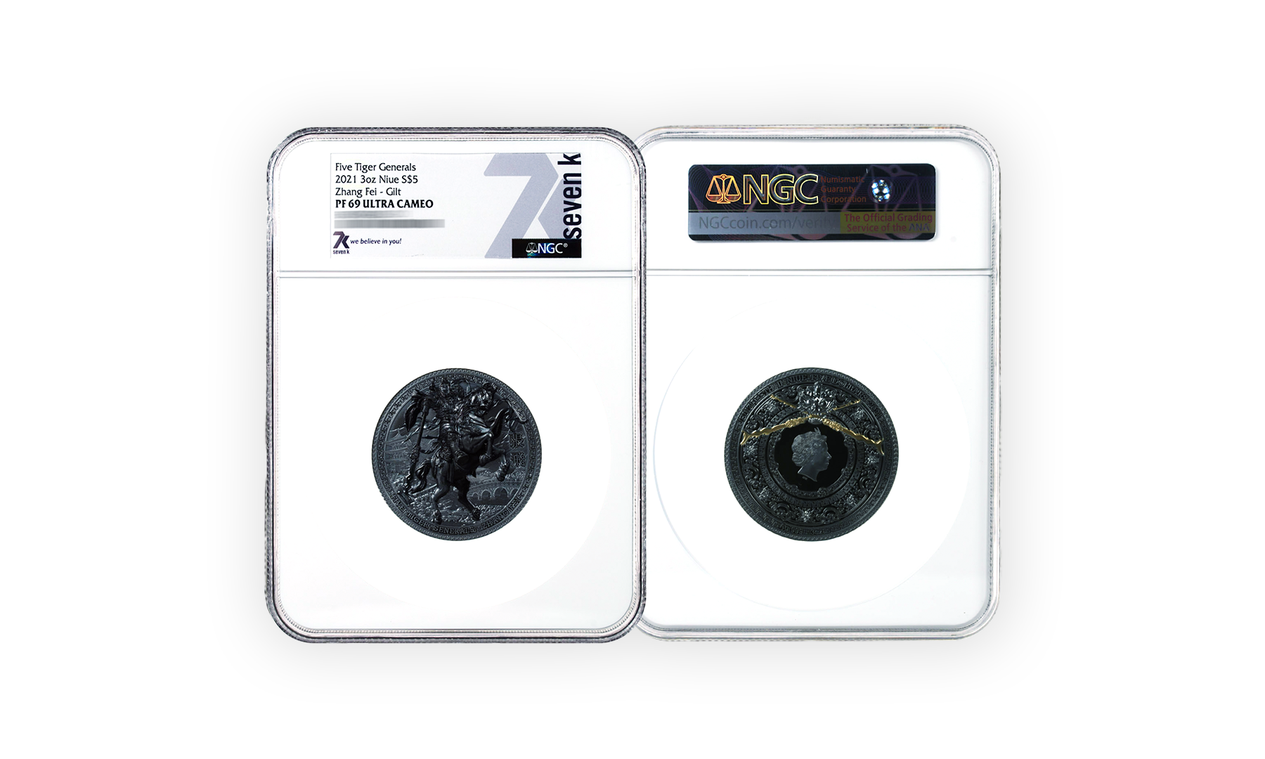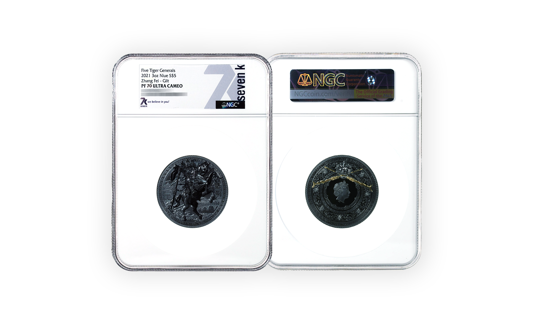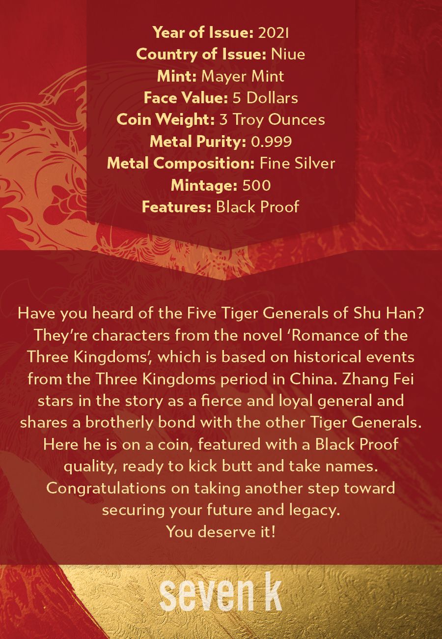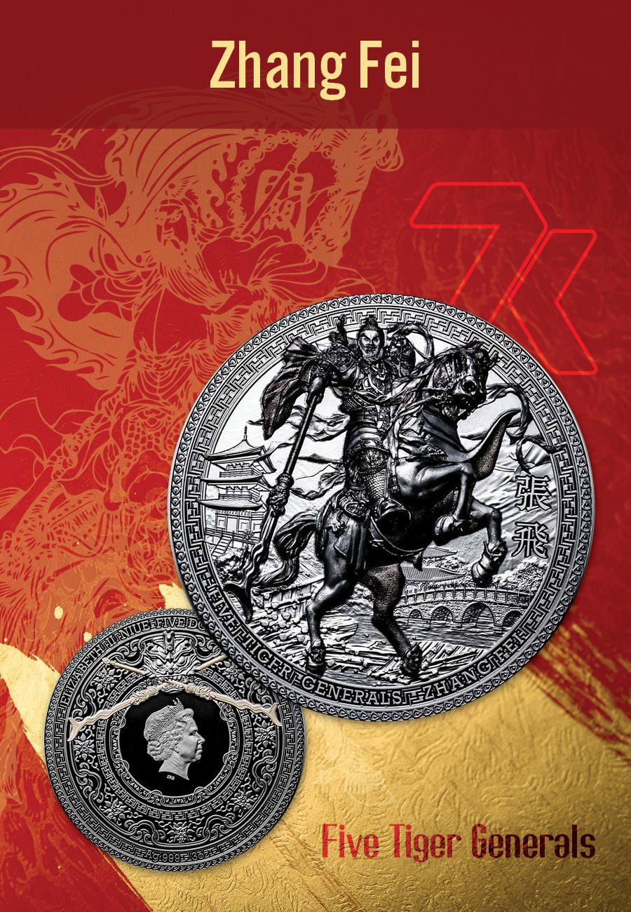Have you heard of the Five Tiger Generals of Shu Han? They’re characters from the novel 'Romance of the Three Kingdoms', which is based on historical events from the Three Kingdoms period in China. Zhang Fei stars in the story as a fierce and loyal general and shares a brotherly bond with the other Tiger Generals. Here he is on a coin, featured with a Black Proof quality, ready to kick butt and take names.