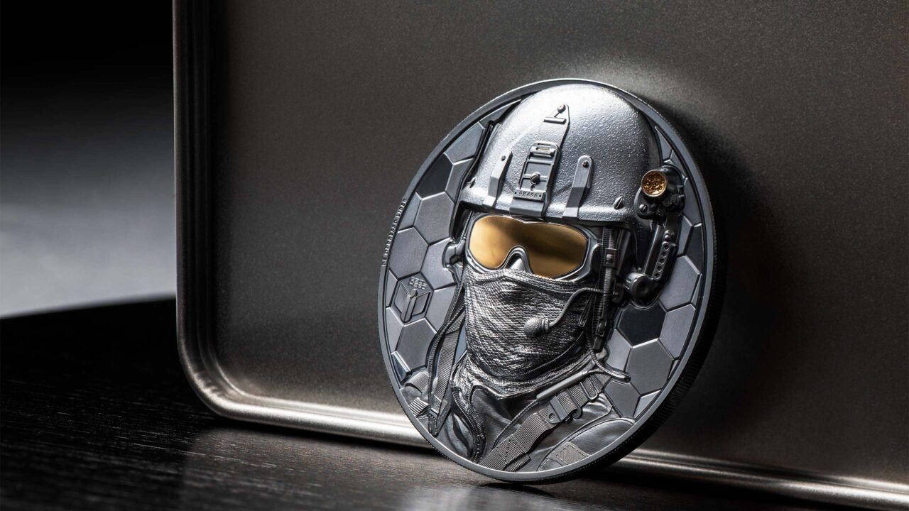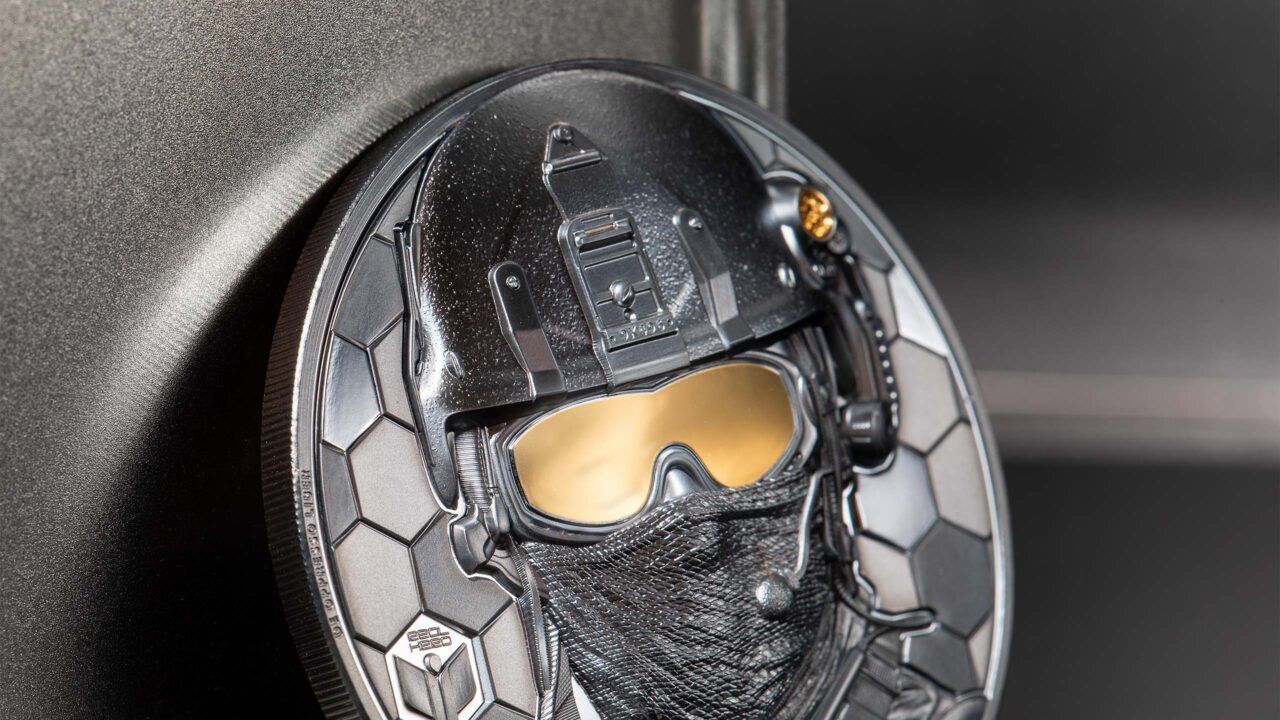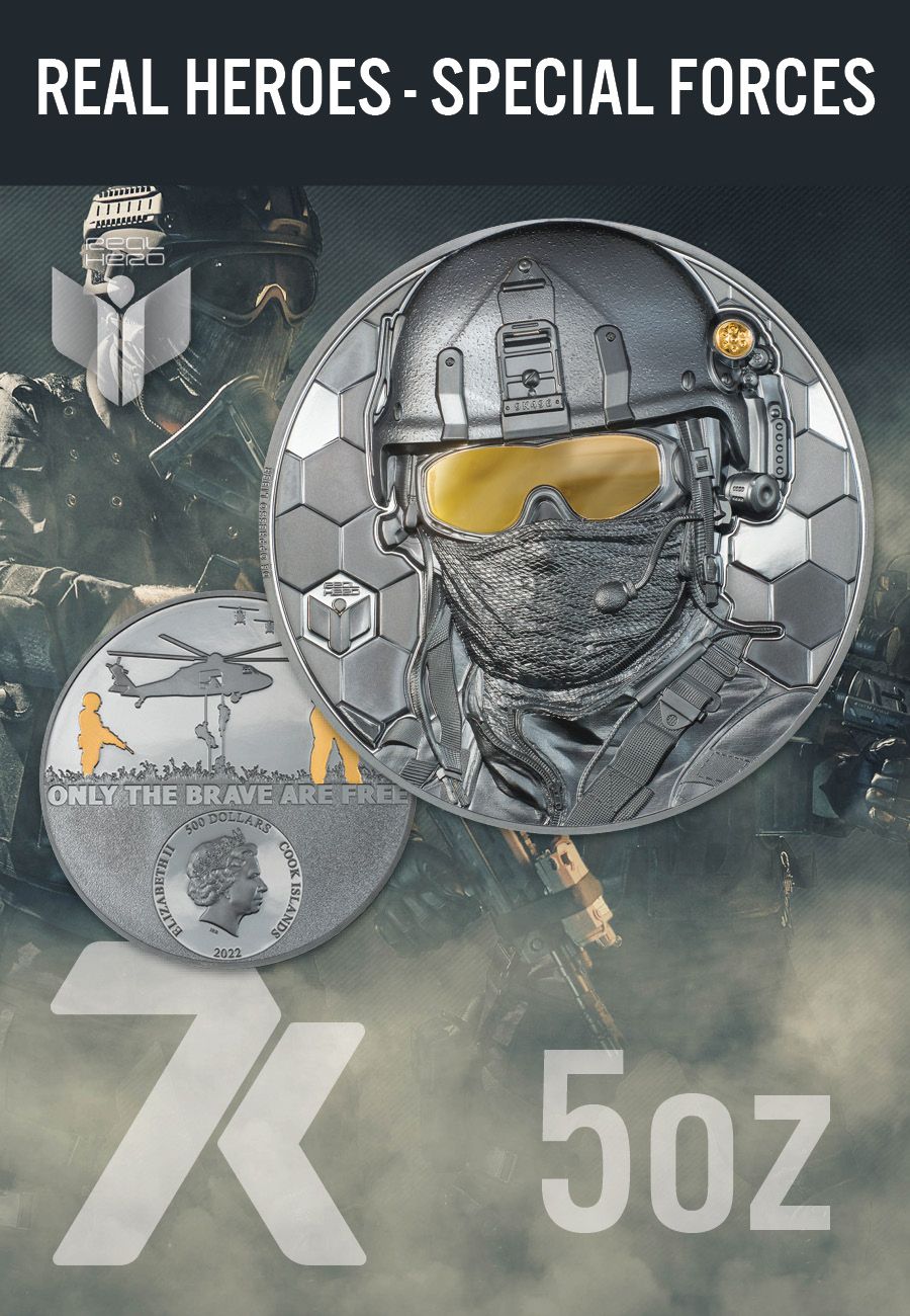 The triumphant return of last year's Special Forces collection includes this impressive 5-ounce, golden tribute to the brave soldiers who serve in special forces. Black Proof contrasts the gold finish of the soldier's goggles on the reverse, while golden silhouettes draw the eye to the obverse just above the words "only the brave are free". With a mintage of only 29, this coin is a rarity fitting of a memorial to the few and faceless soldiers of Special Forces.