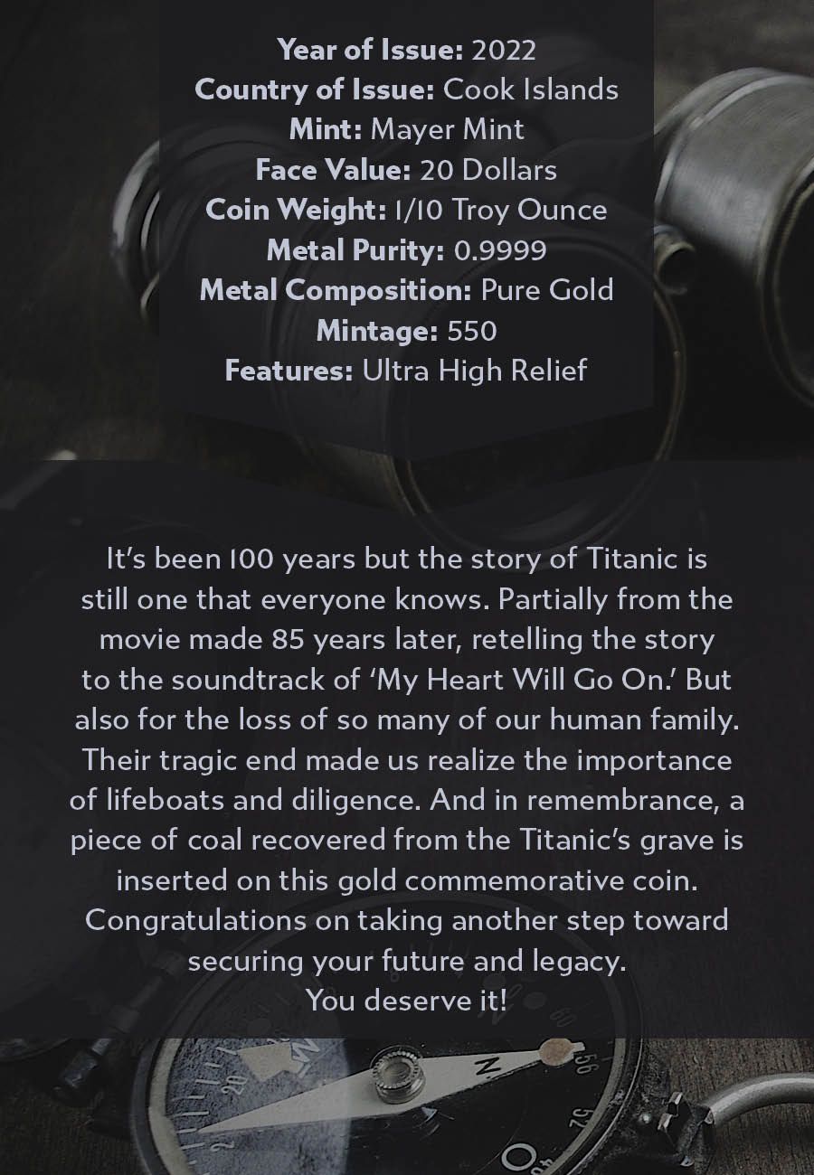 It’s been 100 years but the story of Titanic is still one that everyone knows. Partially from the movie made 85 years later, retelling the story to the soundtrack of ‘My Heart Will Go On.’ But also for the loss of so many of our human family. Their tragic end made us realize the importance of lifeboats and diligence. And in remembrance, a piece of coal recovered from the Titanic’s grave is inserted on this gold commemorative coin.