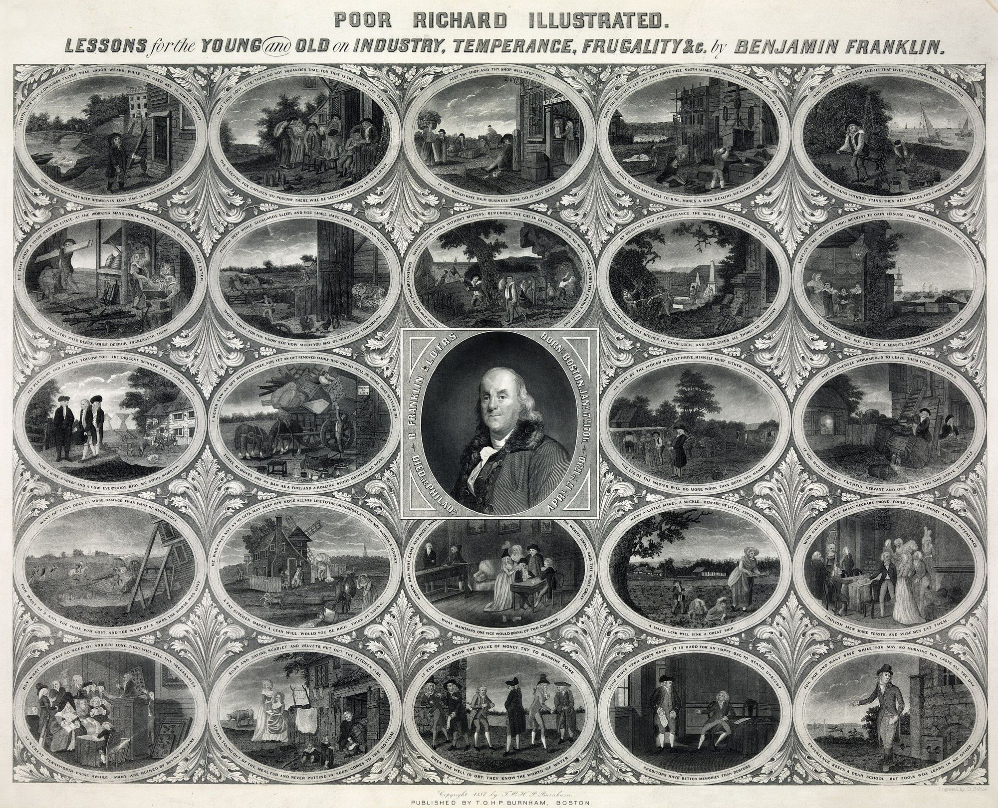 Well not only did he get away with it, but Old Ben thrived in his new career. He went on to publish one of the more influential pamphlets in American history, Poor Richard’s Almanack. In it, he published anything that he thought had merit. From short stories to poetry to weather forecasts, Poor Richard’s had it all. He even included proverbs of his own making. Little ditties like: