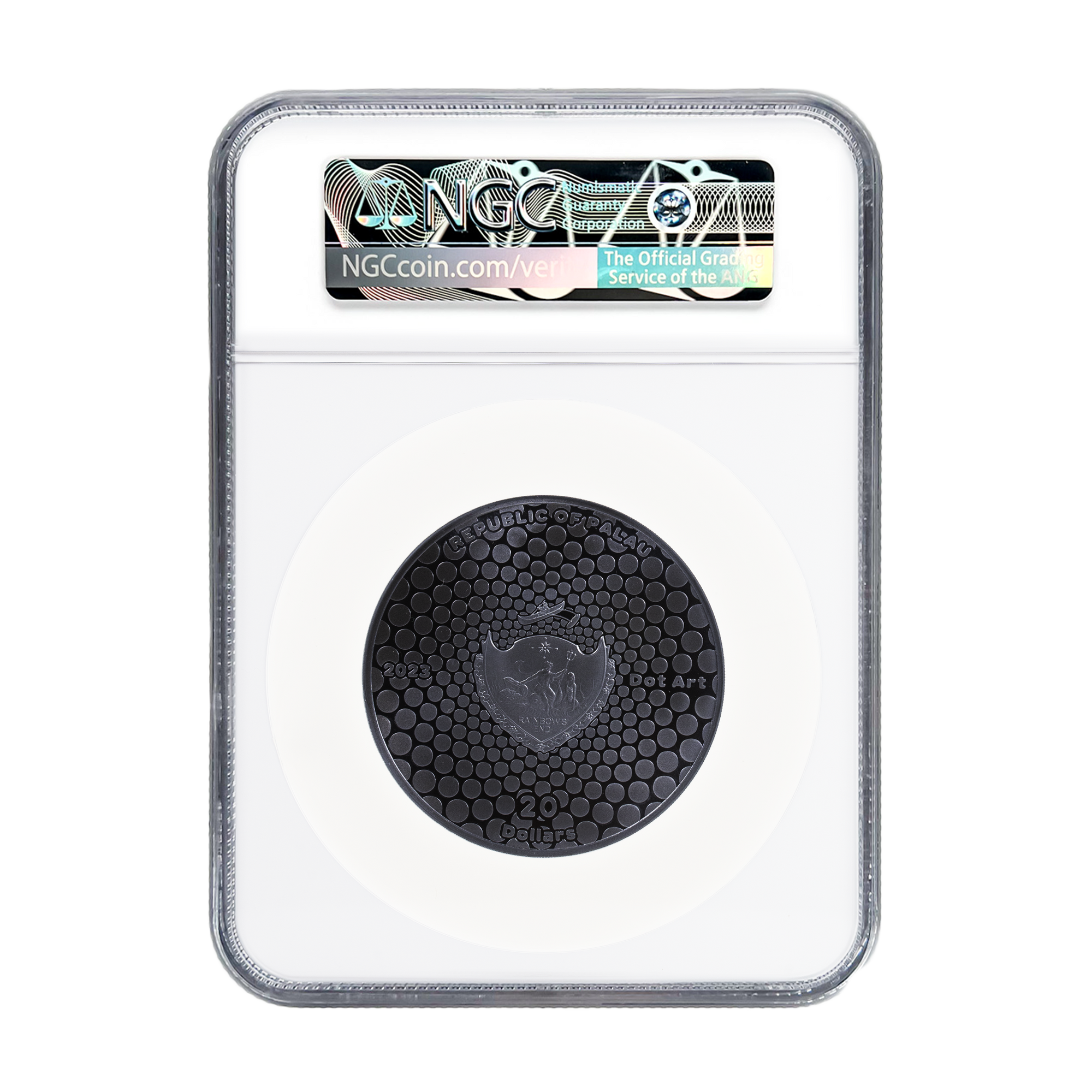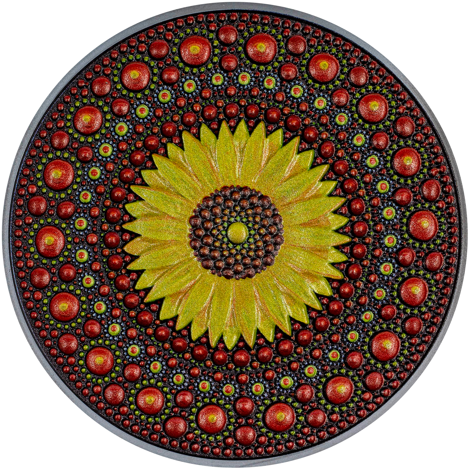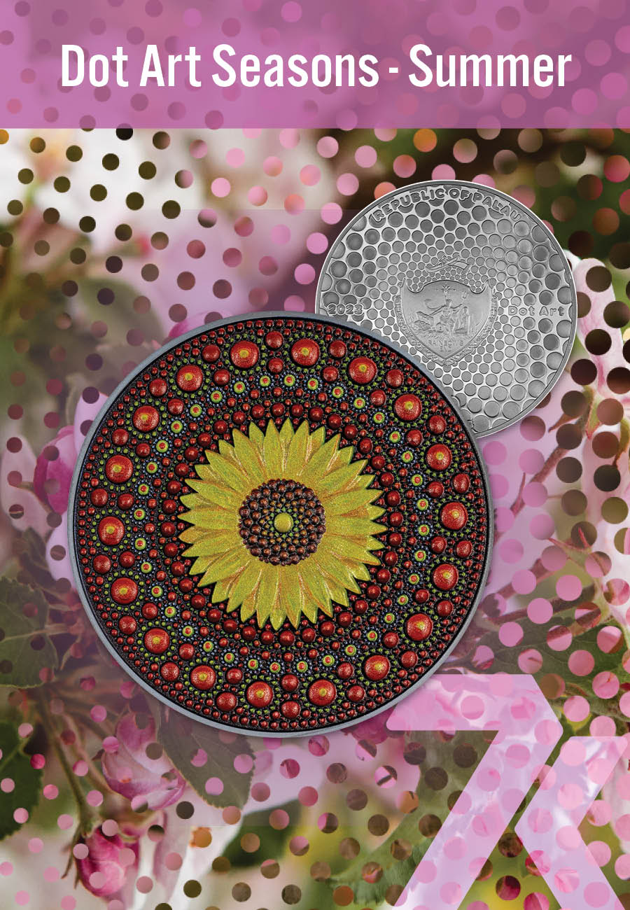 Summer…summer…summer…the word tastes like sunlight and honeysuckles. On this addition to the 7k-exclusive collection Dot Art Four Seasons a brilliant sunflower sits in the center of a mandala of crimson and lime droplets. Closer study is almost impossible as your eye wants to zoom out and appreciate the tantalizing effects of its entirety, but if you can focus on the singular dots you’ll be impressed by the immaculate detail of this coin. Can a coin be hot? If so, this one is.