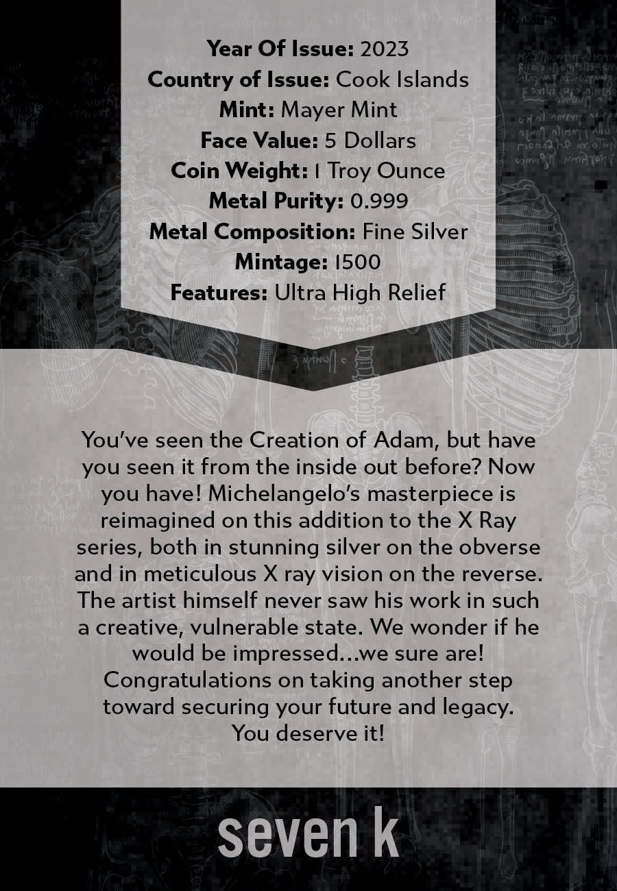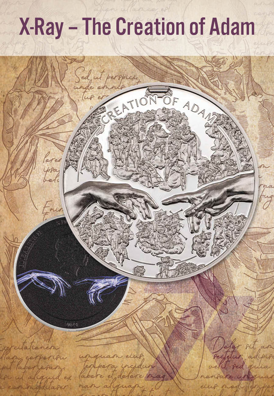 You’ve seen the Creation of Adam, but have you seen it from the inside out before? Now you have! Michelangelo's masterpiece is reimagined on this addition to the X Ray series, both in stunning silver on the obverse and in meticulous X ray vision on the reverse. The artist himself never saw his work in such a creative, vulnerable state. We wonder if he would be impressed…we sure are!