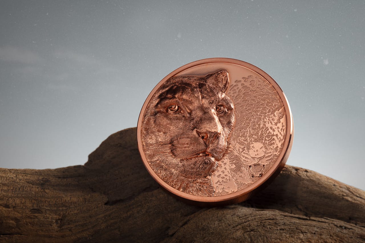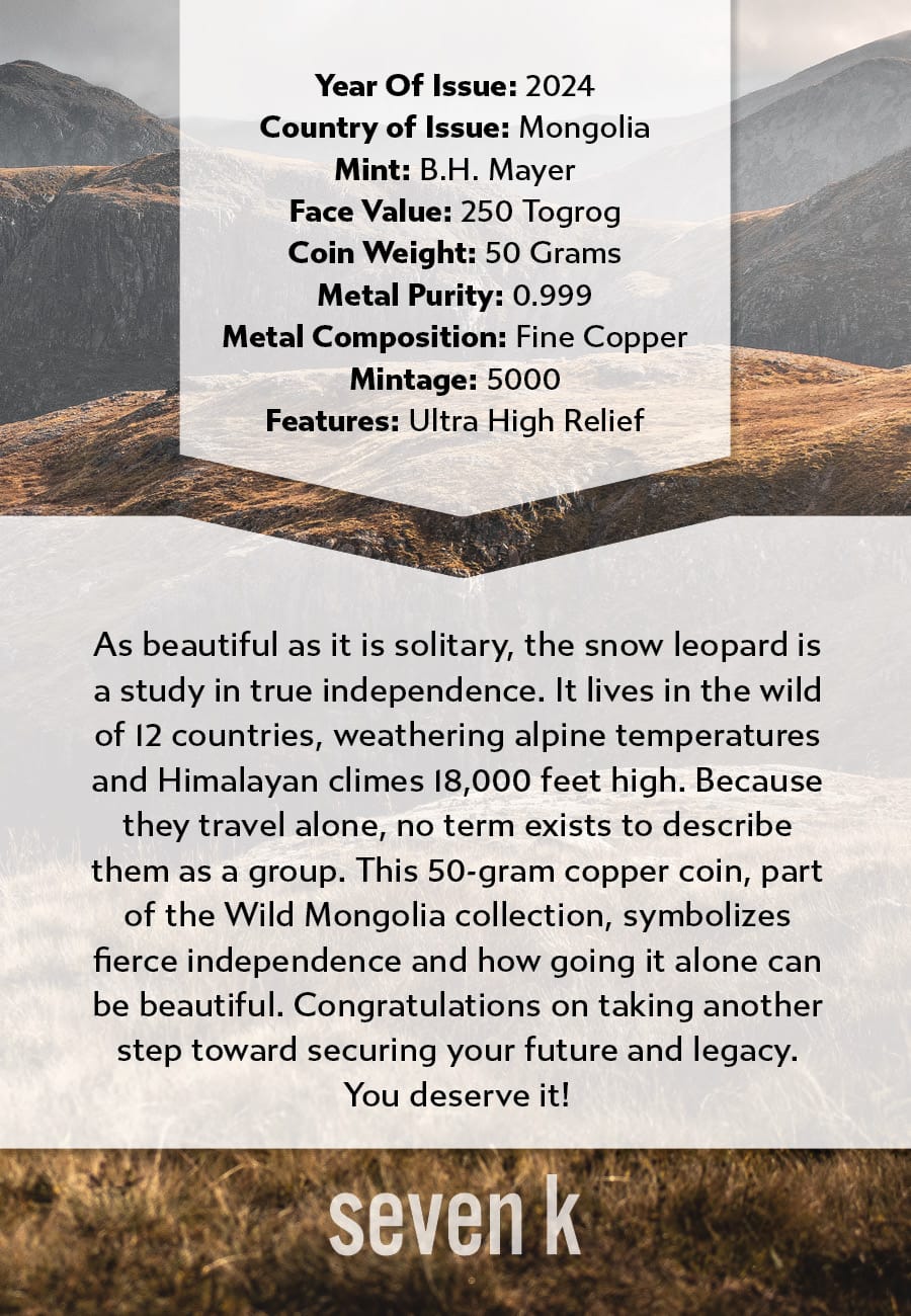 As beautiful as it is solitary, the snow leopard is a study in true independence. It lives in the wild of 12 countries, weathering alpine temperatures and Himalayan climes 18,000 feet high. Because they travel alone, no term exists to describe them as a group. This 50-gram copper coin, part of the Wild Mongolia collection, symbolizes fierce independence and how going it alone can be beautiful.