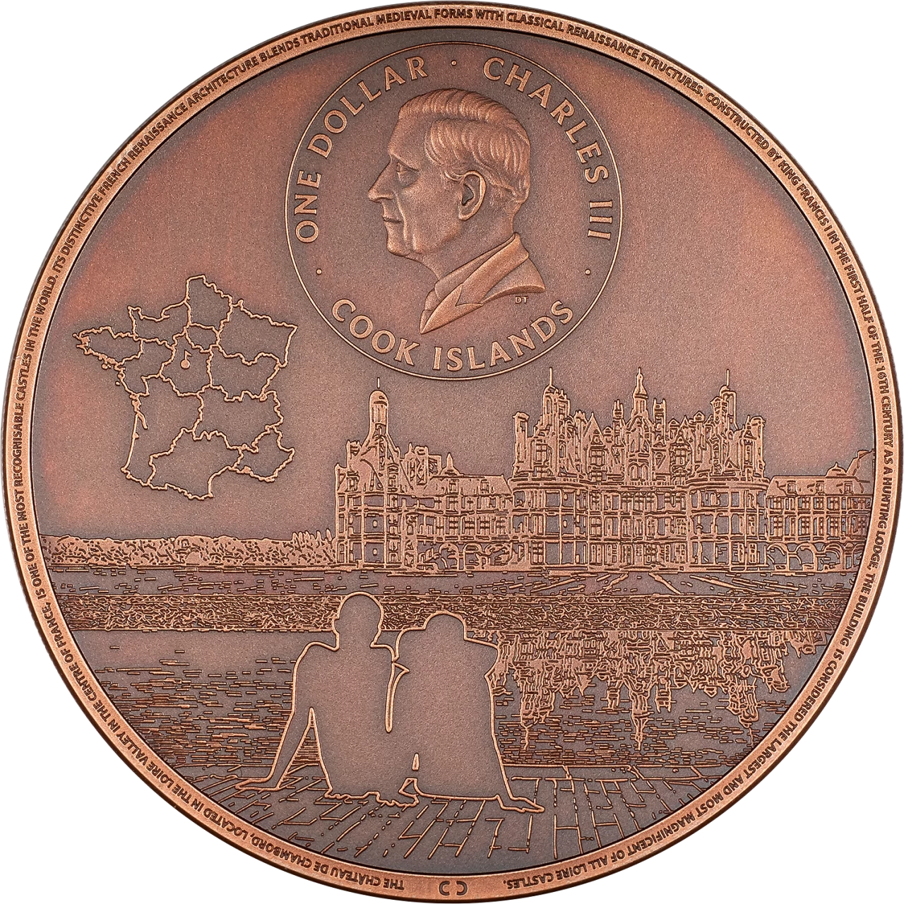 In the countryside of France, a glorious palace idled for hundreds of years, only occasionally receiving such puissant guests as kings and dukes. Claimed as a UNESCO World Heritage site in 1981, Chateau de Chambord has since traded in its royal guests for a more appreciative crowd: history buffs and curious tourists. The artistry on this copper coin may give you an idea of why so many have been captivated by this picturesque monument for so long.