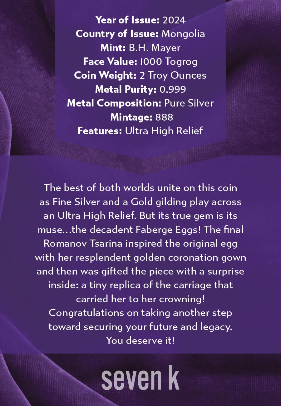 The best of both worlds unite on this coin as fine silver and gold gilding play across an ultra high relief. But its true gem is its muse: the decadent Faberge Eggs! The final Romanov tsarina inspired the original egg with her resplendent golden coronation gown and then was gifted the piece with a surprise inside: a tiny replica of the carriage that carried her to her crowning!