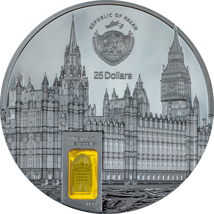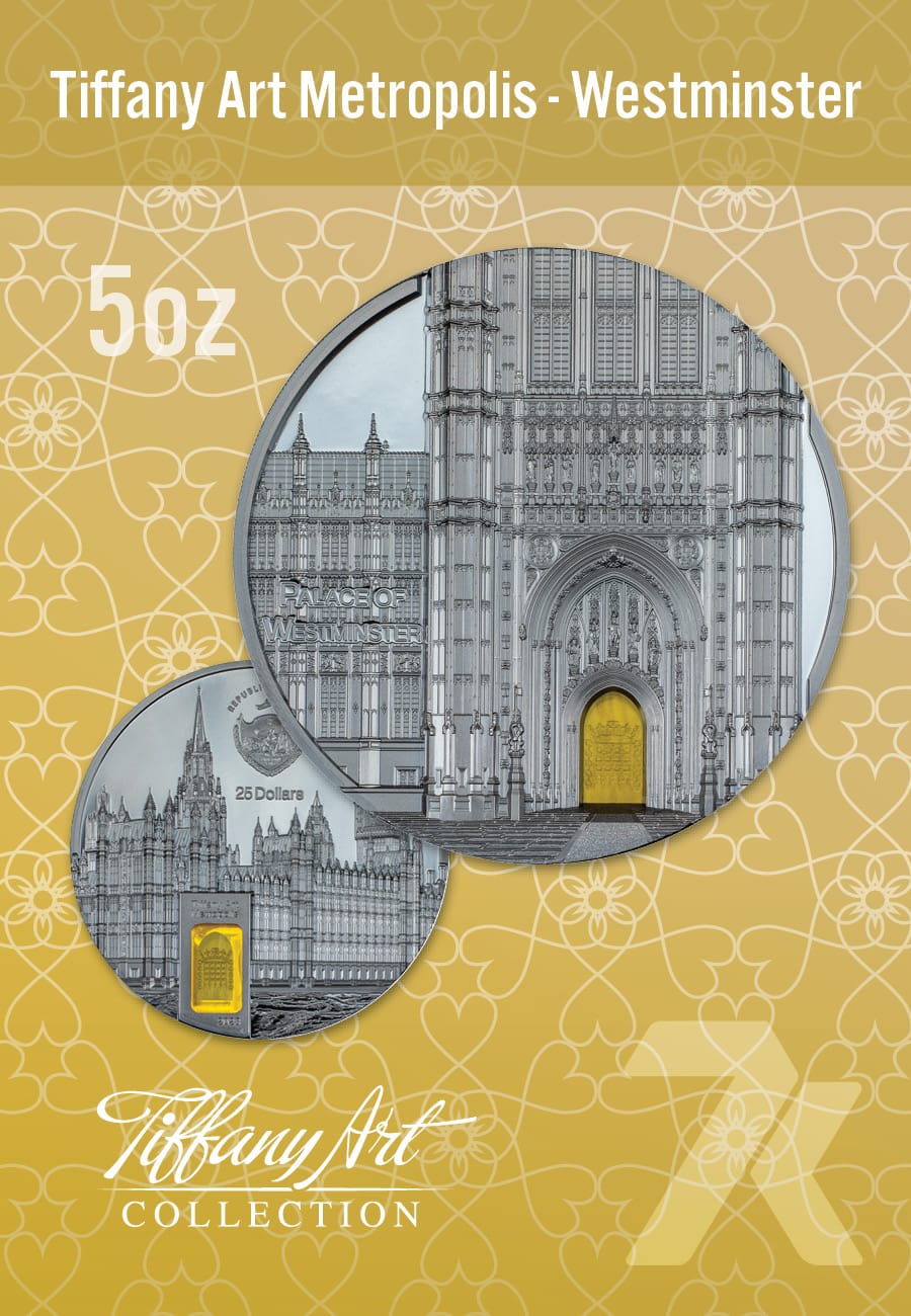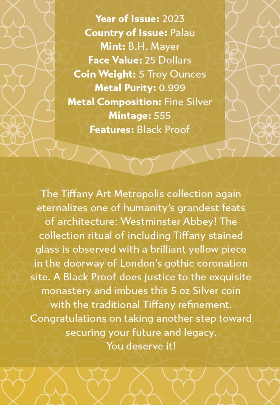 The Tiffany Art Metropolis collection again eternalizes one of humanity’s grandest feats of architecture: Westminster Abbey! The collection ritual of including Tiffany stained glass is observed with a brilliant yellow piece in the doorway of London’s gothic coronation site. A black proof does justice to the exquisite monastery and imbues this 5-oz silver coin with the traditional Tiffany refinement.