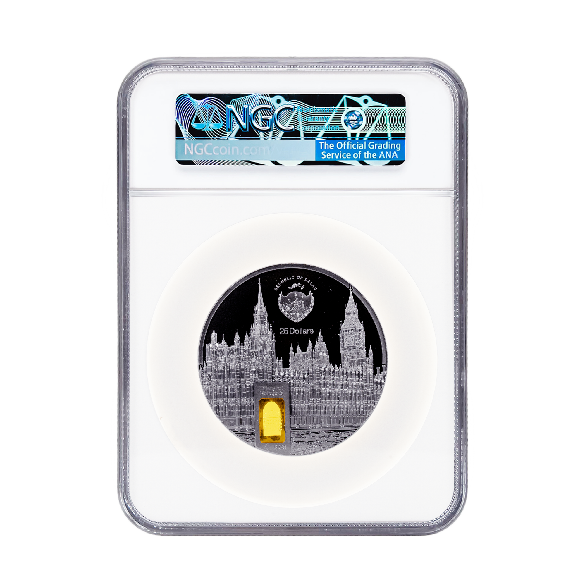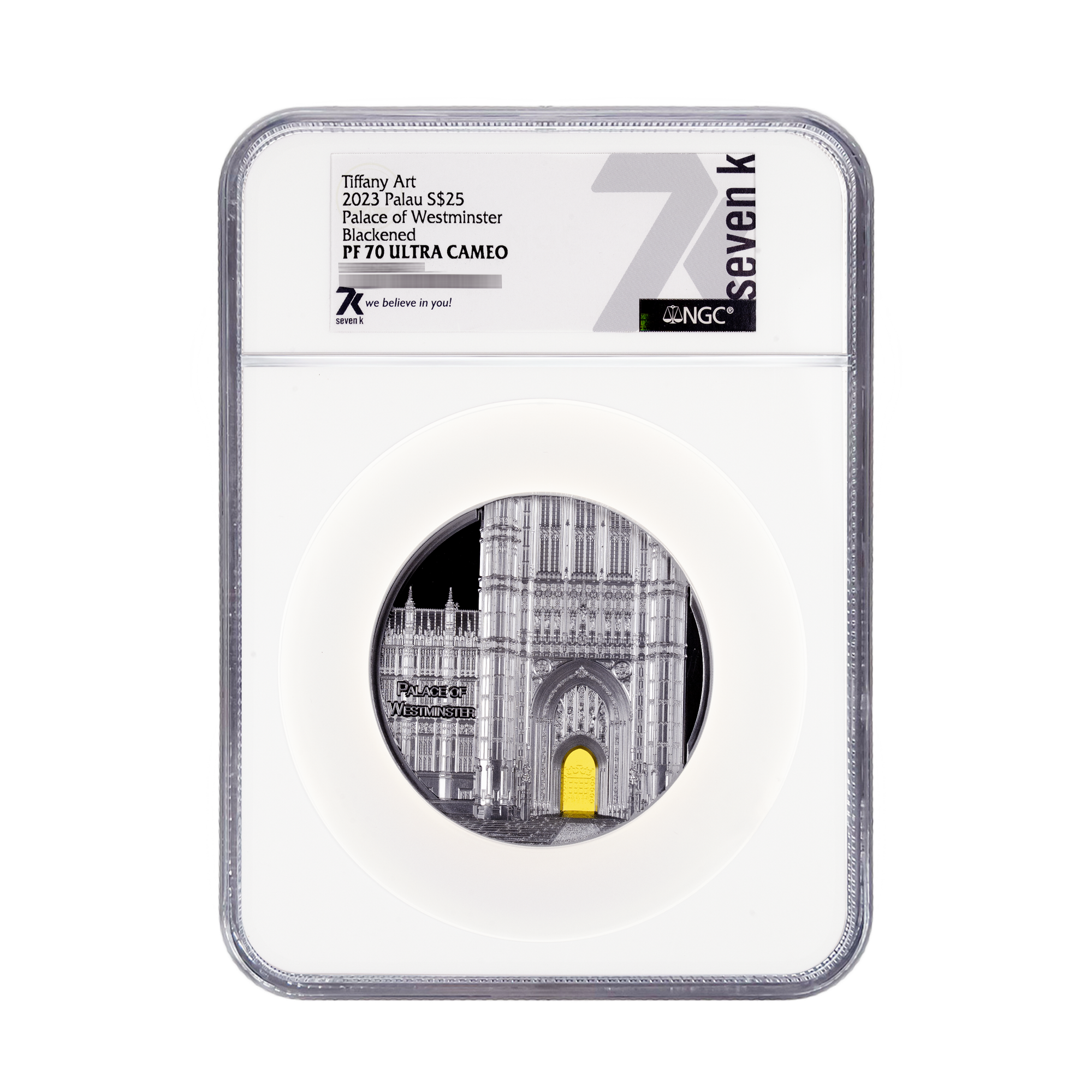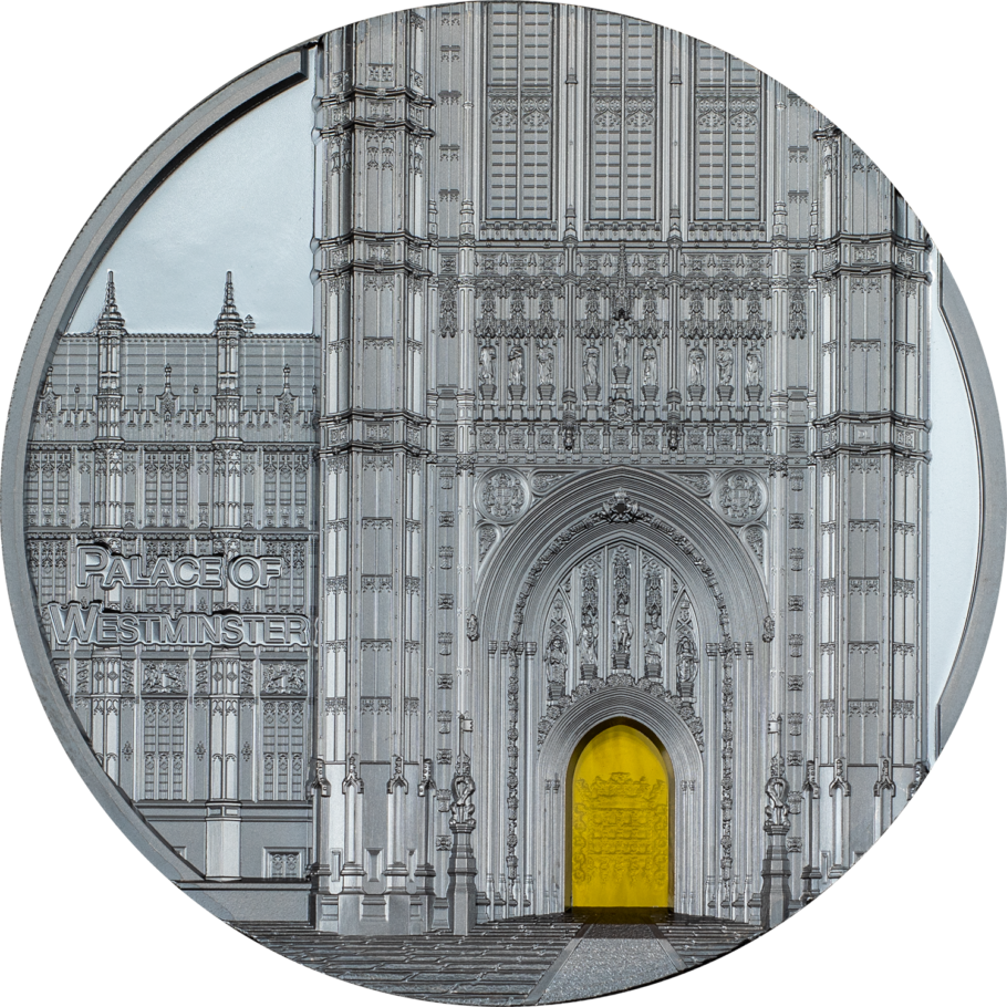 The Tiffany Art Metropolis collection again eternalizes one of humanity’s grandest feats of architecture: Westminster Abbey! The collection ritual of including Tiffany stained glass is observed with a brilliant yellow piece in the doorway of London’s gothic coronation site. A black proof does justice to the exquisite monastery and imbues this 5-oz silver coin with the traditional Tiffany refinement.