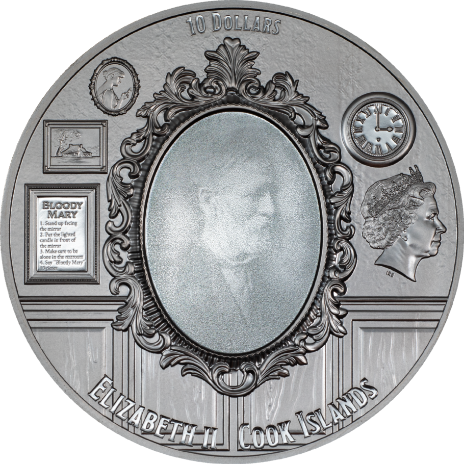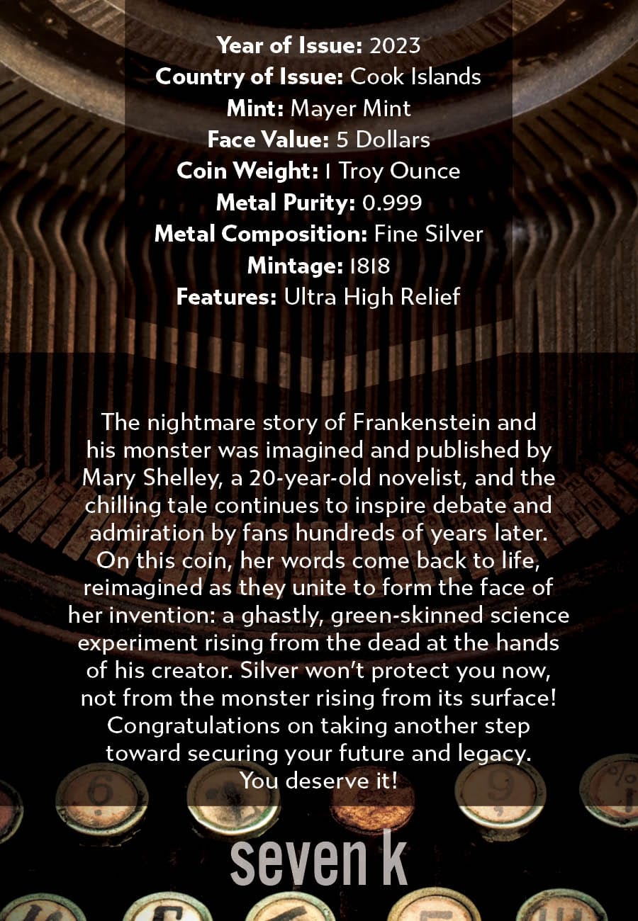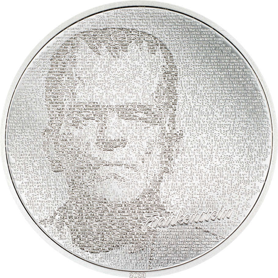 The nightmare story of Frankenstein and his monster was imagined and published by Mary Shelley, a 20-year-old novelist, and the chilling tale continues to inspire debate and admiration by fans hundreds of years later. On this coin, her words come back to life, reimagined as they unite to form the face of her invention: a ghastly, green-skinned science experiment rising from the dead at the hands of his creator. Silver won’t protect you now, not from the monster rising from its surface!
