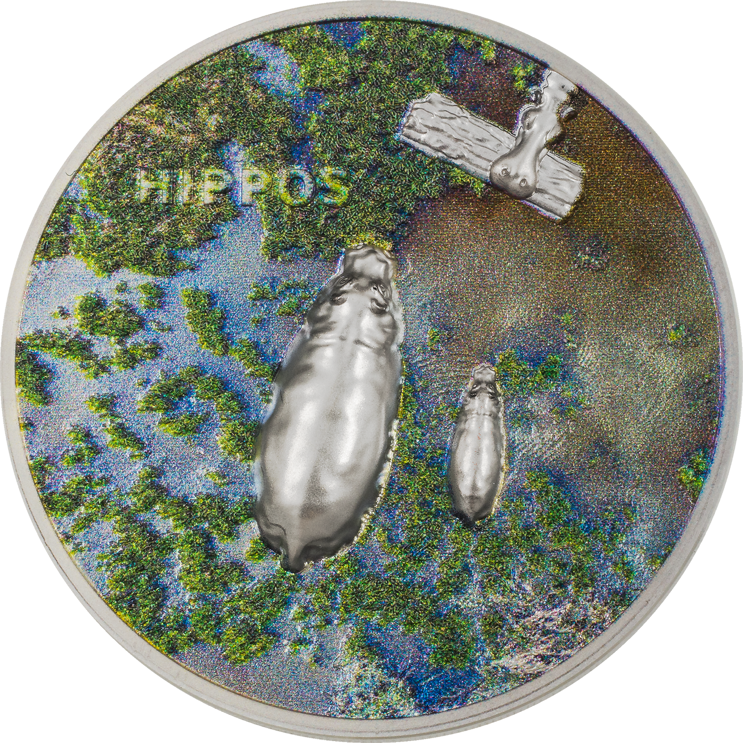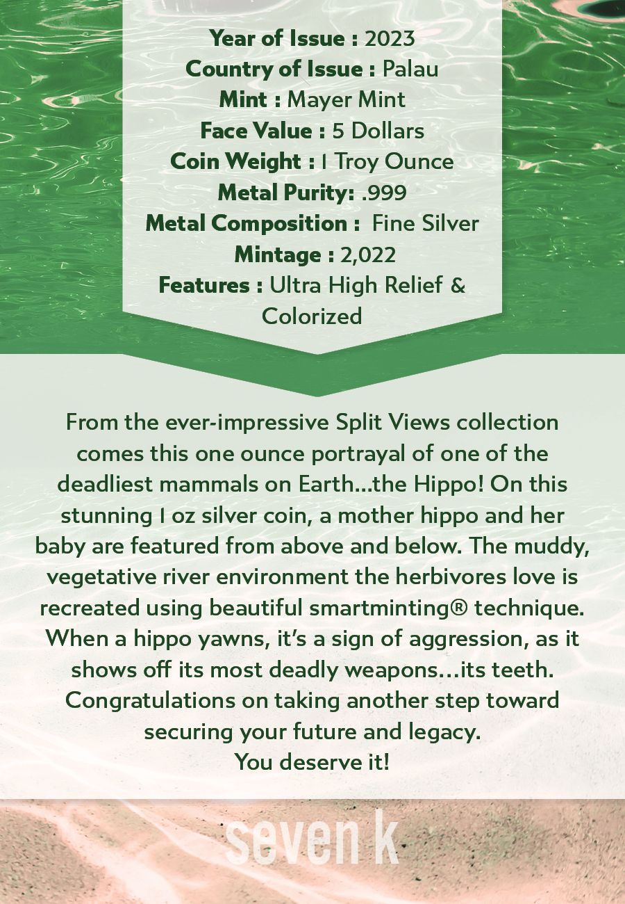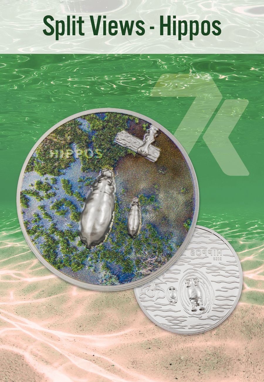 From the ever-impressive Split Views collection comes this one ounce portrayal of one of the deadliest mammals on Earth...the Hippo! On this stunning 1 oz silver coin, a mother hippo and her baby are featured from above and below. The muddy, vegetative river environment the herbivores love is recreated using beautiful smartminting® technique. When a hippo yawns, it’s a sign of aggression, as it shows off its most deadly weapons…its teeth.