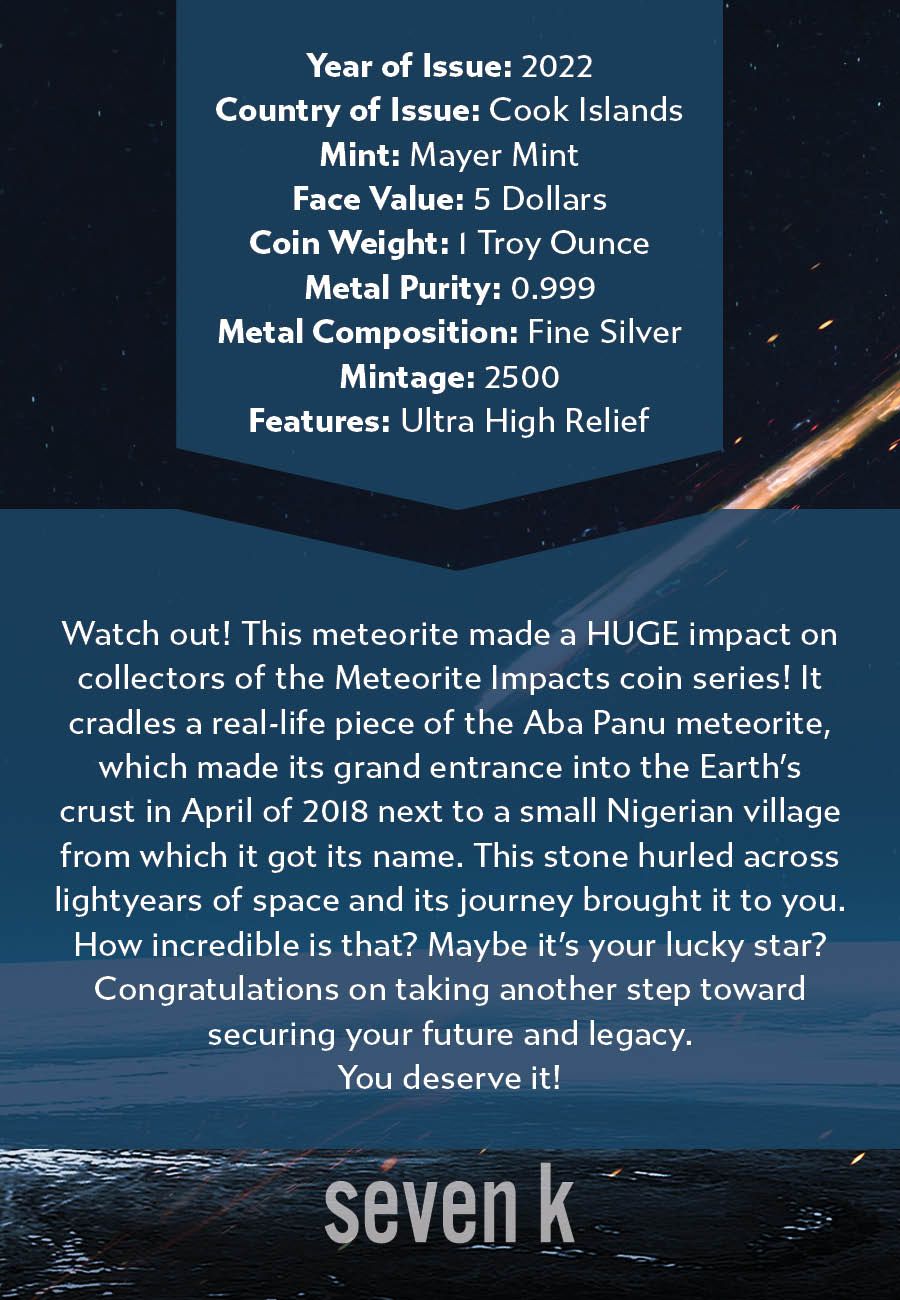 Watch out! This meteorite made a HUGE impact on collectors of the Meteorite Impacts coin series! It cradles a real-life piece of the Aba Panu meteorite, which made its grand entrance into the Earth's crust in April of 2018 next to a small Nigerian village from which it got its name. This stone hurled across lightyears of space and its journey brought it to you. How incredible is that? Maybe it's your lucky star?
