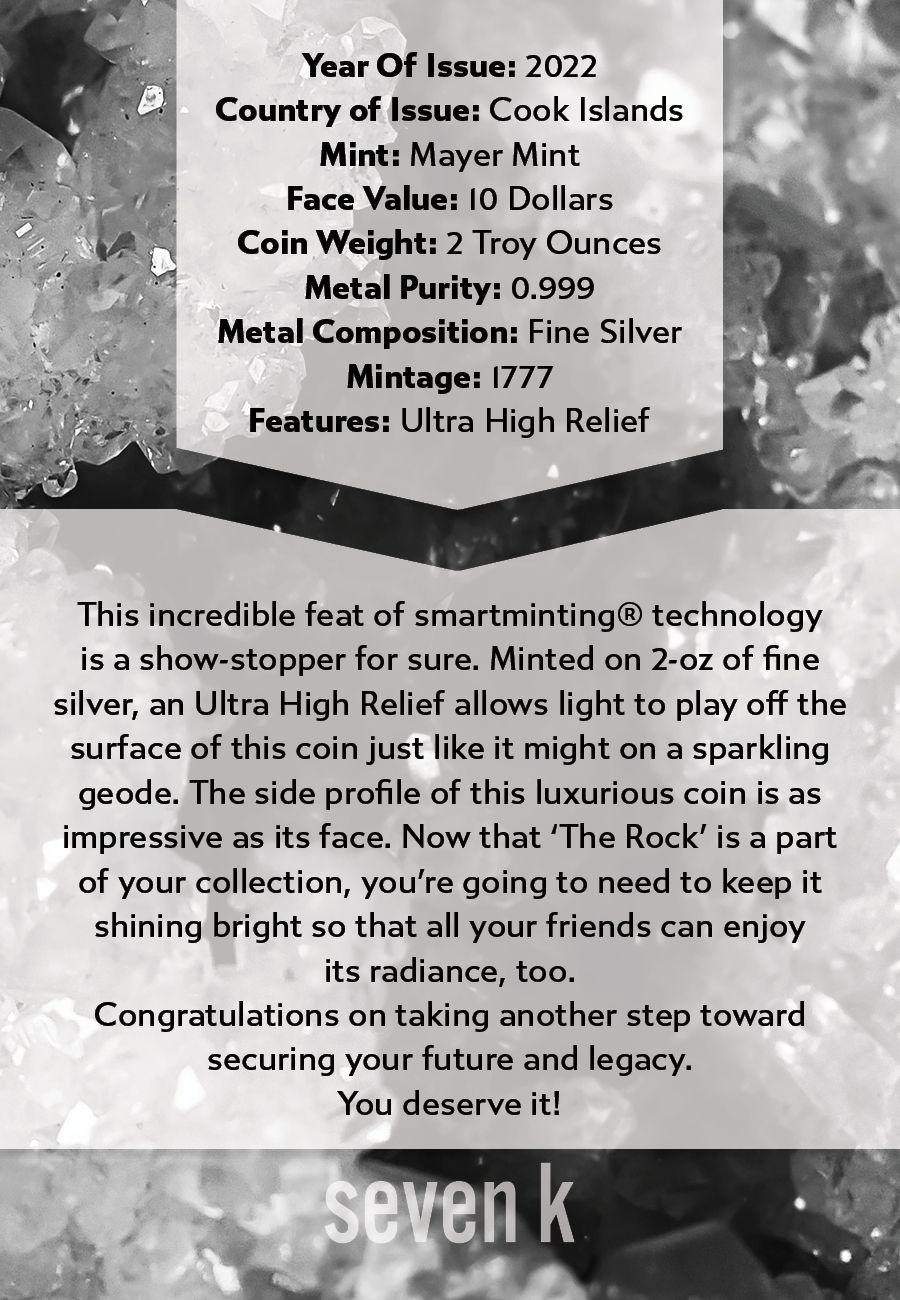 This incredible feat of smartminting® technology is a show-stopper for sure. Minted on 2-oz of fine silver, an Ultra High Relief allows light to play off the surface of this coin just like it might on a sparkling geode. The side profile of this luxurious coin is as impressive as its face. Now that 'The Rock' is a part of your collection, you're going to need to keep it shining bright so that all your friends can enjoy its radiance, too.