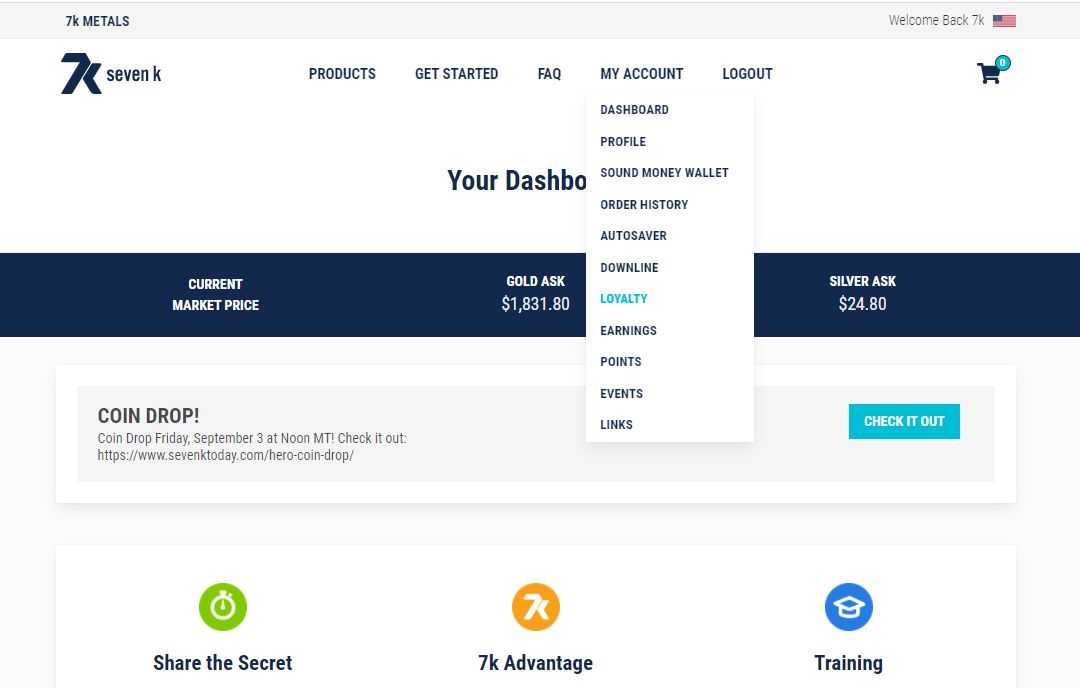 Go to 7kmetals.com and login to your dashboard (see pic below). Hover your mouse over the My Account menu and you'll see the Loyalty section in the list that appears.