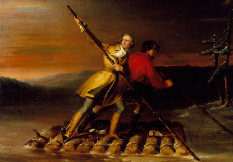 Britain instructed the Virginian Governor, Robert Dinwiddie to send someone to tell the French to get out, and Dinwiddie knew exactly who to send. Little Georgie, only 21 now, who’d been surveying Virginia territory for years, was the obvious pick to make the grueling journey up to Ohio. George was thrilled, he leaped at the chance to show everyone what he was made of. So he and some companions traveled through the winter months, over mountains and through rivers to deliver the Governor’s message.