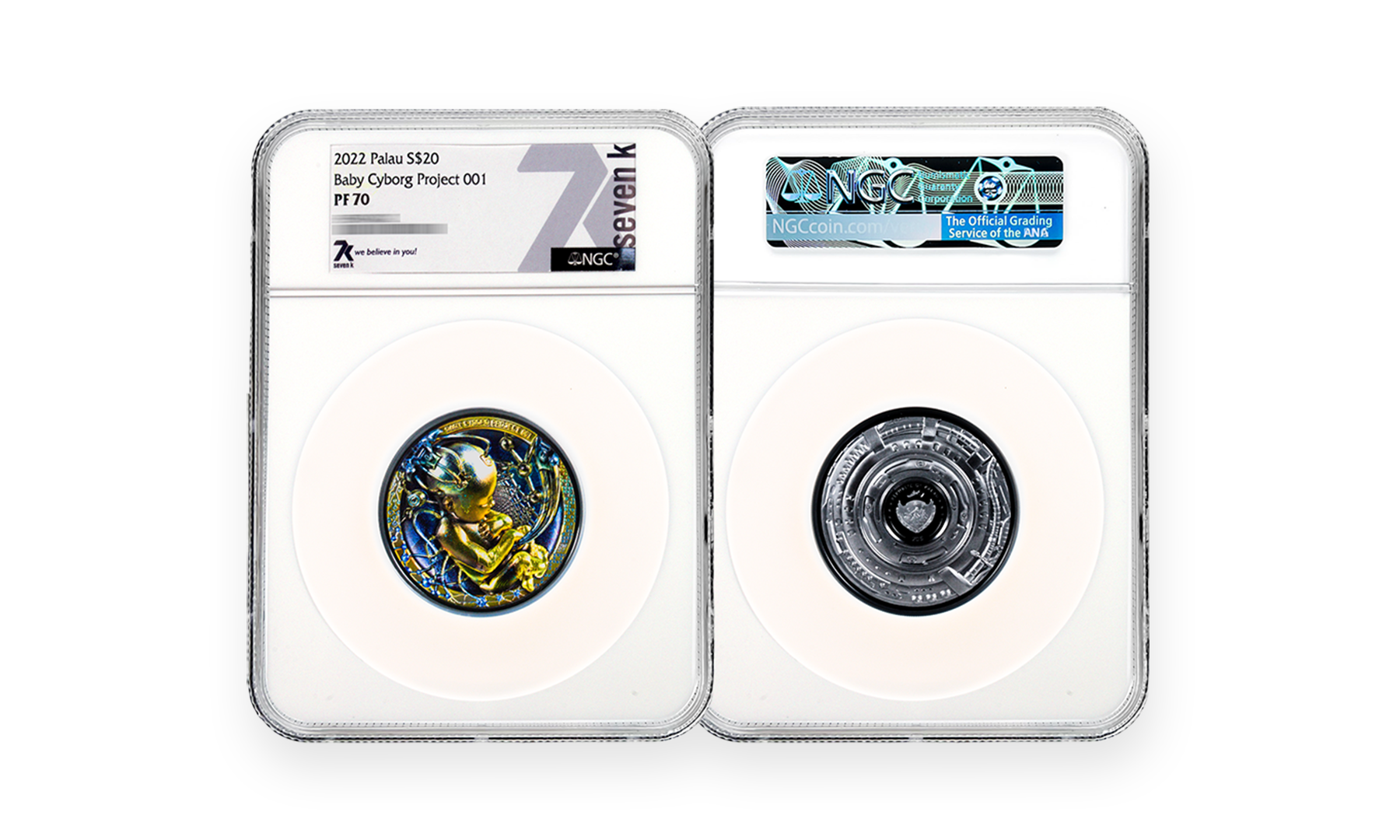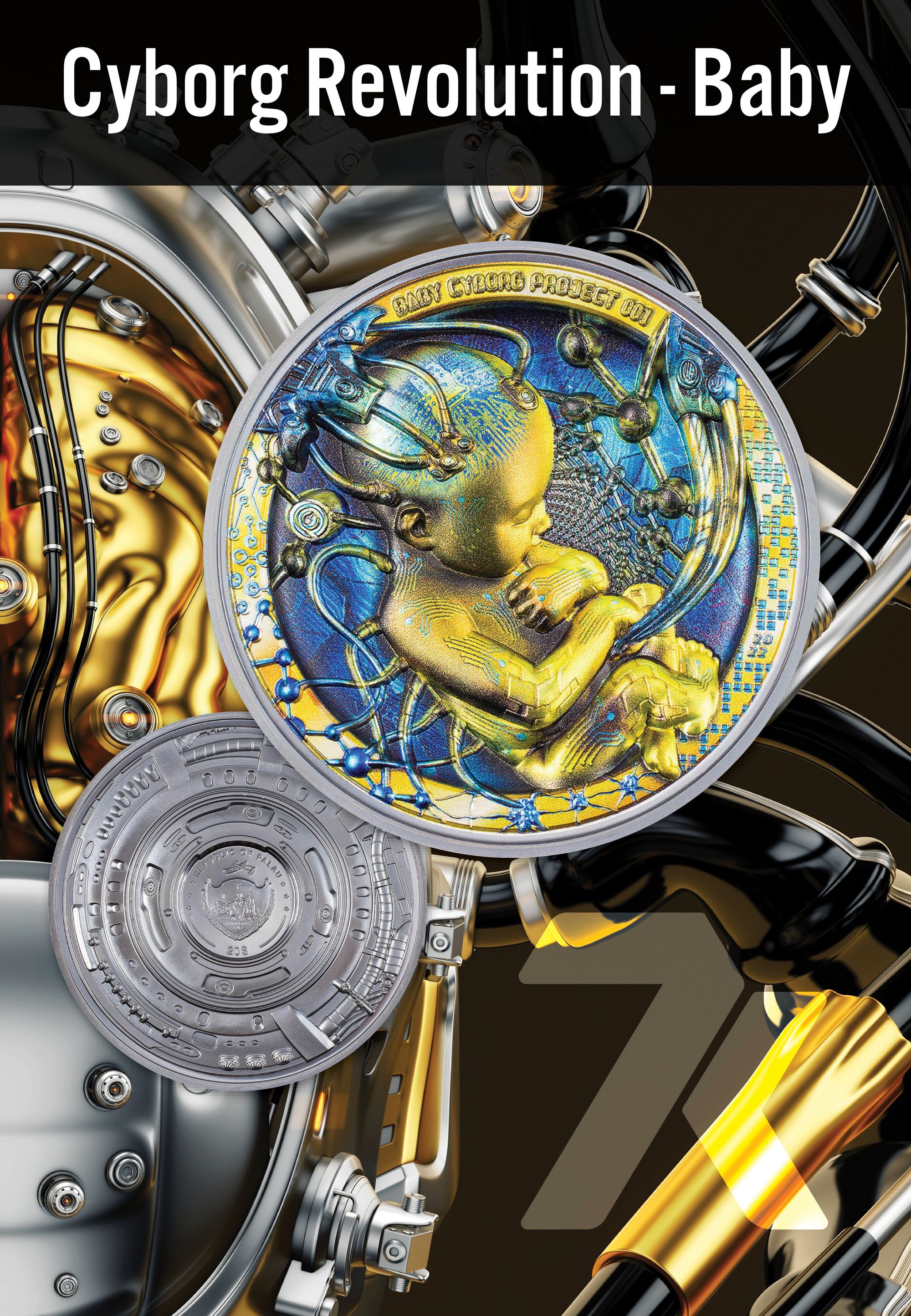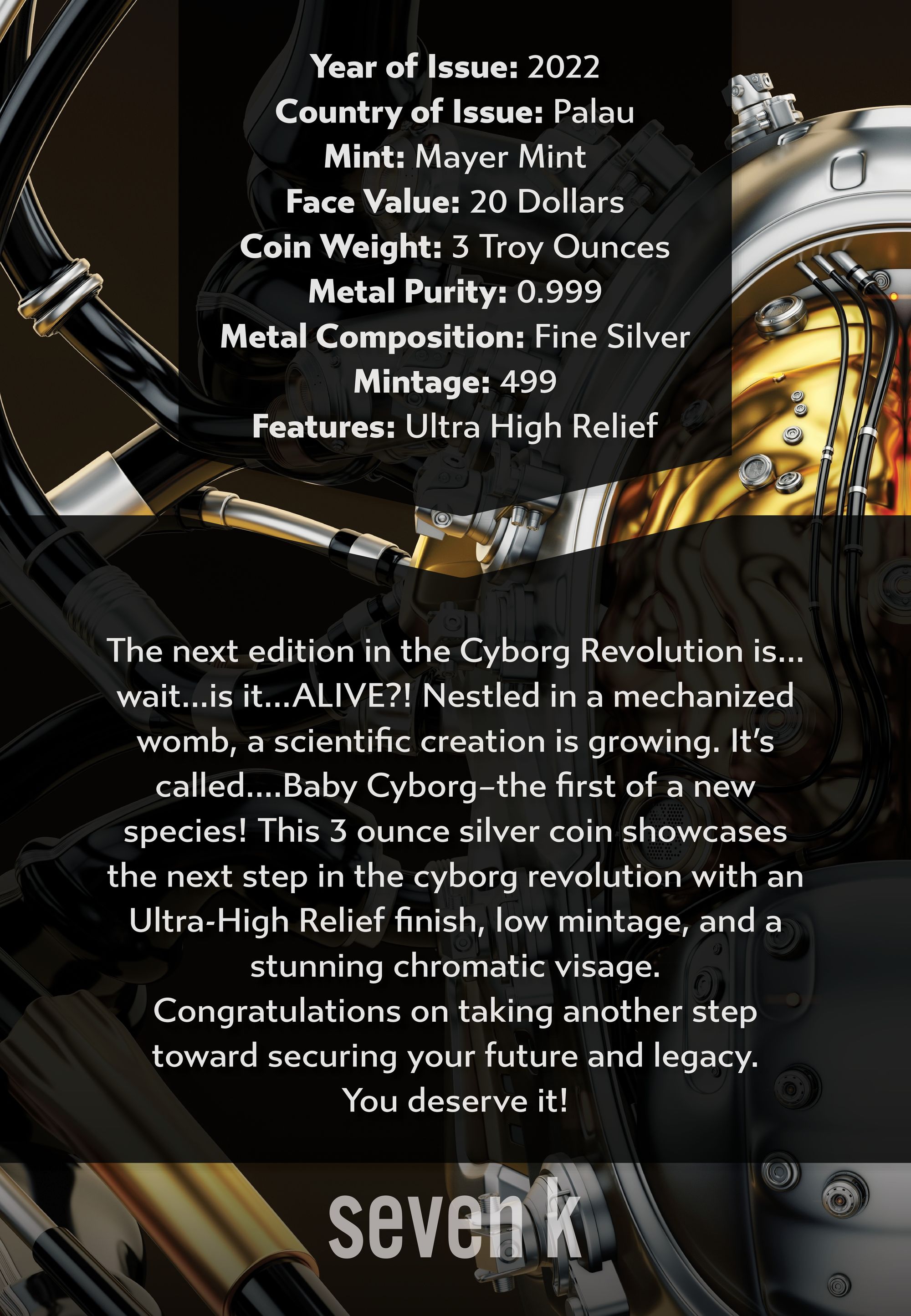 The next edition in the Cyborg Revolution is...wait...is it...ALIVE?! Nestled in a mechanized womb, a scientific creation is growing. It's called....Baby Cyborg–the first of a new species! This 3 ounce silver coin showcases the next step in the cyborg revolution with an Ultra-High Relief finish, low mintage, and a stunning chromatic visage.