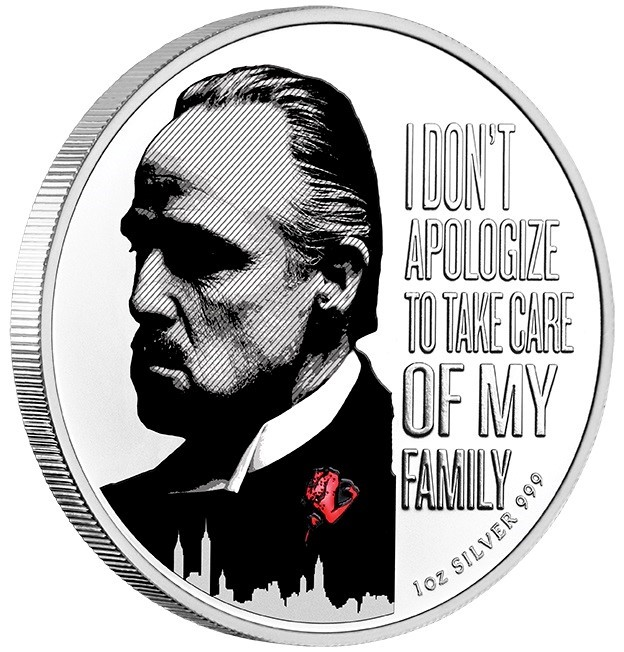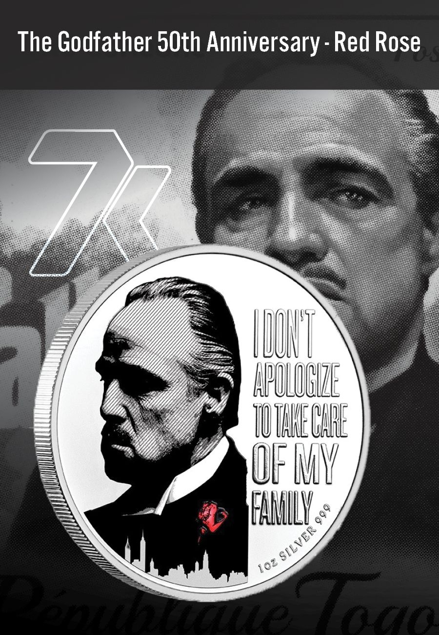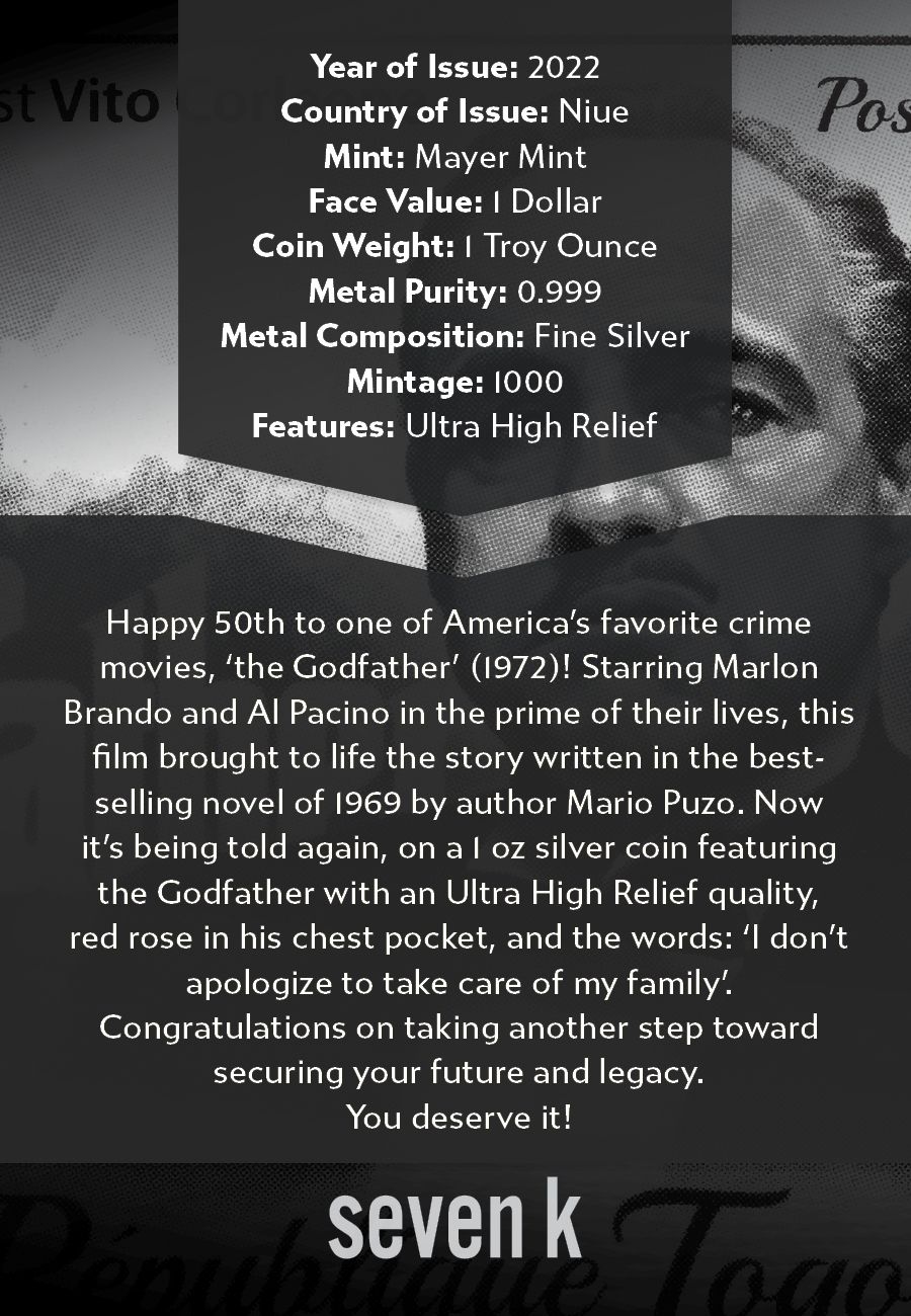 Happy 50th to one of America's favorite crime movies, 'the Godfather' (1972)! Starring Marlon Brando and Al Pacino in the prime of their lives, this film brought to life the story written in the best-selling novel of 1969 by author Mario Puzo. Now it's being told again, on a 1 oz silver coin featuring the Godfather with an Ultra High Relief quality, red rose in his chest pocket, and the words: 'I don't apologize to take care of my family'.