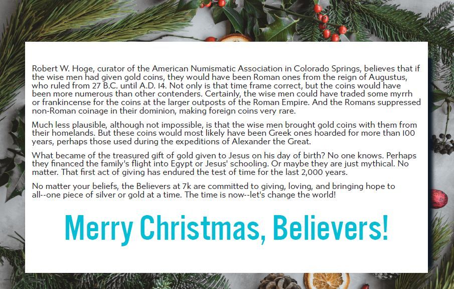 No matter your beliefs, the Believers at 7k are committed to giving, loving, and bringing hope to all--one piece of silver or gold at a time. The time is now--let's change the world!