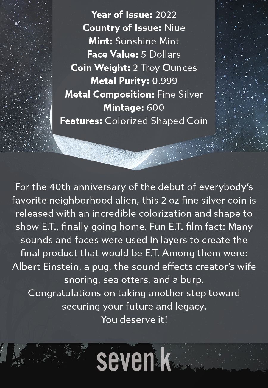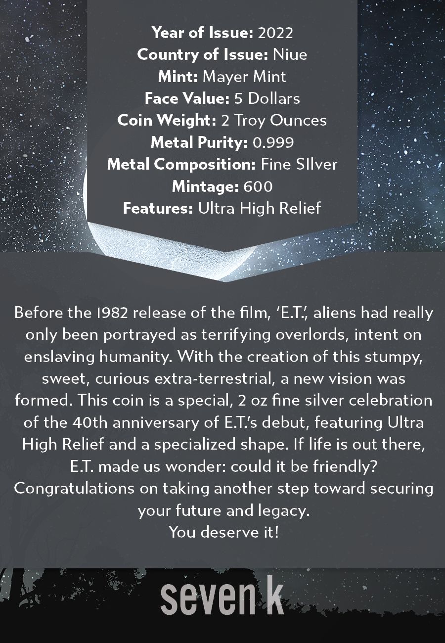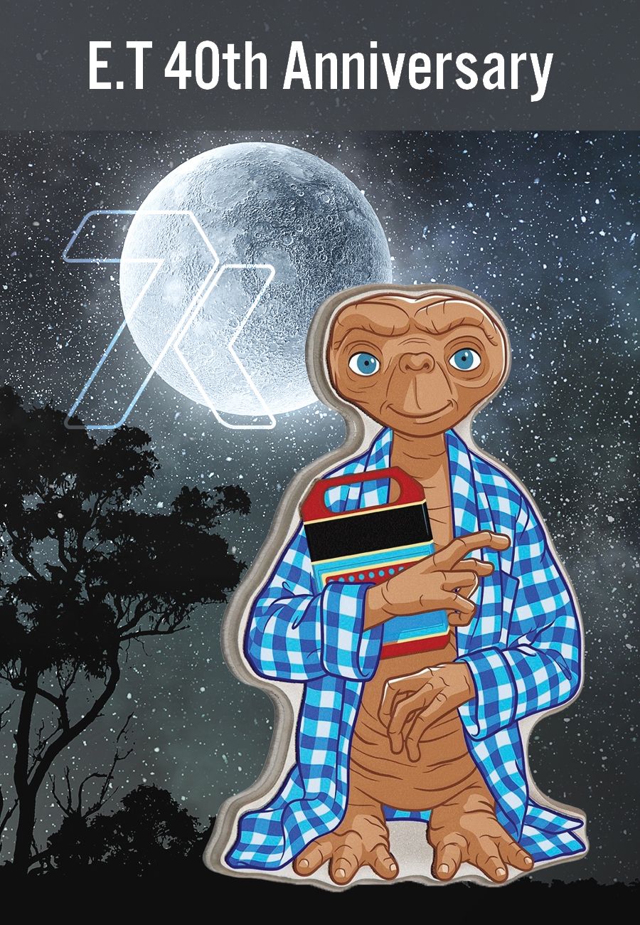 Before the 1982 release of the film, 'E.T.', aliens had really only been portrayed as terrifying overlords, intent on enslaving humanity. With the creation of this stumpy, sweet, curious extra-terrestrial, a new vision was formed. This coin is a special, 2 oz fine silver celebration of the 40th anniversary of E.T.'s debut, featuring Ultra High Relief and a specialized shape. If life is out there, E.T. made us wonder: could it be friendly?