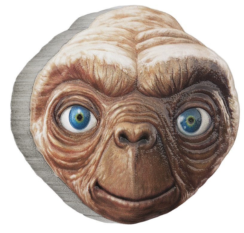 For the 40th anniversary of the debut of everybody's favorite neighborhood alien, this 2 oz fine silver coin is released with an incredible colorization and shape to show E.T., finally going home. Fun E.T. film fact: Many sounds and faces were used in layers to create the final product that would be E.T. Among them were: Albert Einstein, a pug, the sound effects creator's wife snoring, sea otters, and a burp.