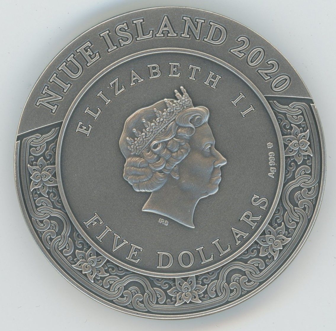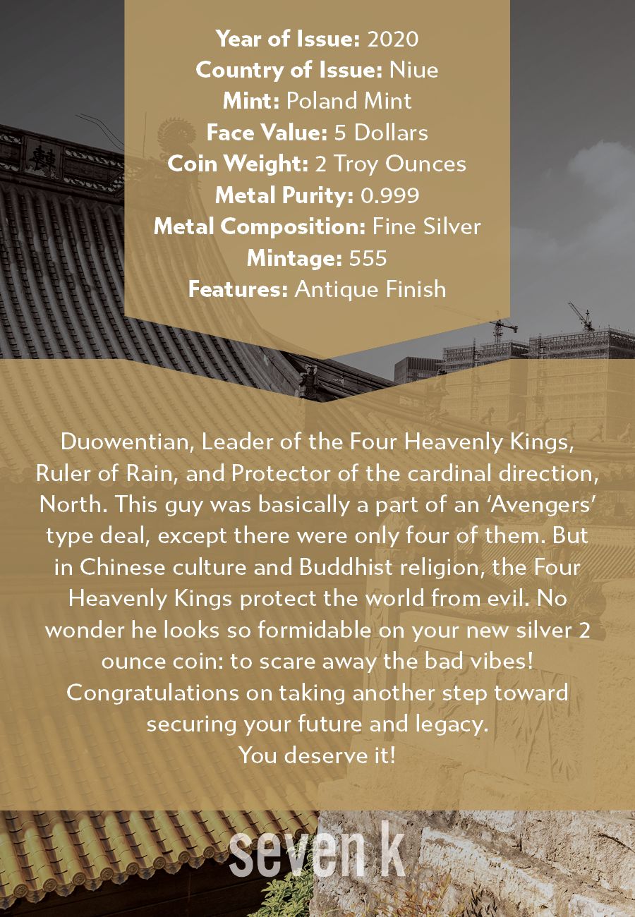 Duowentian, Leader of the Four Heavenly Kings, Ruler of Rain, and Protector of the cardinal direction, North. This guy was basically a part of an 'Avengers' type deal, except there were only four of them. But in Chinese culture and Buddhist religion, the Four Heavenly Kings protect the world from evil. No wonder he looks so formidable on your new silver 2 ounce coin: to scare away the bad vibes!