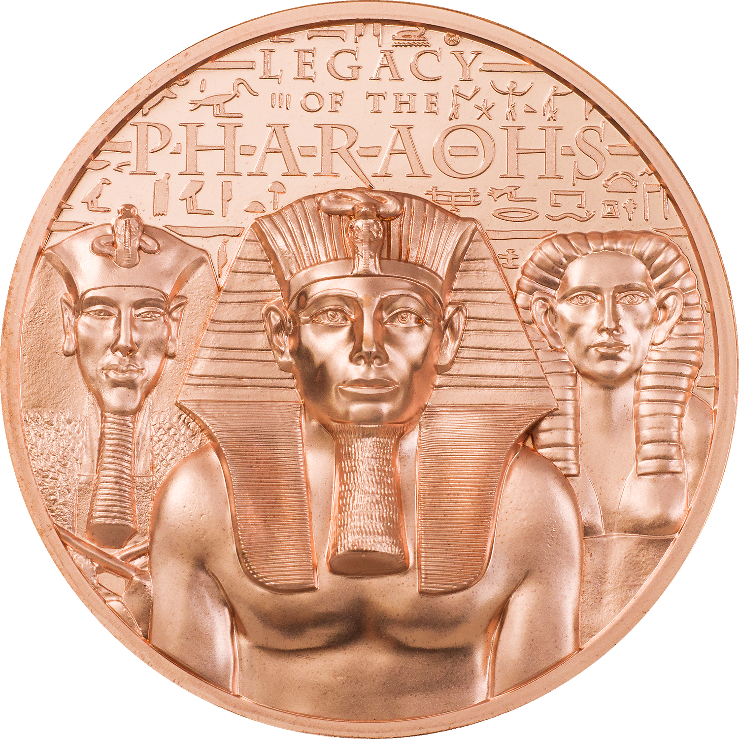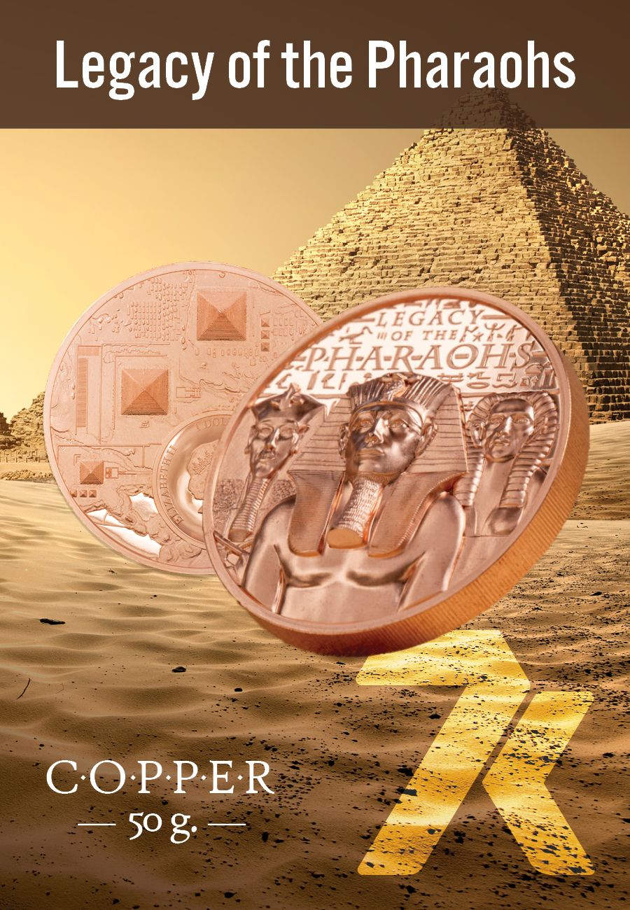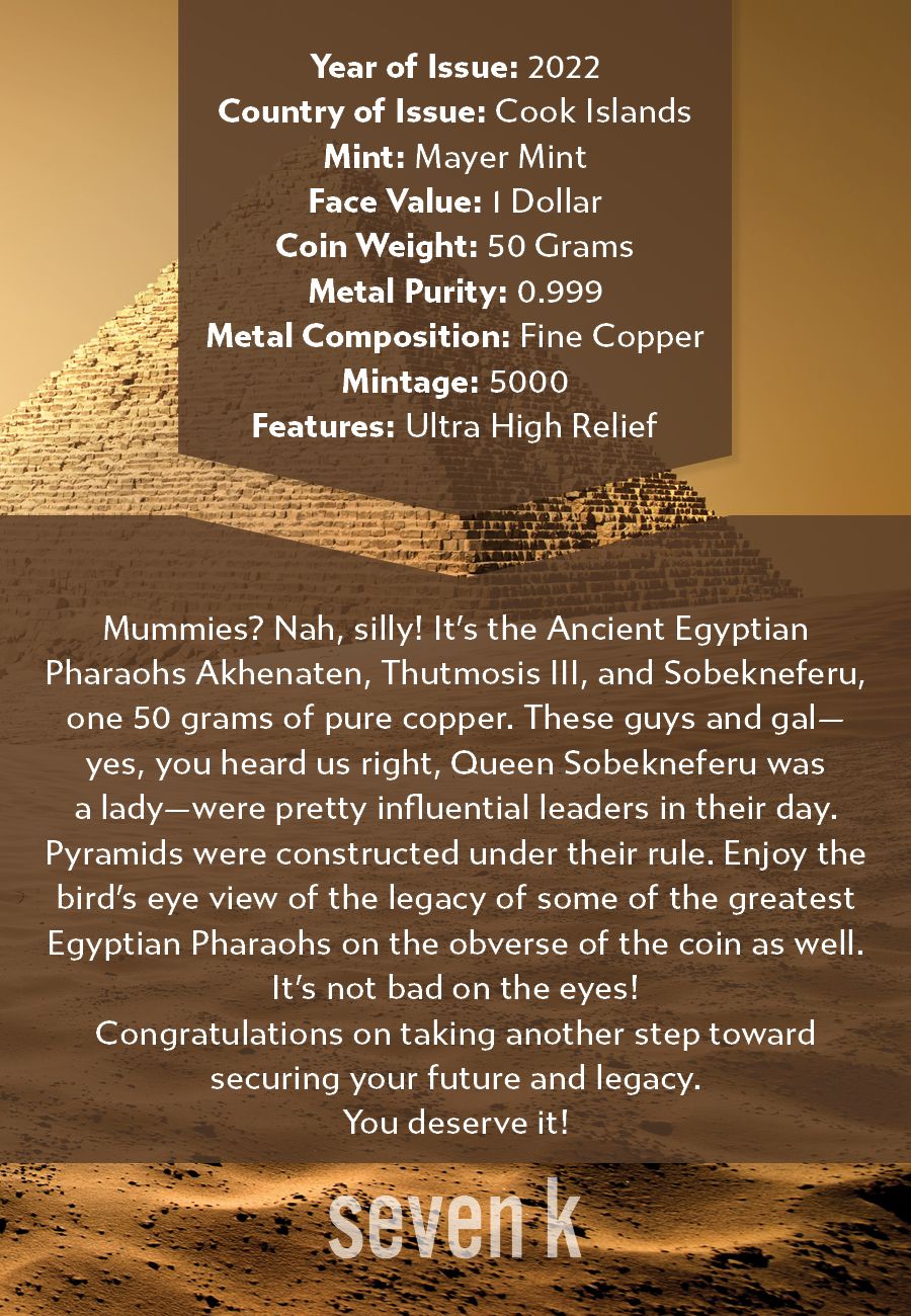 Mummies? Nah, silly! It’s the Ancient Egyptian Pharaohs Akhenaten, Thutmosis III, and Sobekneferu, one 50 grams of pure copper. These guys and gal—yes, you heard us right, Queen Sobekneferu was a lady—were pretty influential leaders in their day. Pyramids were constructed under their rule. Enjoy the bird’s eye view of the legacy of some of the greatest Egyptian Pharaohs on the obverse of the coin as well. It's not bad on the eyes!