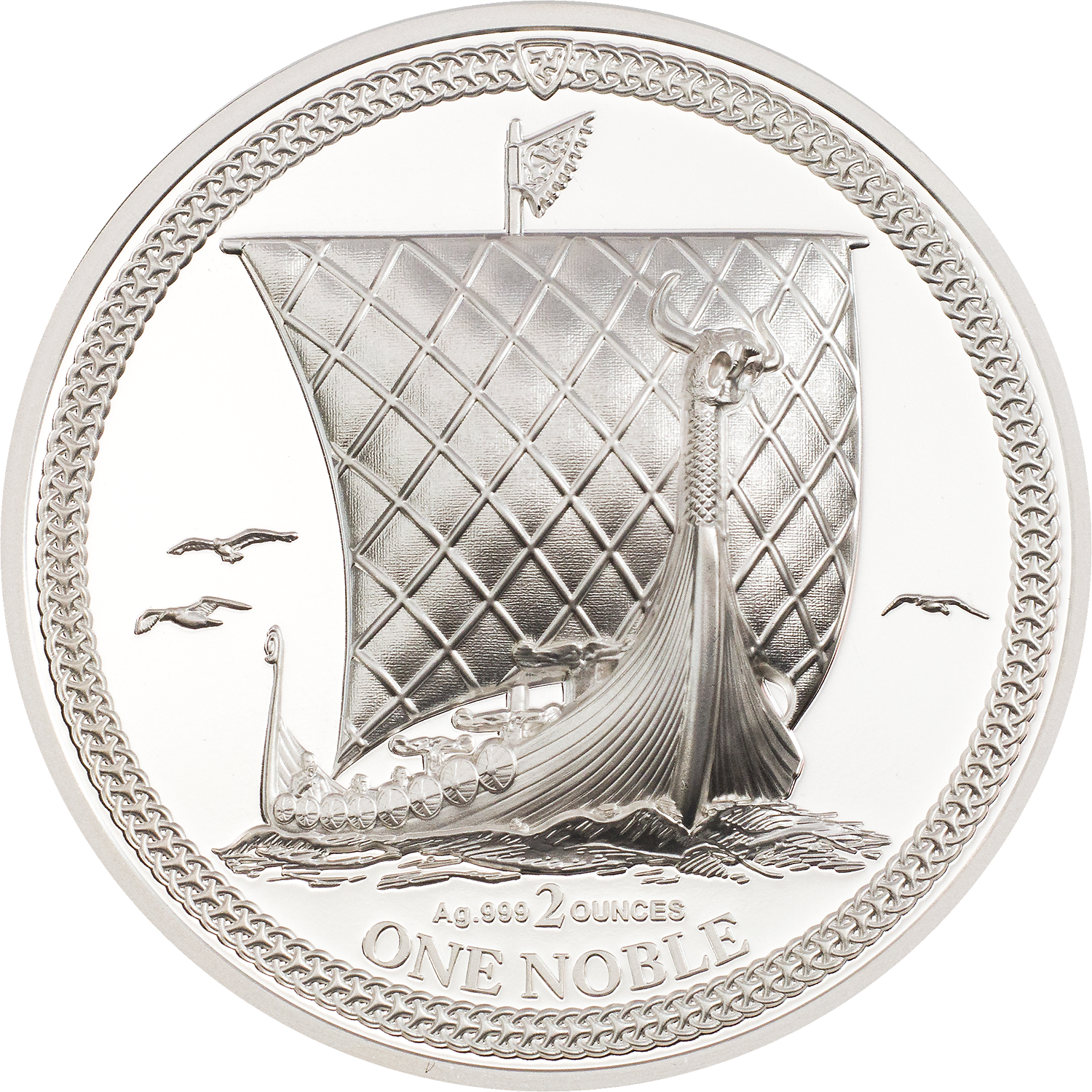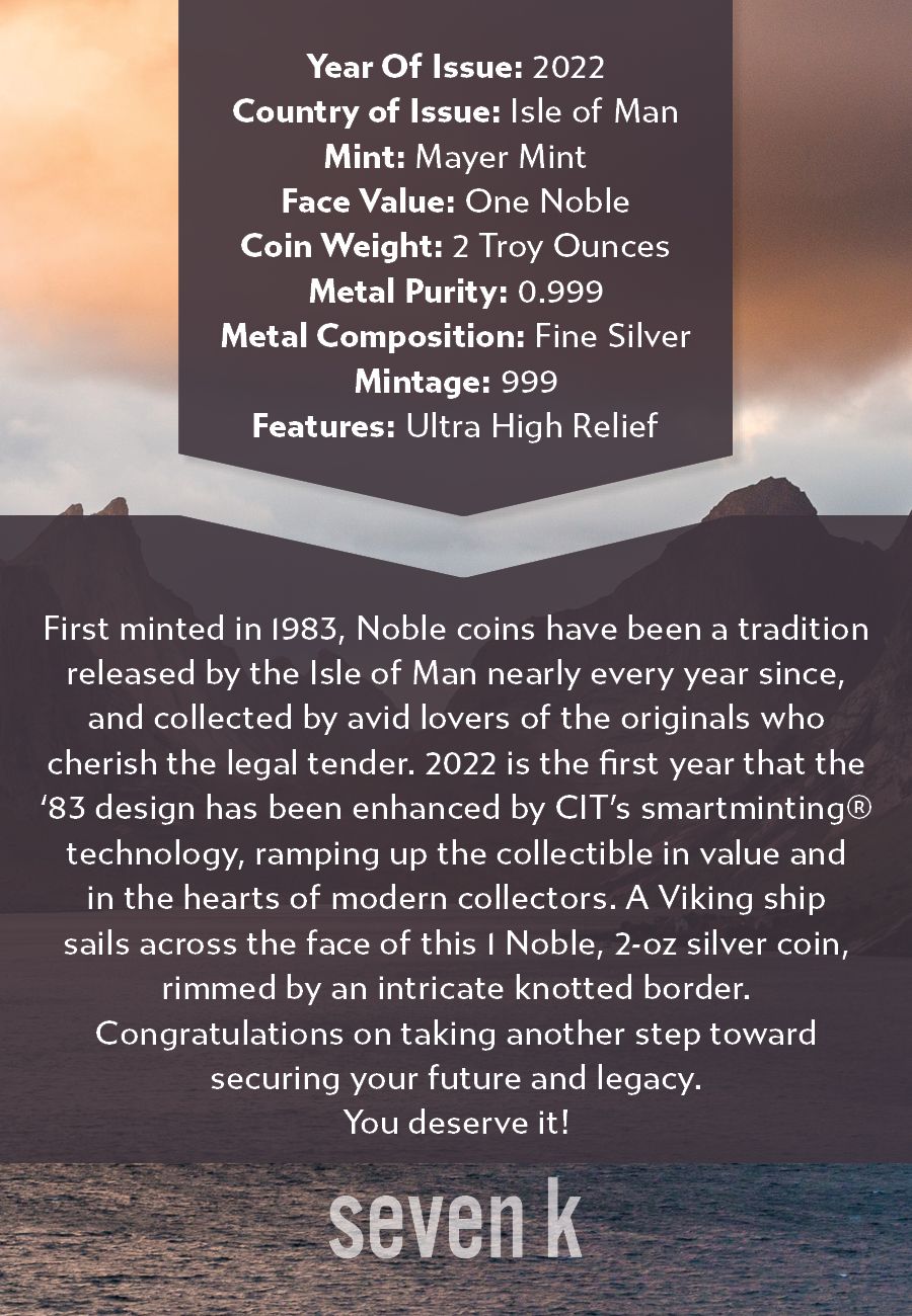 First minted in 1983, Noble coins have been a tradition released by the Isle of Man nearly every year since, and collected by avid lovers of the originals who cherish the legal tender. 2022 is the first year that the '83 design has been enhanced by CIT's smartminting® technology, ramping up the collectible in value and in the hearts of modern collectors. A Viking ship sails across the face of this 1 Noble, 2-oz silver coin, rimmed by an intricate knotted border.