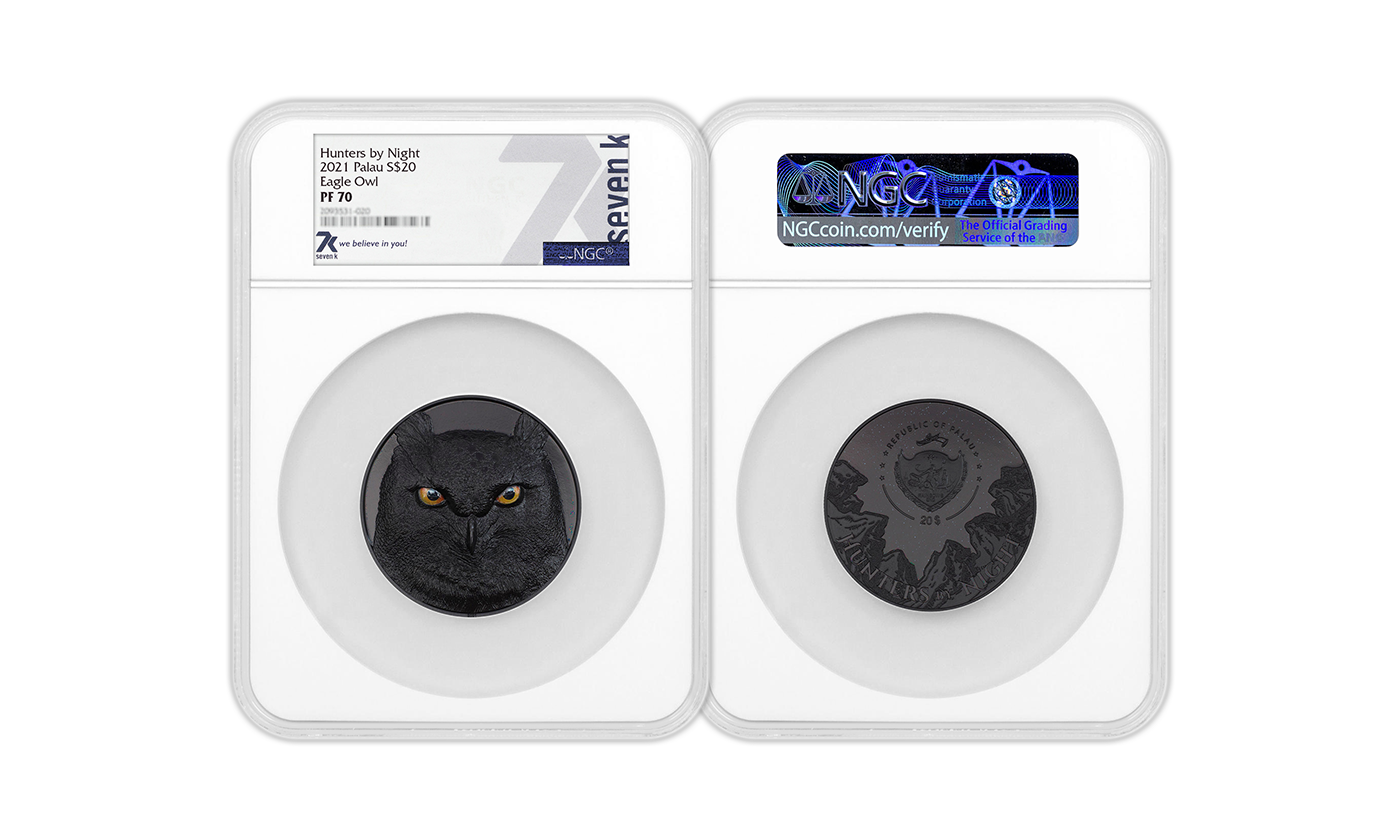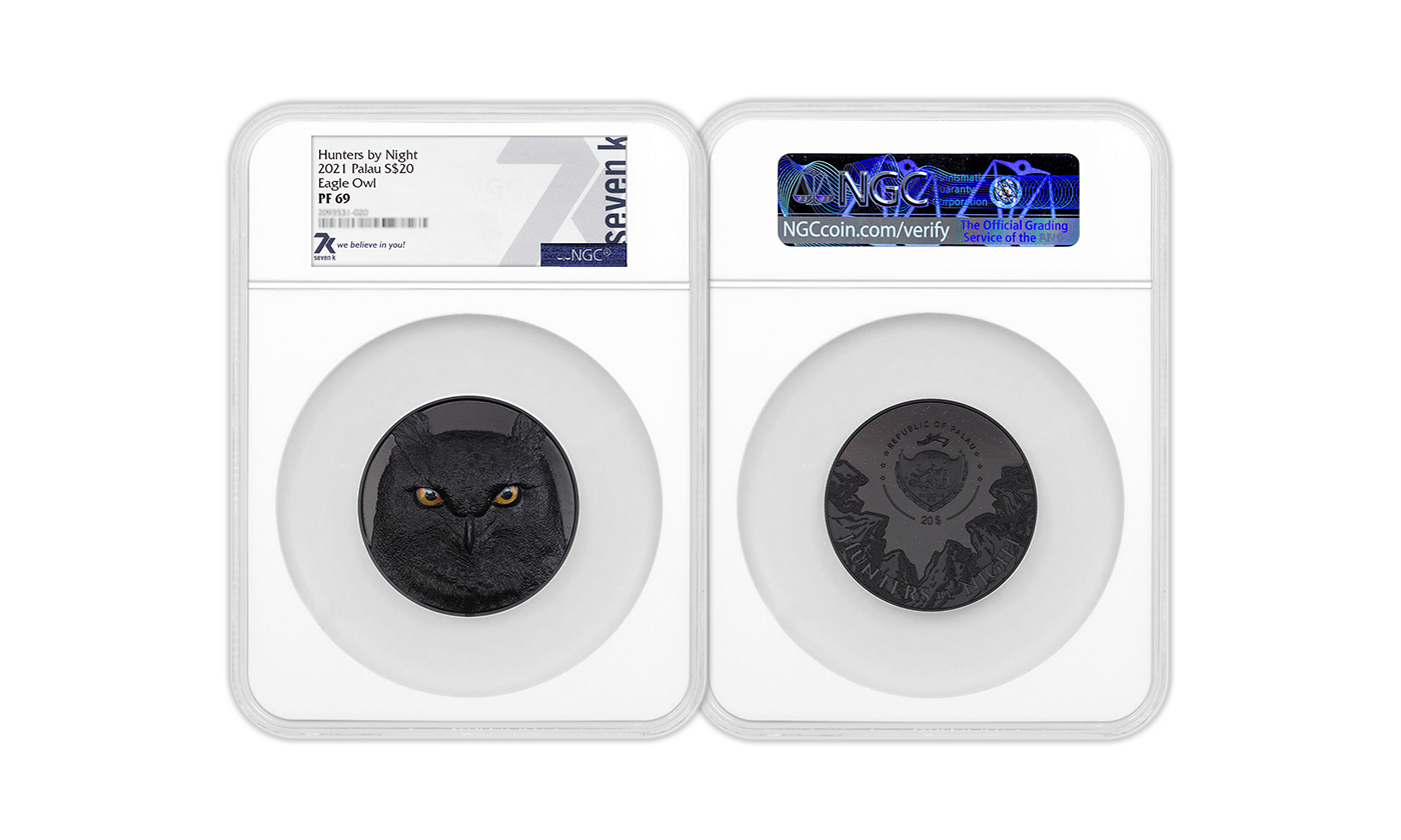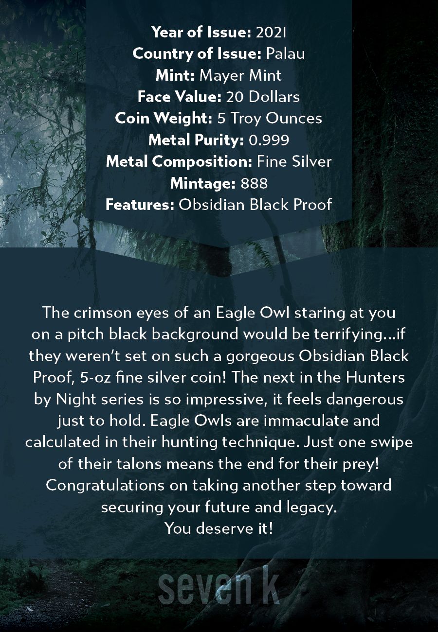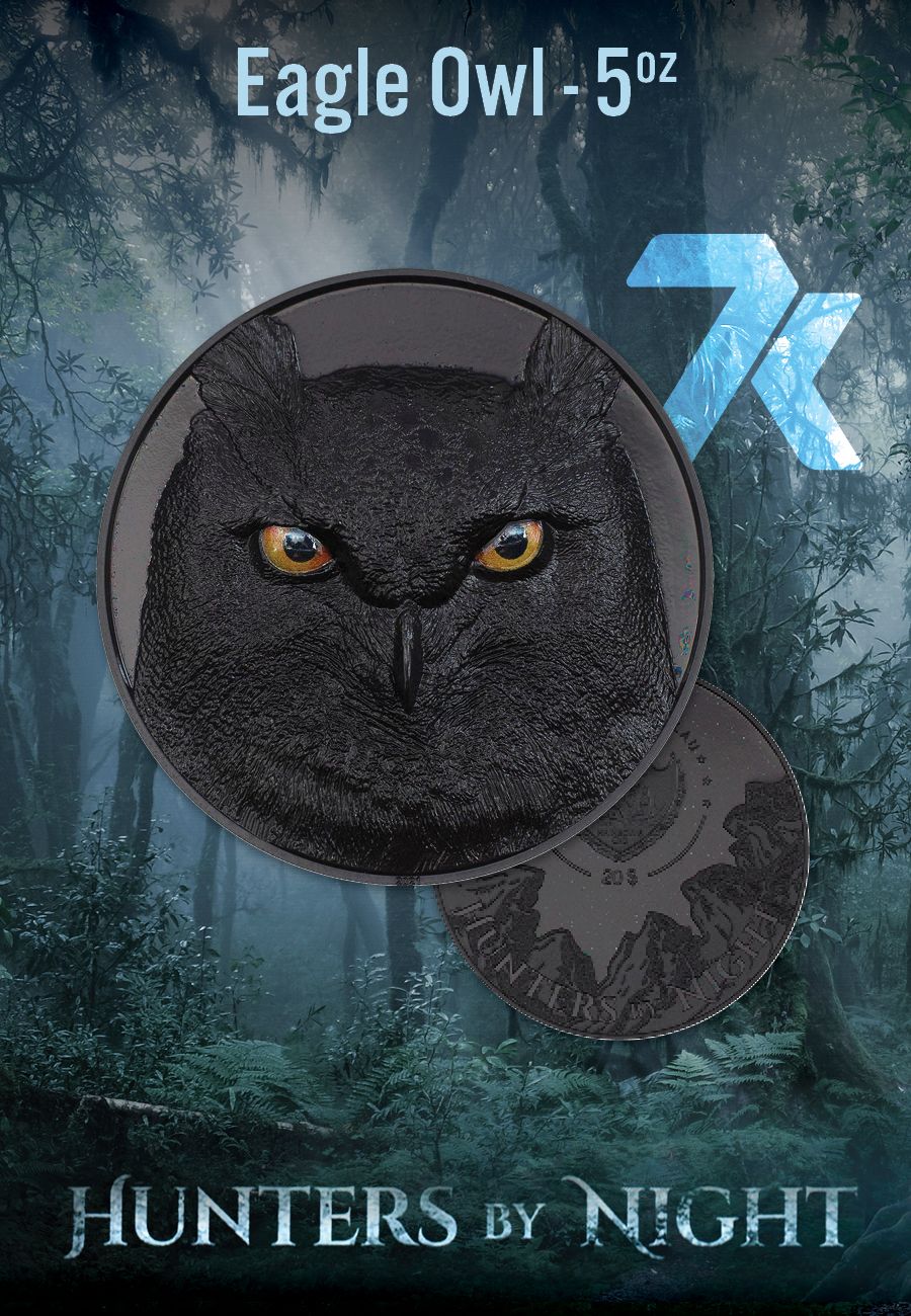 The crimson eyes of an Eagle Owl staring at you on a pitch black background would be terrifying...if they weren't set on such a gorgeous Obsidian Black Proof, 5-oz fine silver coin! The next in the Hunters by Night series is so impressive, it feels dangerous just to hold. Eagle Owls are immaculate and calculated in their hunting technique. Just one swipe of their talons means the end for their prey!