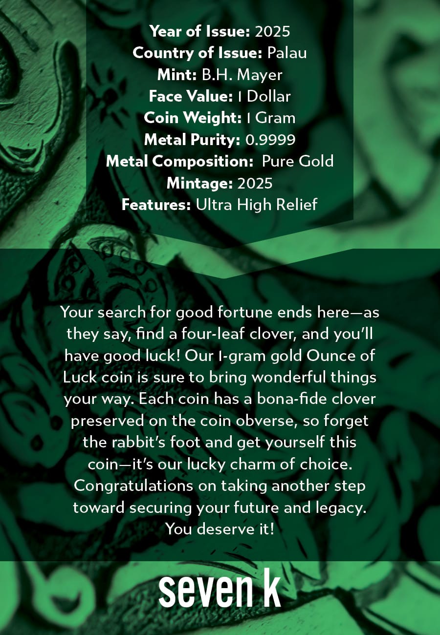 Your search for good fortune ends here—as they say, find a four-leaf clover, and you’ll have good luck! Our 1-gram gold Ounce of Luck coin is sure to bring wonderful things your way. Each coin has a bona-fide clover preserved on the coin obverse, so forget the rabbit’s foot and get yourself this coin—it’s our lucky charm of choice. Congratulations on taking another step toward securing your future and legacy. You deserve it!