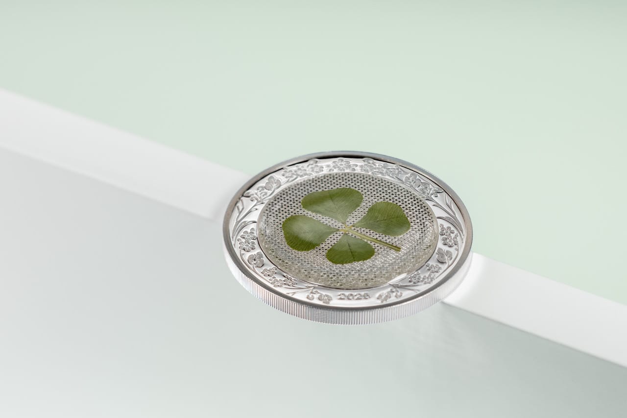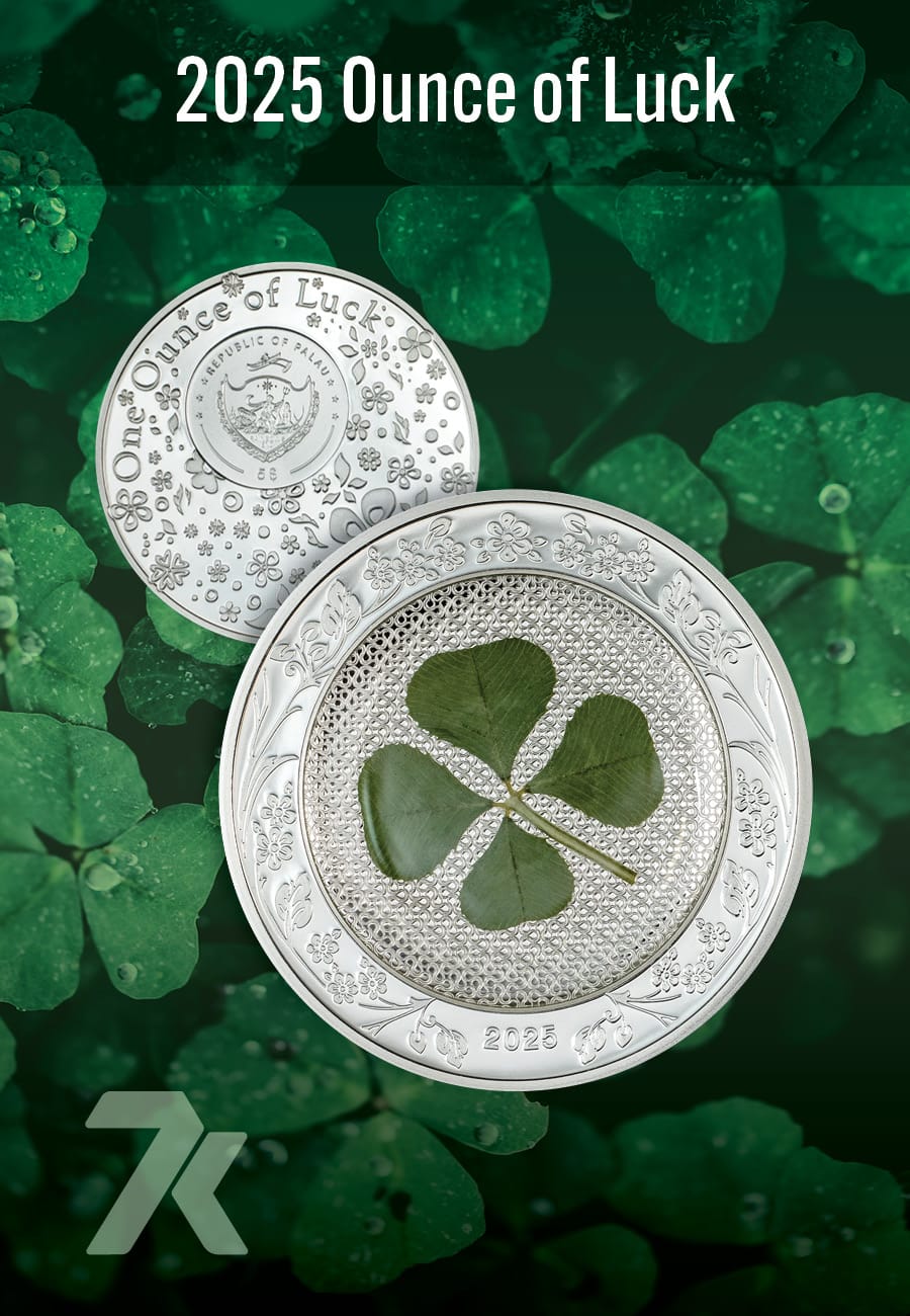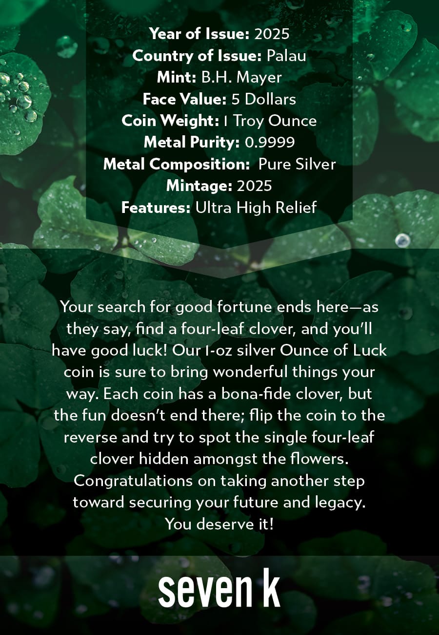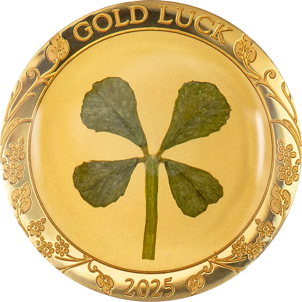 Your search for good fortune ends here—as they say, find a four-leaf clover, and you’ll have good luck! Our 1-oz silver Ounce of Luck coin is sure to bring wonderful things your way. Each coin has a bona-fide clover, but the fun doesn’t end there; flip the coin to the obverse and try to spot the single four-leaf clover hidden amongst the flowers.