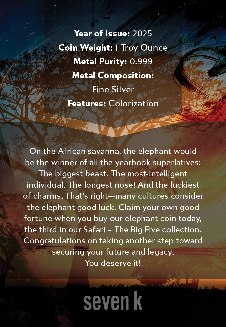 On the African savanna, the elephant would be the winner of all the yearbook superlatives: The biggest beast. The most-intelligent individual. The longest nose! And the luckiest of charms. That’s right—many cultures consider the elephant good luck. Claim your own good fortune when you buy our elephant coin today, the third in our Safari Big Five collection.
