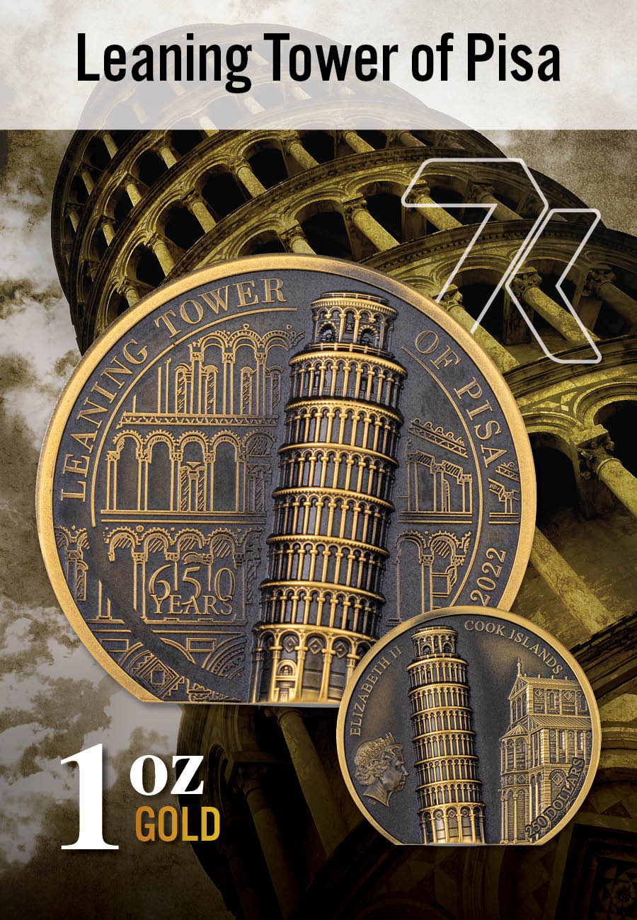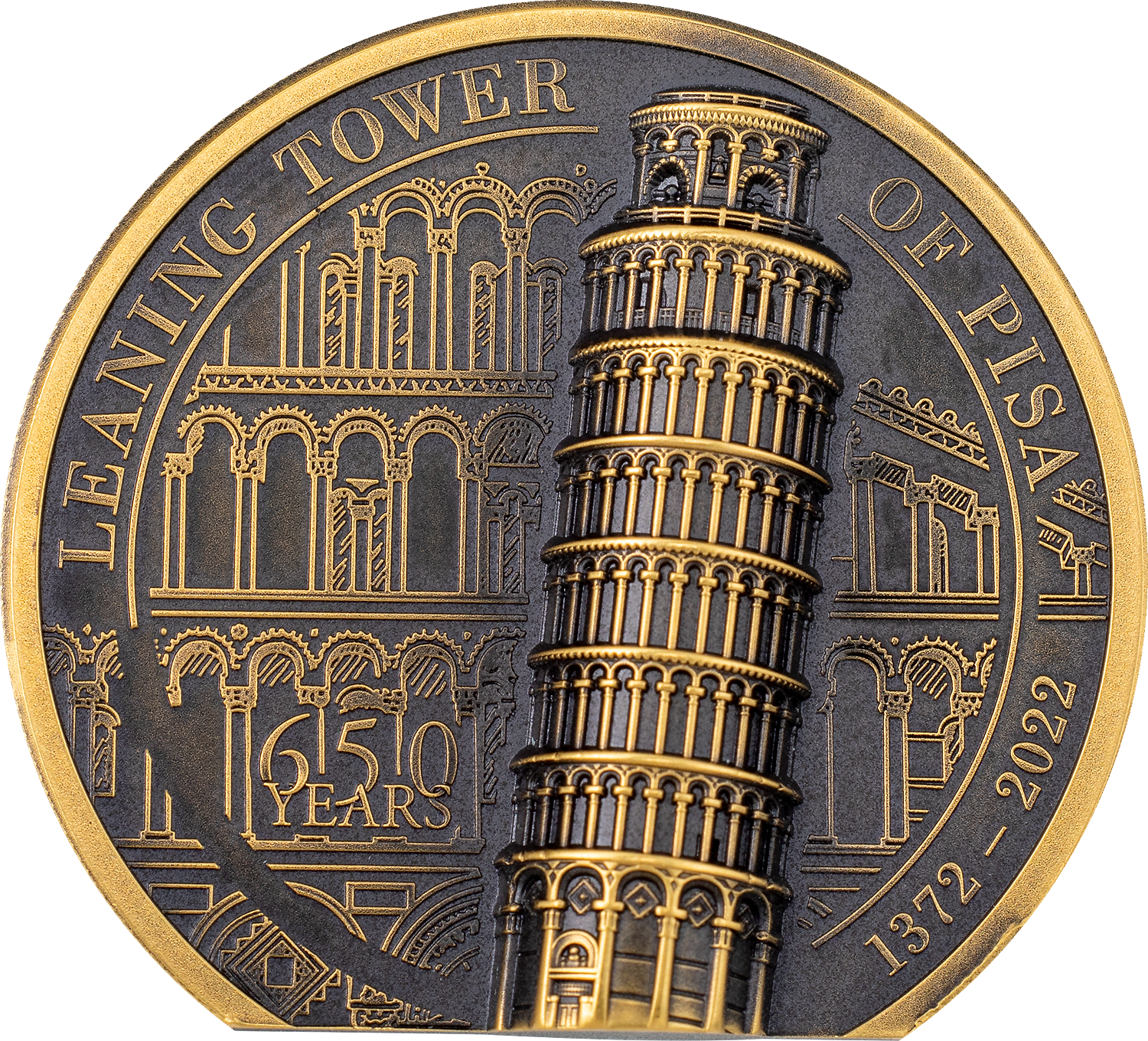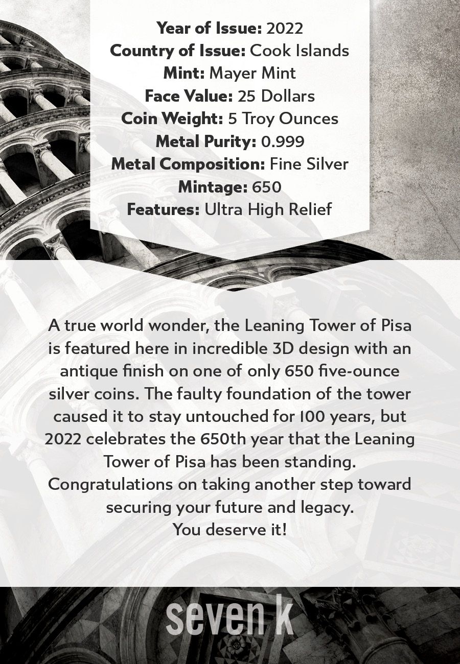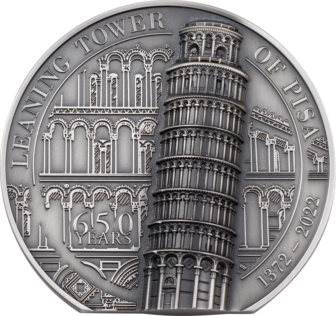 A true world wonder, the Leaning Tower of Pisa is featured here in incredible 3D design with an antique finish on one of only 650 five-ounce silver coins. The faulty foundation of the tower caused it to stay untouched for 100 years, but 2022 celebrates the 650th year that the Leaning Tower of Pisa has been standing.