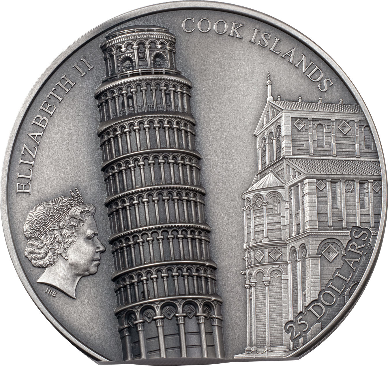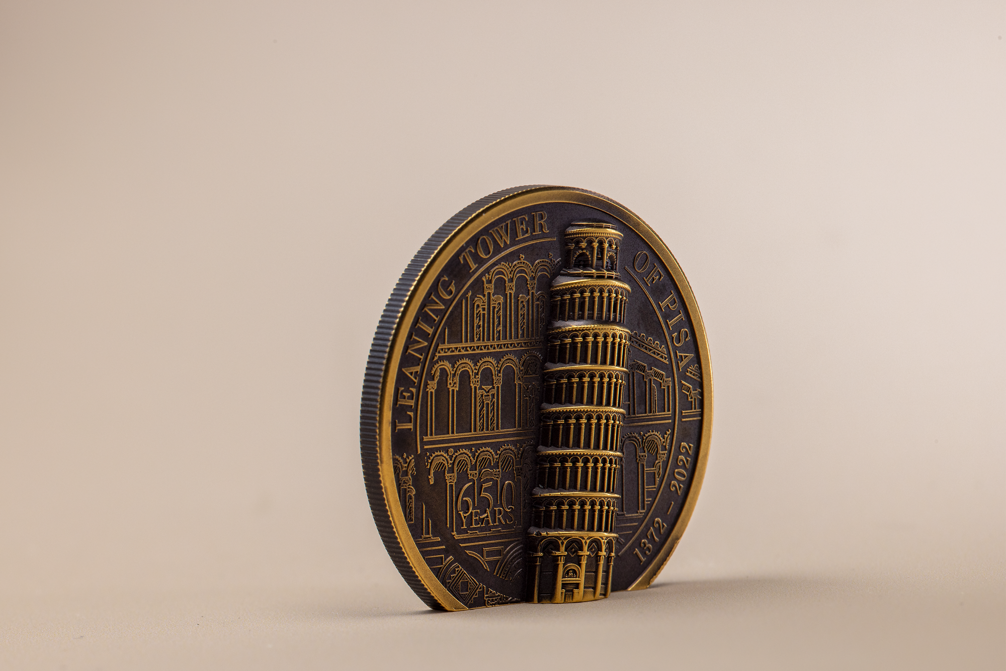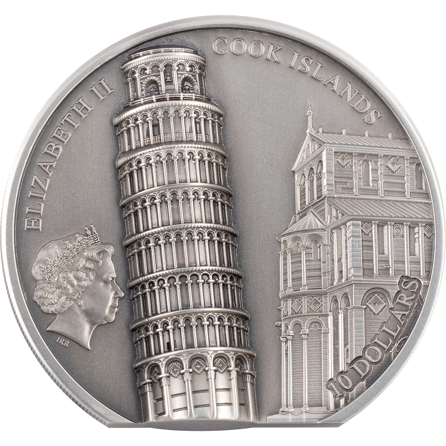 A true world wonder, the Leaning Tower of Pisa is featured here in incredible 3D design with an antique finish on one of only 650 five-ounce silver coins. The faulty foundation of the tower caused it to stay untouched for 100 years, but 2022 celebrates the 650th year that the Leaning Tower of Pisa has been standing.