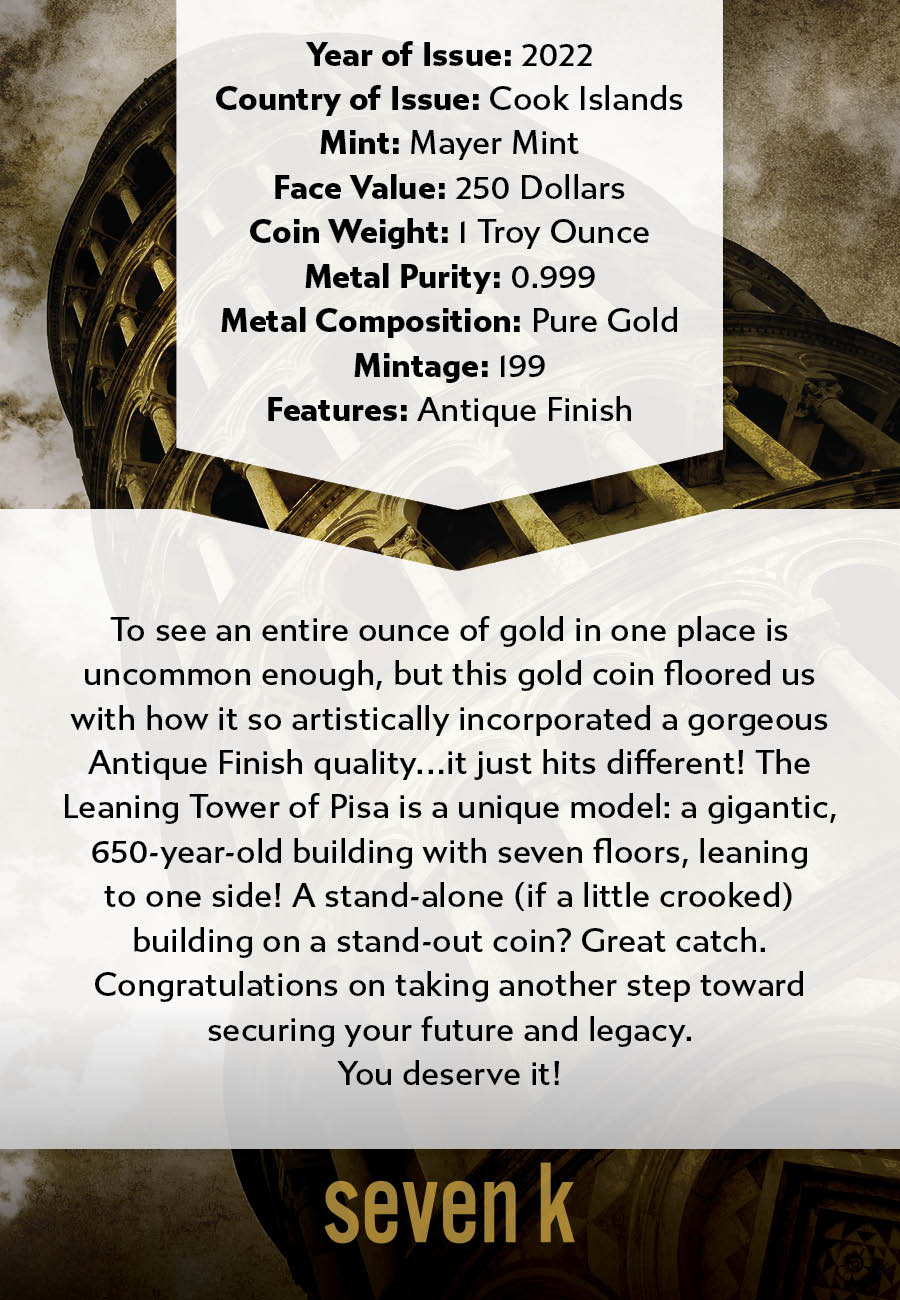 To see an entire ounce of gold in one place is uncommon enough, but this gold coin floored us with how it so artistically incorporated a gorgeous Antique Finish quality…it just hits different! The Leaning Tower of Pisa is a unique model: a gigantic, 650-year-old building with seven floors, leaning to one side! A stand-alone (if a little crooked) building on a stand-out coin? Great catch.
