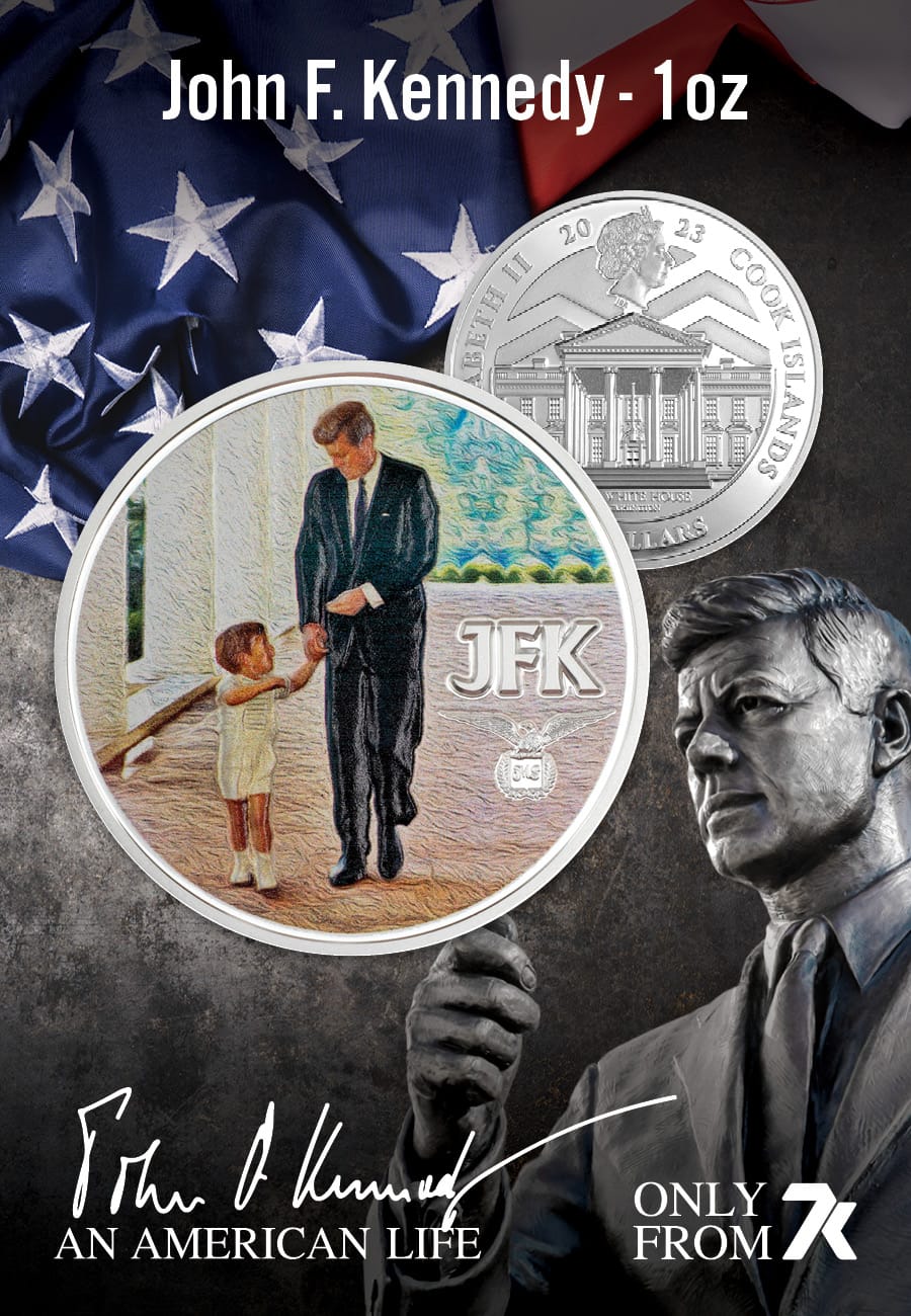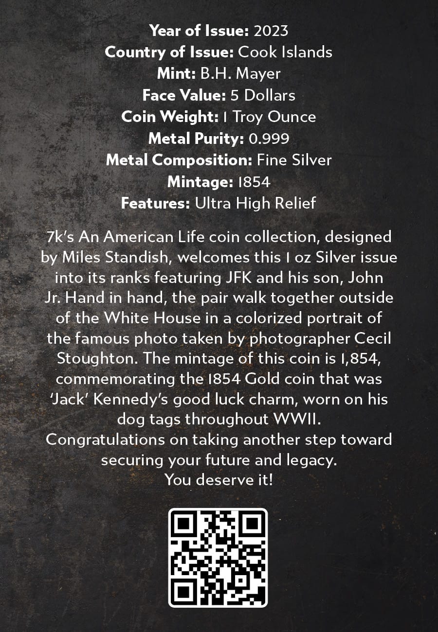 7k’s An American Life coin collection, designed by Miles Standish, welcomes this 1 oz Silver issue into its ranks featuring JFK and his son, John Jr. Hand in hand, the pair walk together outside of the White House in a colorized portrait of the famous photo taken by photographer Cecil Stoughton. The mintage of this coin is 1,854, commemorating the 1854 Gold coin that was ‘Jack’ Kennedy’s good luck charm, worn on his dog tags throughout WWII.