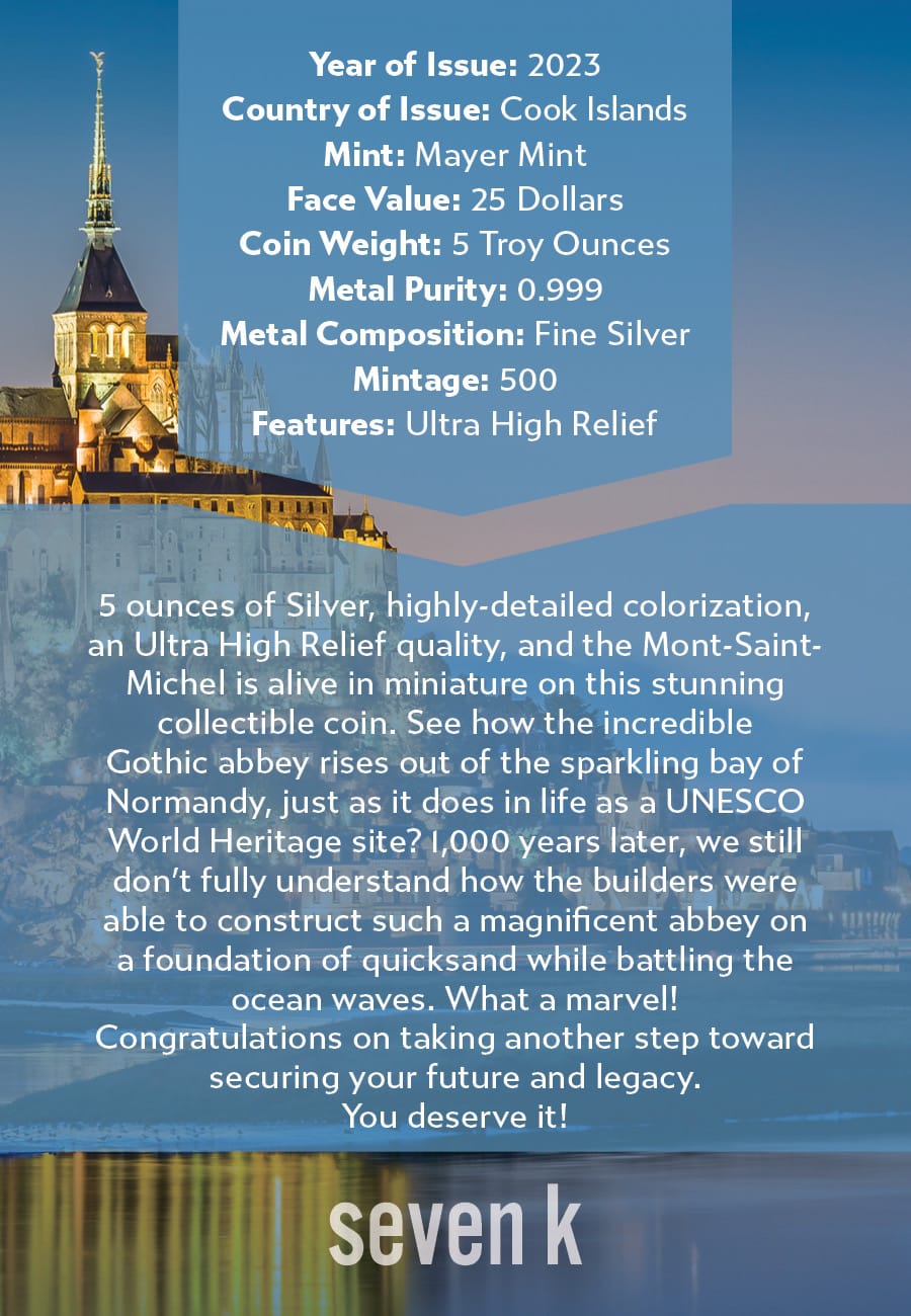 5 ounces of Silver, highly-detailed colorization, an Ultra High Relief quality, and the Mont-Saint-Michel is alive in miniature on this stunning collectible coin. See how the incredible Gothic abbey rises out of the sparkling bay of Normandy, just as it does in life as a UNESCO World Heritage site? 1,000 years later, we still don’t fully understand how the builders were able to construct such a magnificent abbey on a foundation of quicksand while battling the ocean waves. What a marvel!