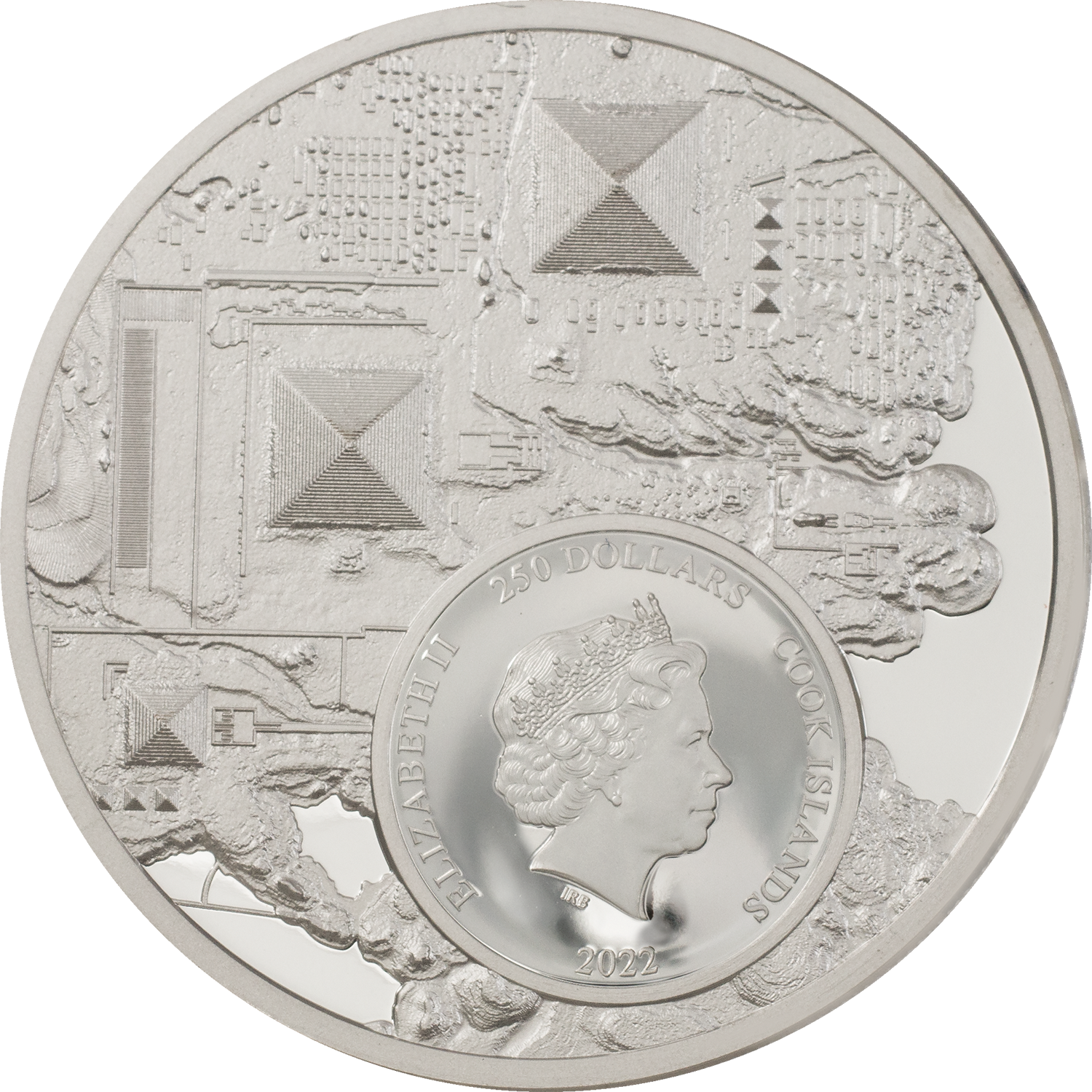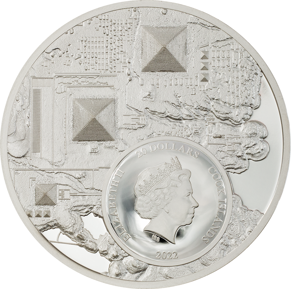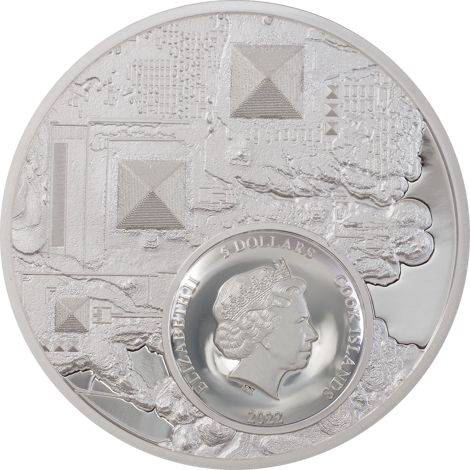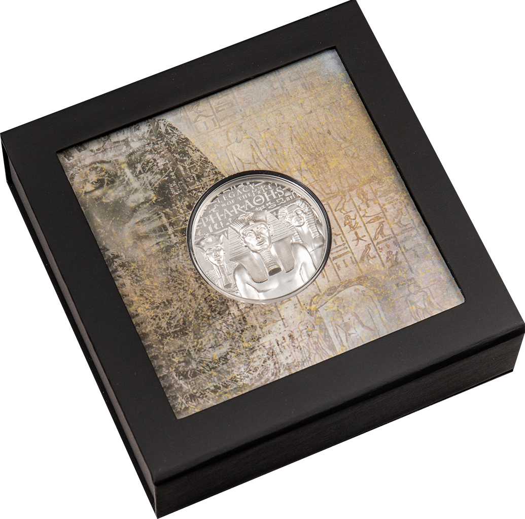 Each of these smartminted® ultra-high relief coins shows three different Pharaohs on the reverse and an incredible birds-eye view of the Giza Necropolis on the obverse. The three Pharaohs featured are Akhenaten, Thutmosis III, and Sobekneferu, the first female Pharaoh. They are seen standing next to each other in incredible relief. Each having its own distinctive look. Behind them are hieroglyphics from the ancient artifact “The Stele of Revealing” which resides in the Boulak Museum in Cairo. The obverse of this coin is really amazing and shows the great Pyramids of Giza in stunning relief and detail. You can literally count the different layers of brick on each Pyramid! Look closely and you can also see the Sphinx rising off the surface. There are also plenty of other structural details to feast your eyes upon. All this surrounds the domed effigy.