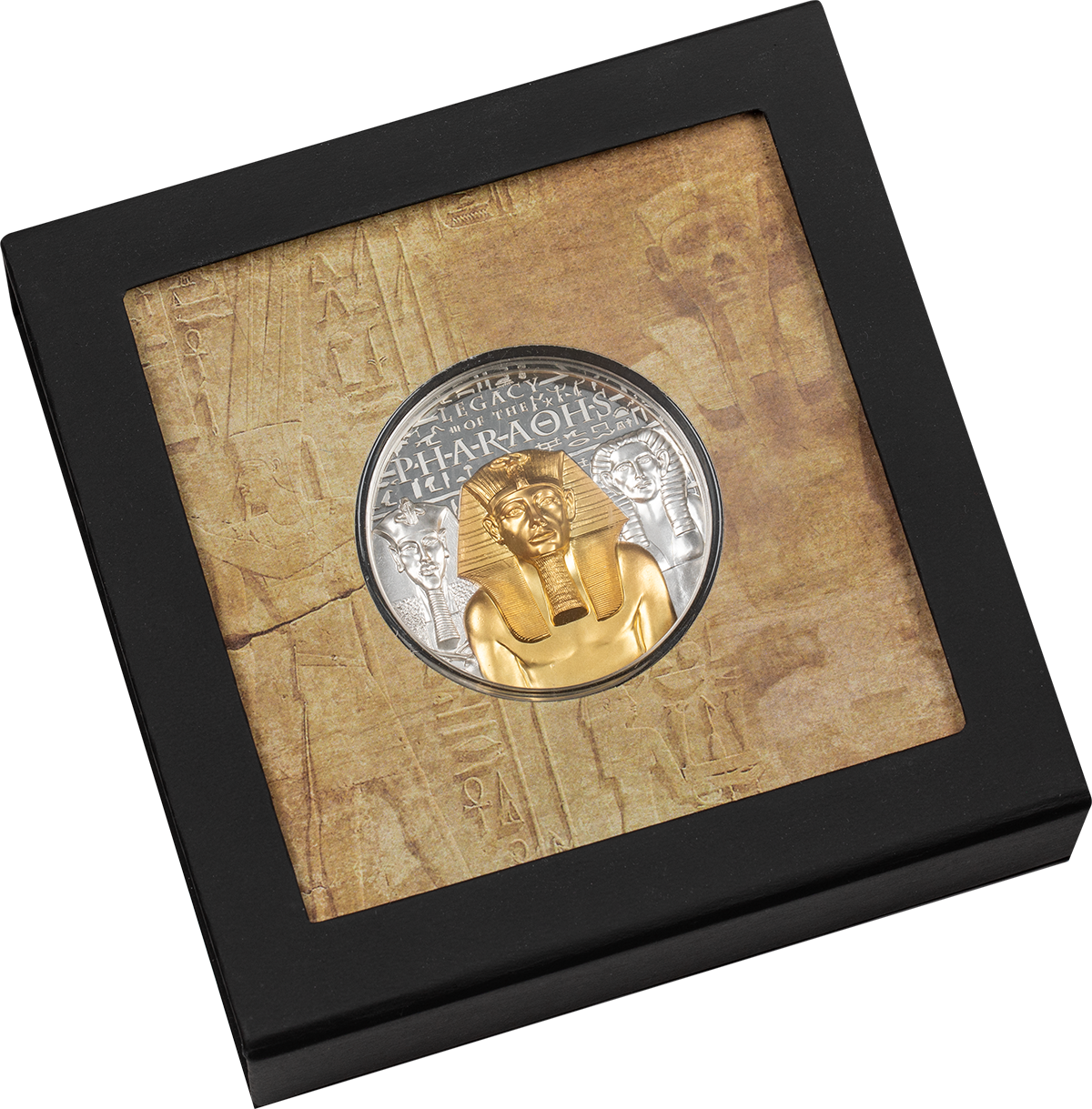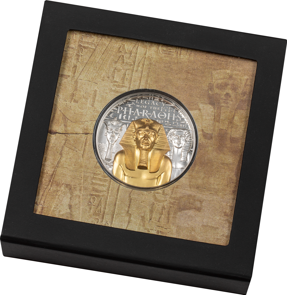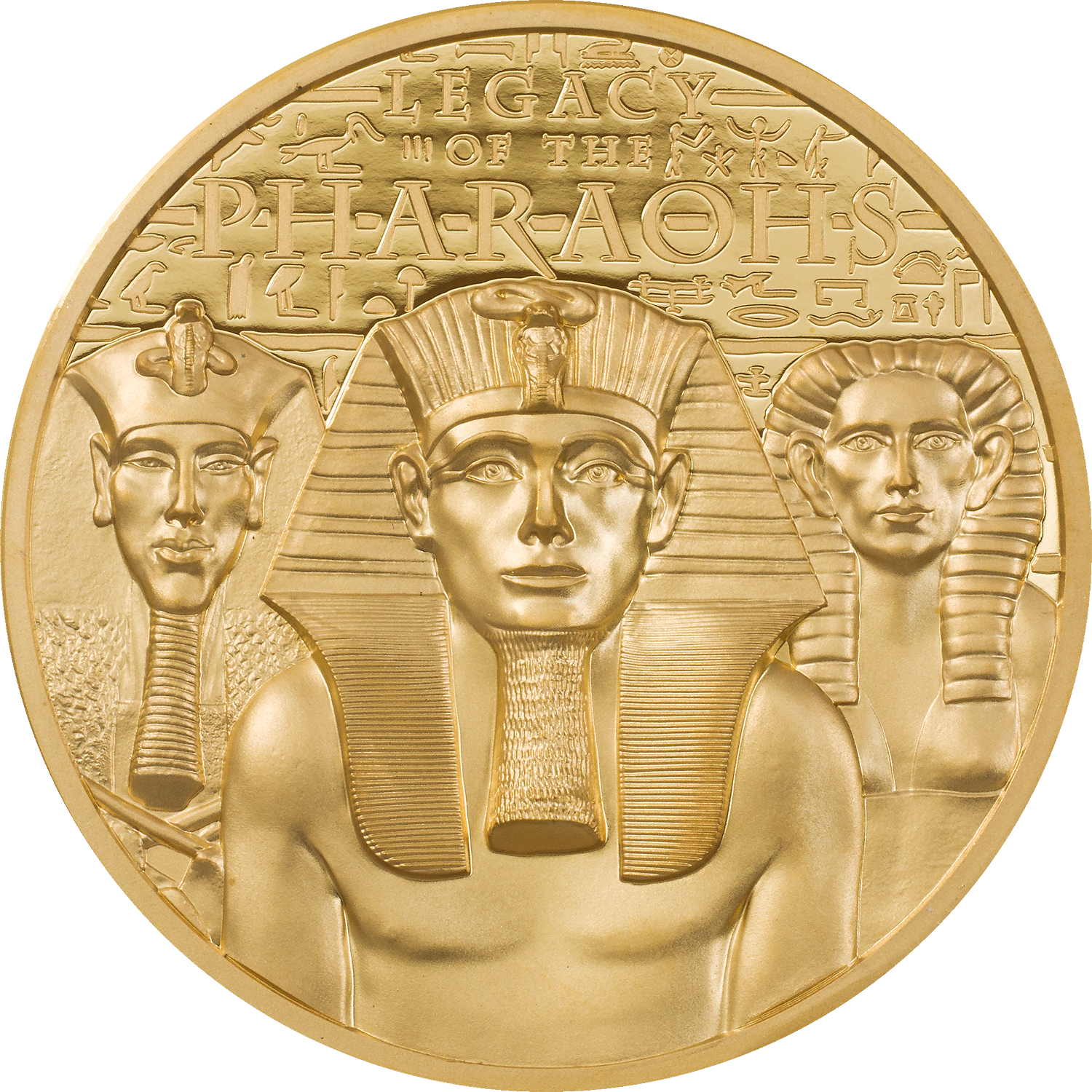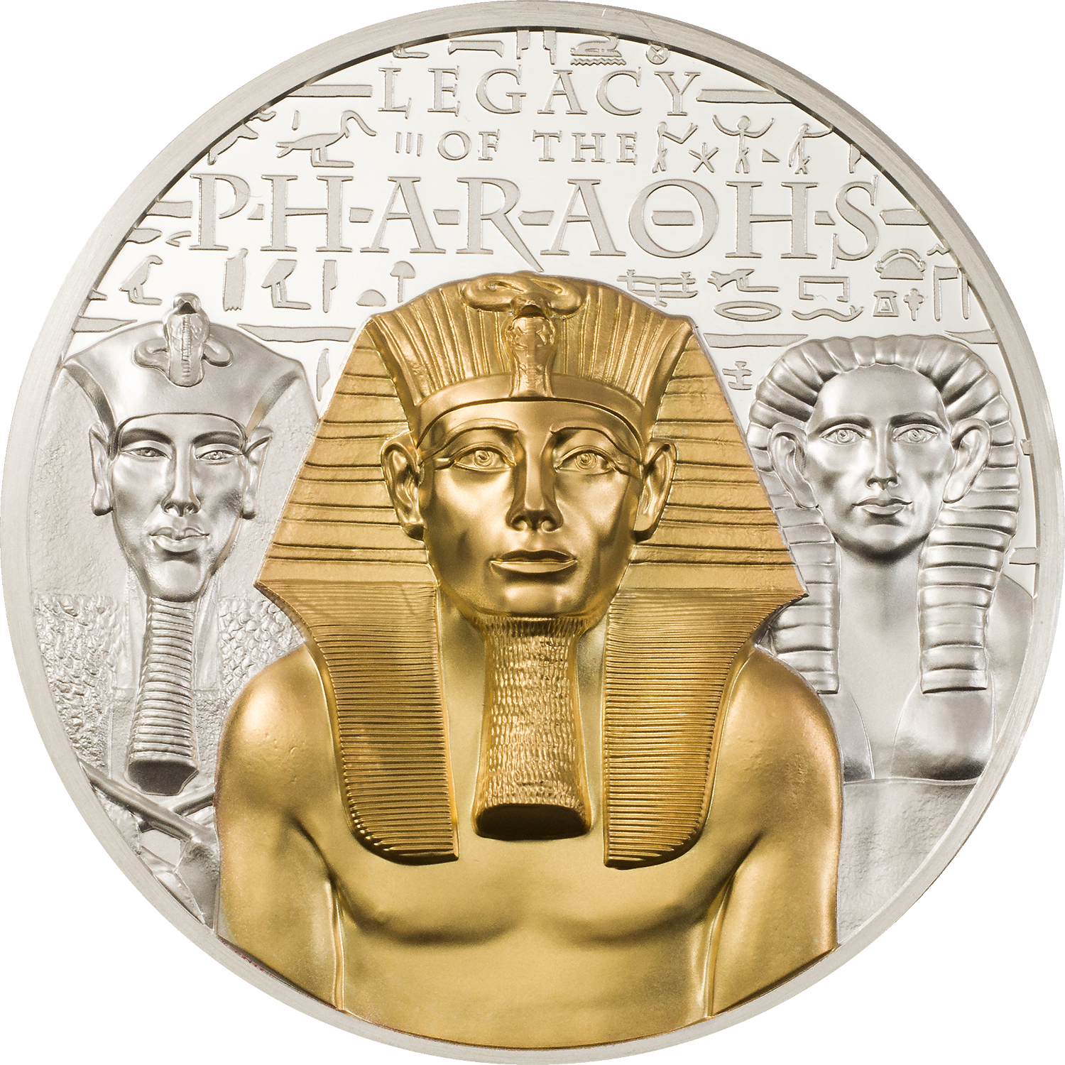Mummies? Nah, silly! It’s the Ancient Egyptian Pharaohs Akhenaten, Thutmosis III, and Sobekneferu—back on a 3 ounce wonder but with gold plating. These guys and gal—yes, you heard us right, Queen Sobekneferu was a lady—were pretty influential leaders in their day. Pyramids were constructed under their rule. Enjoy the bird’s eye view of the legacy of some of the greatest Egyptian Pharaohs on the obverse of the coin as well. It's not bad on the eyes!