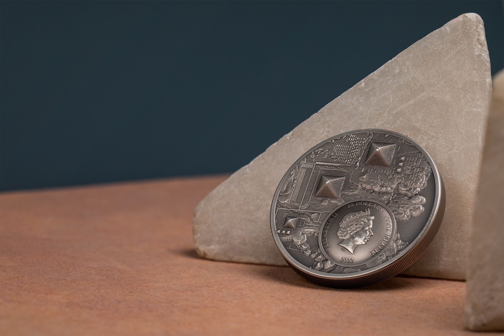 Mummies? Nah, silly! It’s the Ancient Egyptian Pharaohs Akhenaten, Thutmosis III, and Sobekneferu, on an antique-finish, 3 ounce fine silver coin. These guys and gal—yes, you heard us right, Queen Sobekneferu was a lady—were pretty influential leaders in their day. Pyramids were constructed under their rule. Enjoy the bird’s eye view of the legacy of some of the greatest Egyptian Pharaohs on the obverse of the coin as well. It's not bad on the eyes!