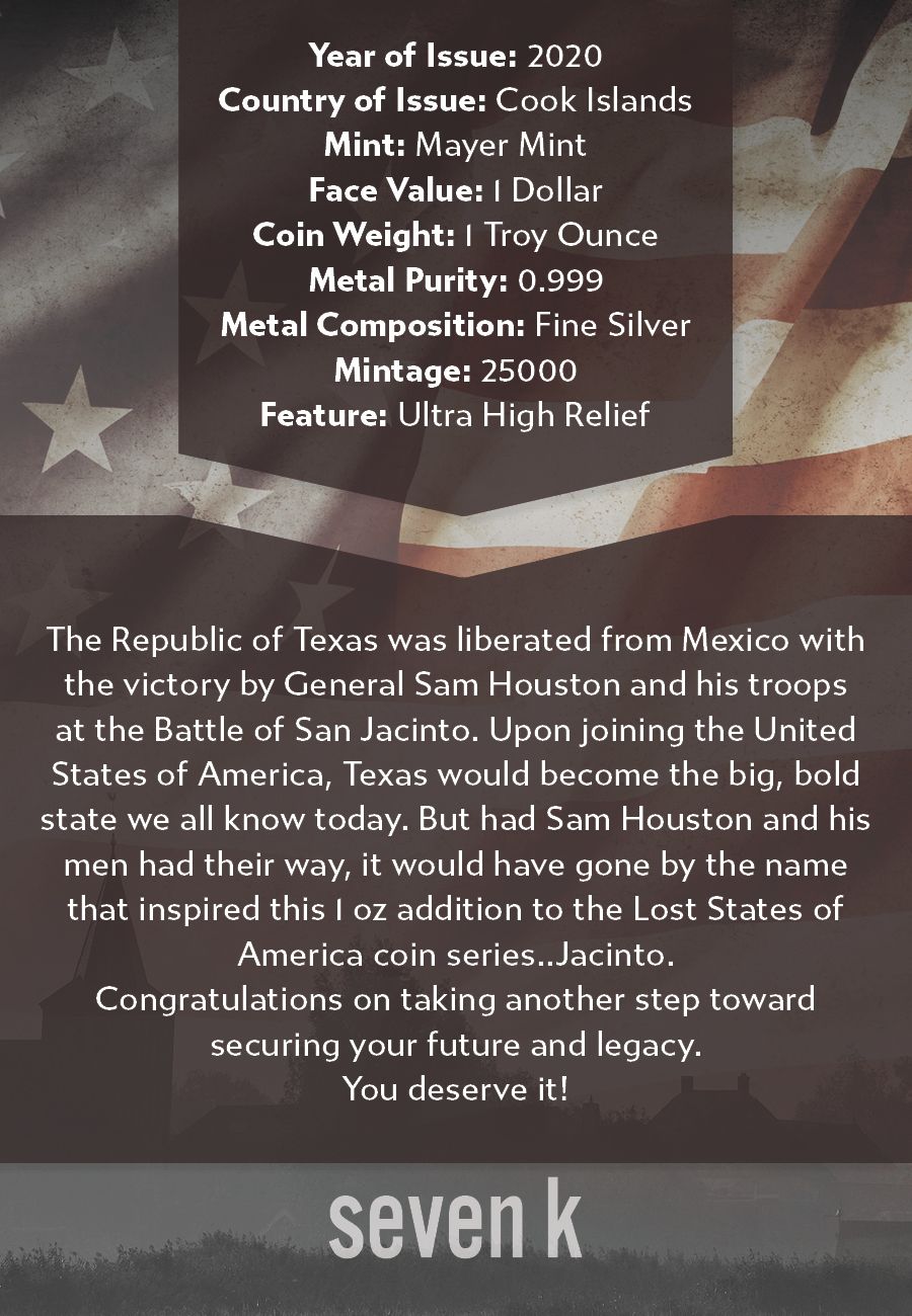 2020 Lost States of America Jacinto 1 oz Silver Coin
