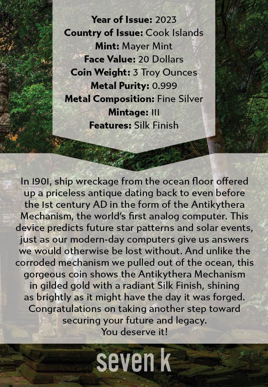 In 1901, ship wreckage from the ocean floor offered up a priceless antique dating back to even before the 1st century AD in the form of the antikythera mechanism, the world’s first analog computer. This device predicts future star patterns and solar events, just as our modern-day computers give us answers we would otherwise be lost without. And unlike the corroded mechanism we pulled out of the ocean, this gorgeous coin shows the antikythera mechanism in gilded gold with a radiant silk finish, shining as brightly as it might have the day it was forged.