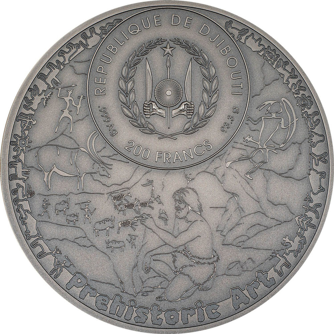 In Djibouti, Africa, many kilometers from the nearest establishment, the Abourma Rock bakes under the scorching sun. To behold it requires a formidable journey, but you won’t regret your efforts. The stone face is carved with prehistoric artwork from a lost civilization, replicated here on this 3-oz silver coin. If you look very carefully you may recognize some of the shapes … is that a giraffe?