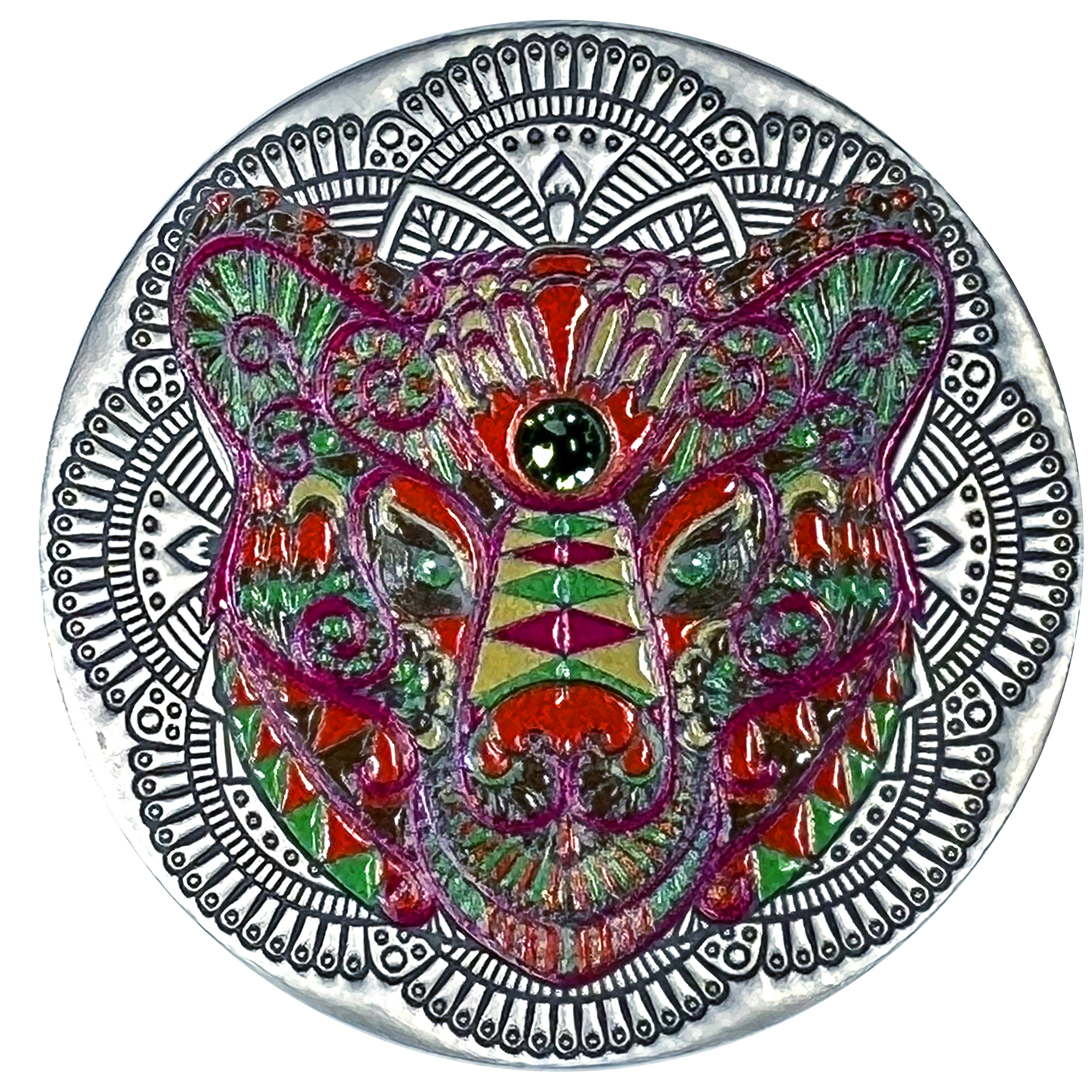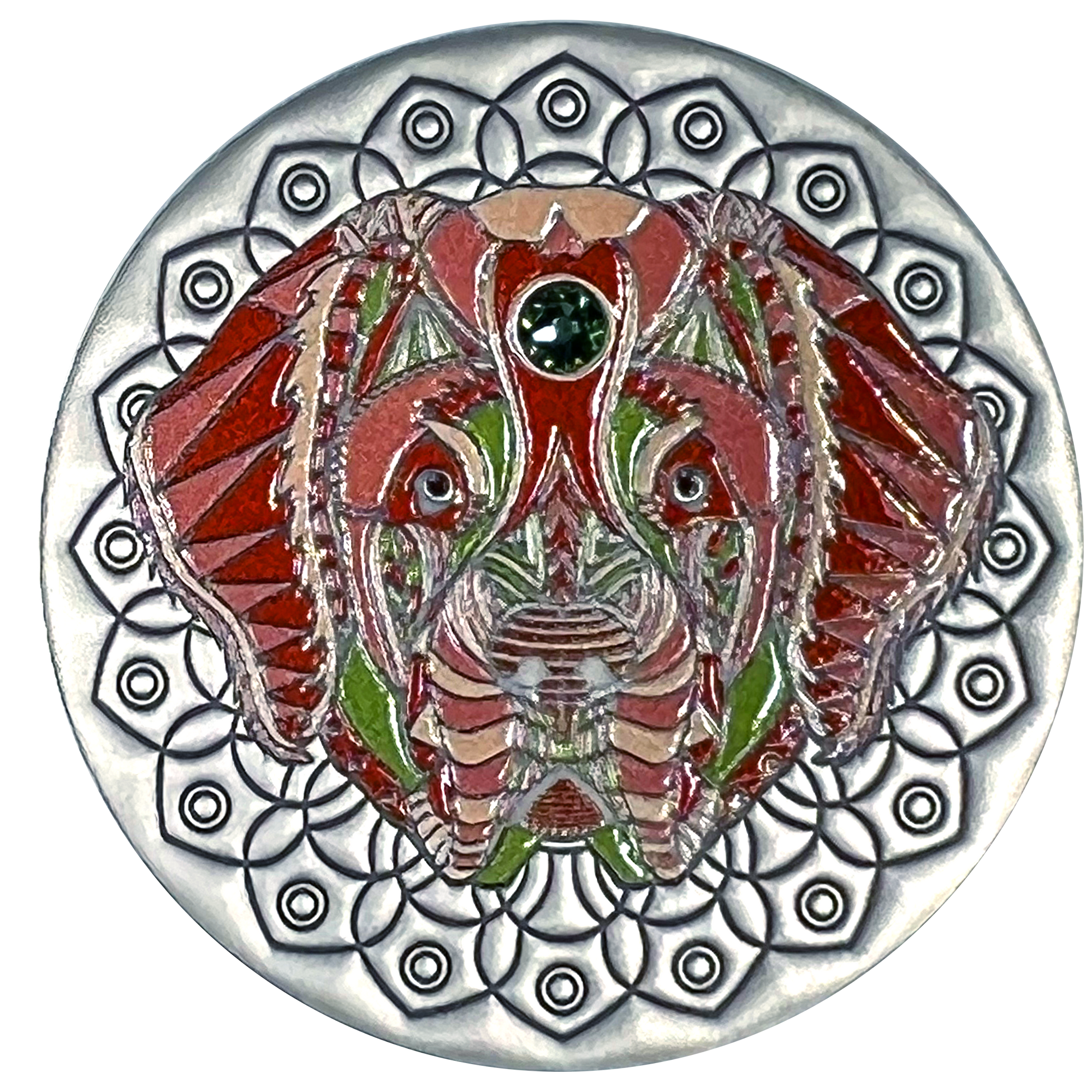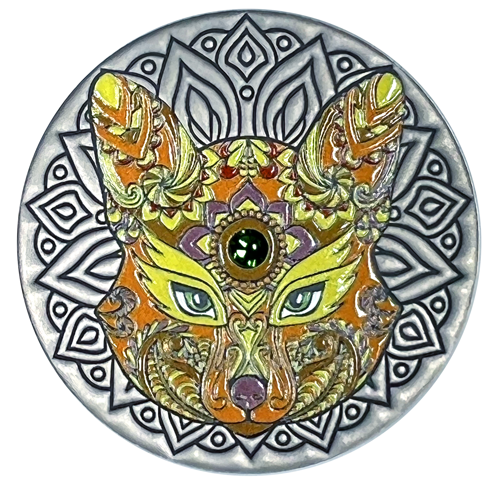 Our mischievous red-headed forest friends have made it onto their very own Mandala coin, and what a beautiful sight it is! The emerald green between his eyes almost makes you forget that the fox is the trickiest of animals in the forest. Be glad you swiped his coin before he disappeared!