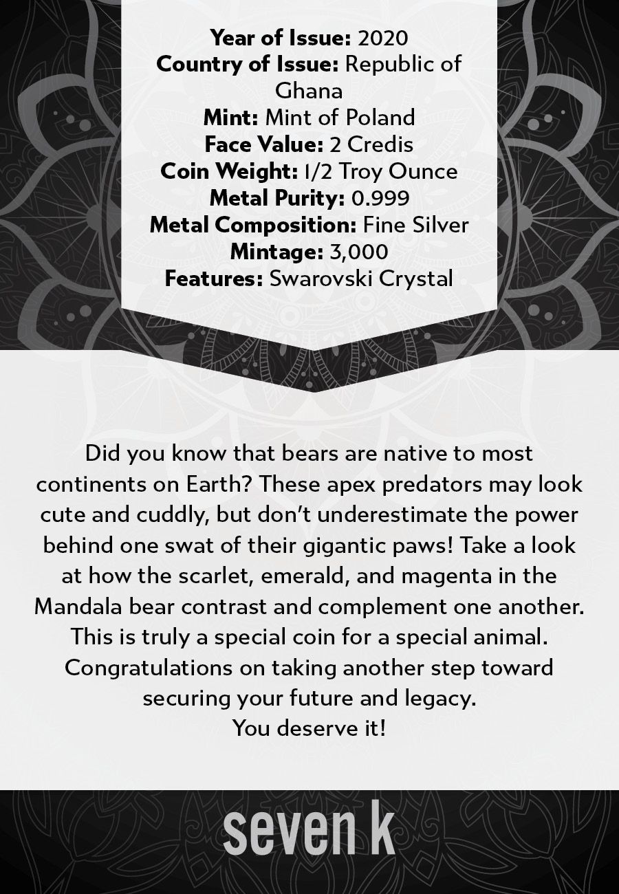 Did you know that bears are native to most continents on Earth? These apex predators may look cute and cuddly, but don't underestimate the power behind one swat of their gigantic paws! Take a look at how the scarlet, emerald, and magenta in the Mandala bear contrast and complement one another. This is truly a special coin for a special animal.