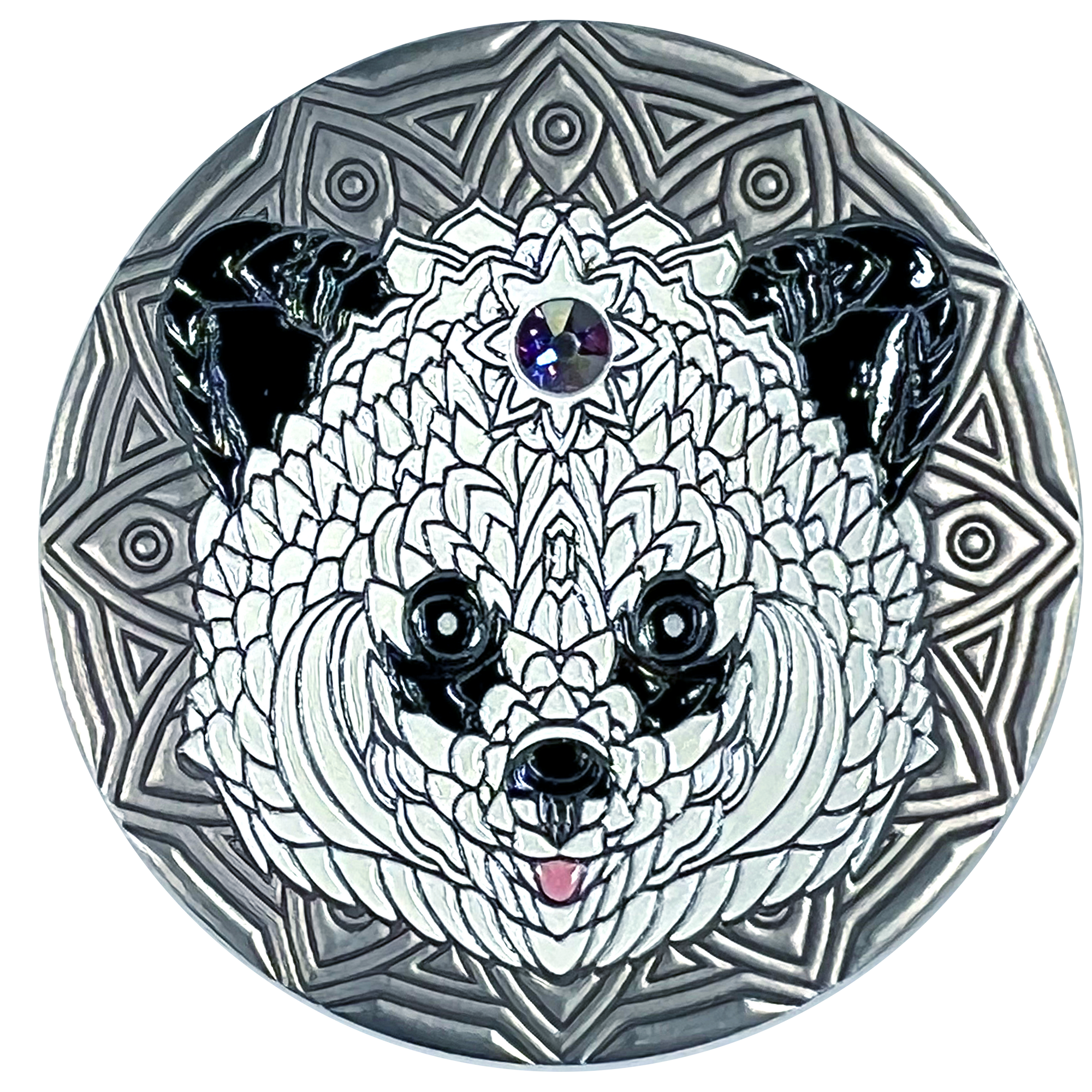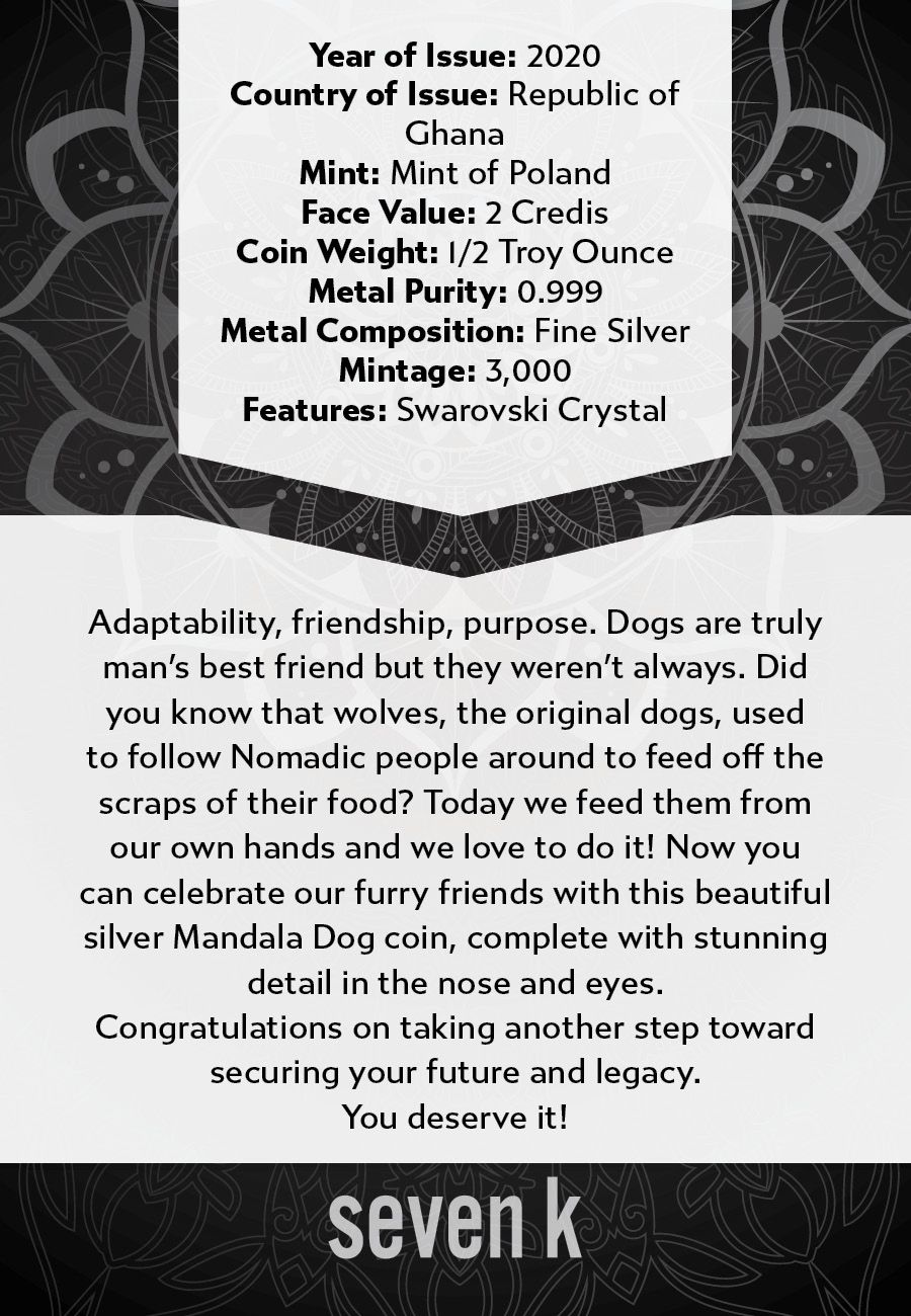 Adaptability, friendship, purpose. Dogs are truly man's best friend but they weren't always. Did you know that wolves, the original dogs, used to follow Nomadic people around to feed off the scraps of their food? Today we feed them from our own hands and we love to do it! Now you can celebrate our furry friends with this beautiful silver Mandala Dog coin, complete with stunning detail in the nose and eyes.