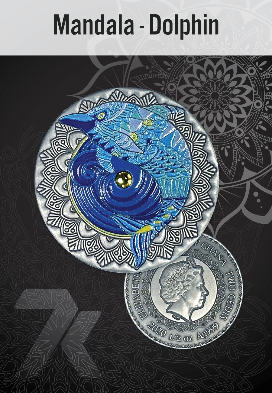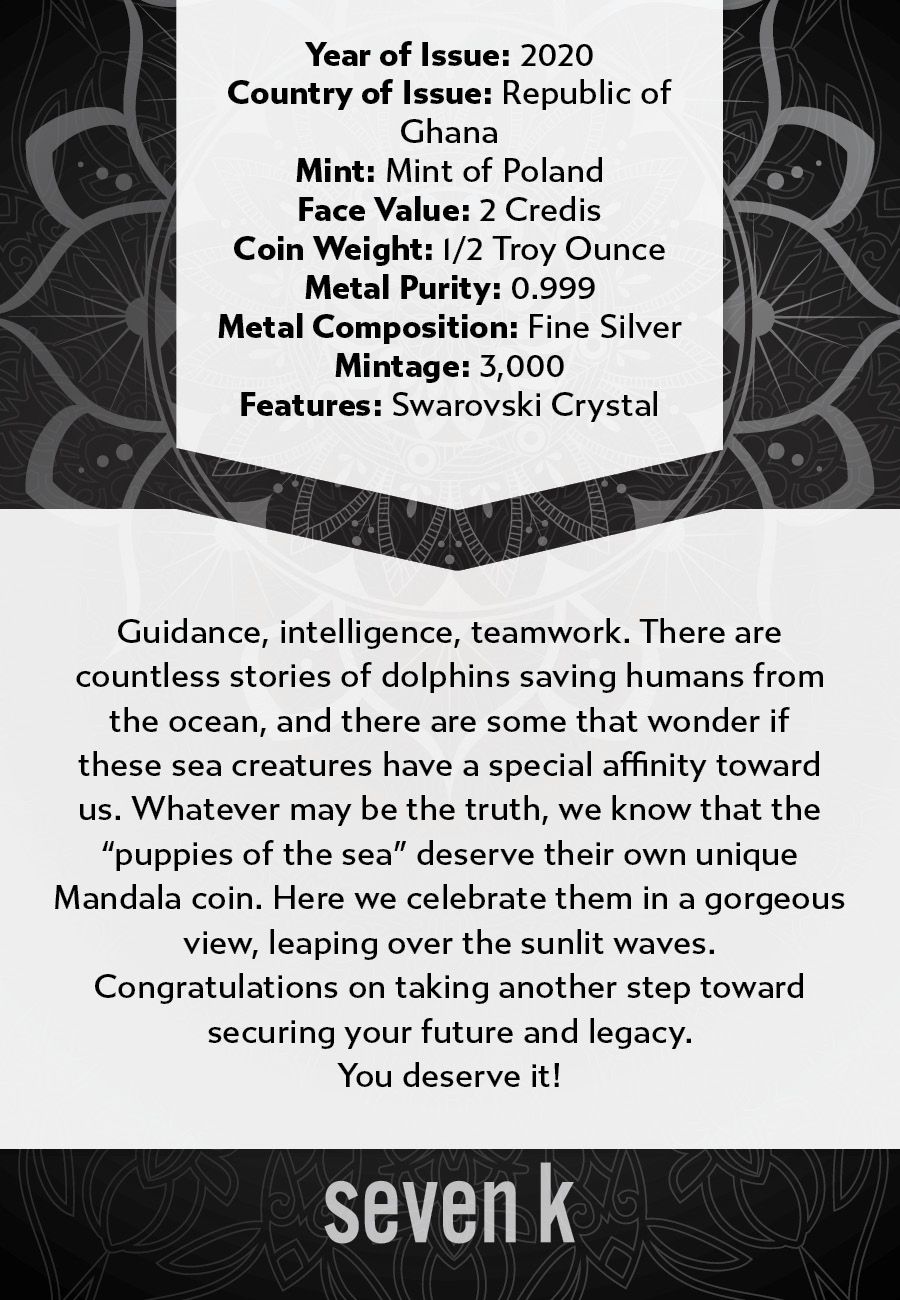 Guidance, intelligence, teamwork. There are countless stories of dolphins saving humans from the ocean, and there are some that wonder if these sea creatures have a special affinity toward us. Whatever may be the truth, we know that the "puppies of the sea" deserve their own unique Mandala coin. Here we celebrate them in a gorgeous view, leaping over the sunlit waves.
