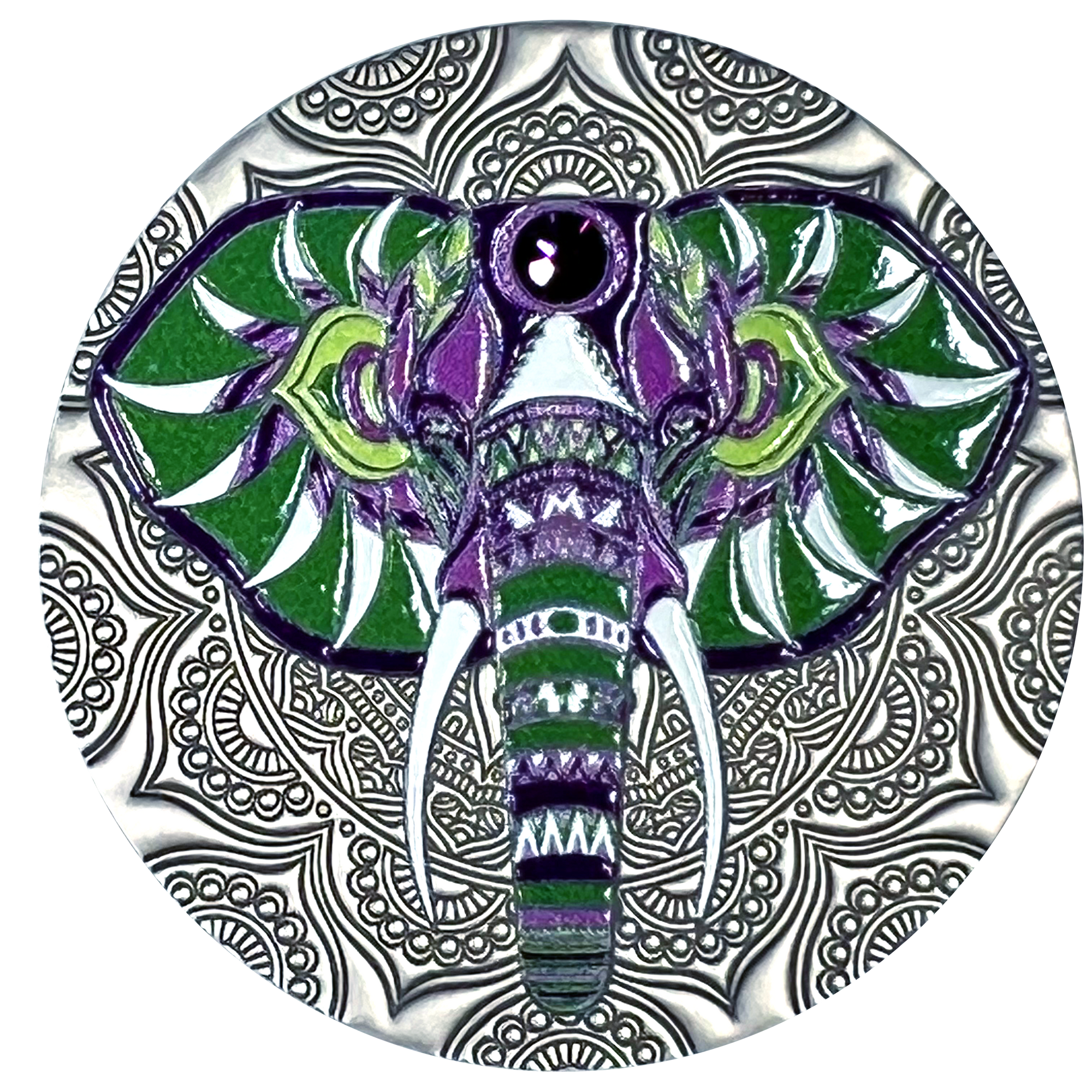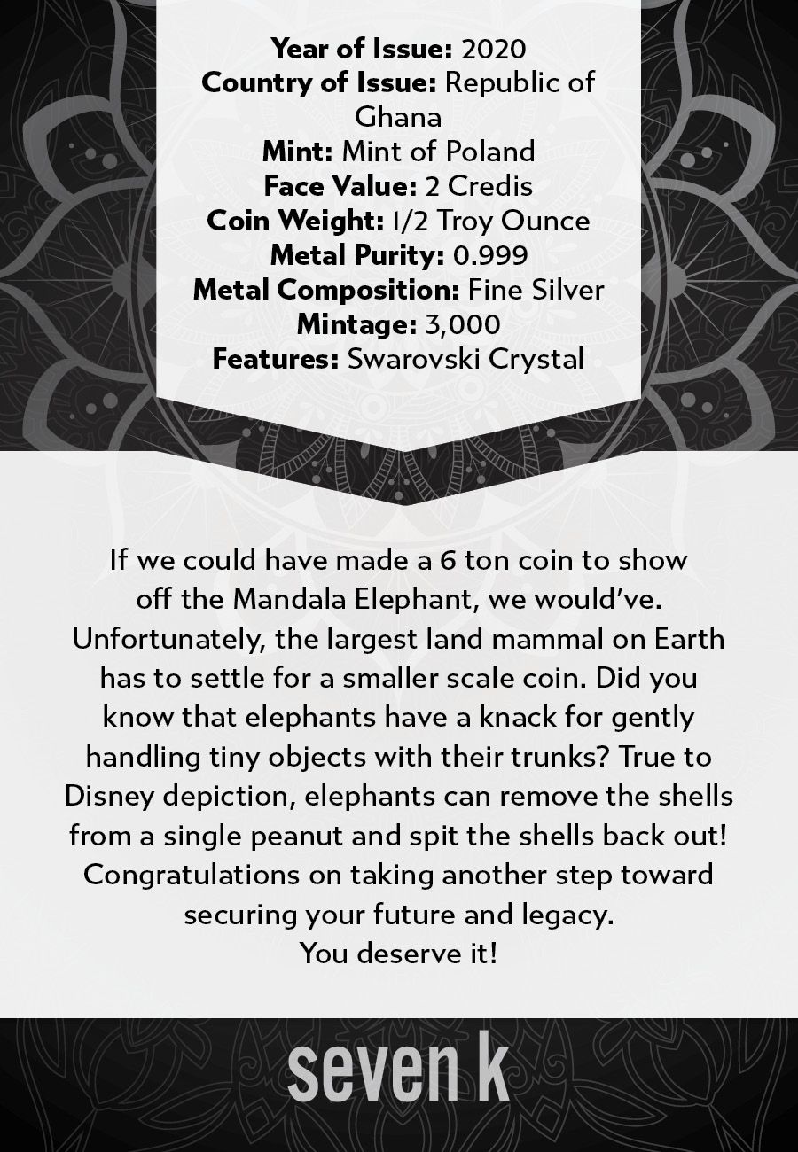 If we could have made a 6 ton coin to show off the Mandala Elephant, we would've. Unfortunately, the largest land mammal on Earth has to settle for a smaller scale coin. Did you know that elephants have a knack for gently handling tiny objects with their trunks? True to Disney depiction, elephants can remove the shells from a single peanut and spit the shells back out!
