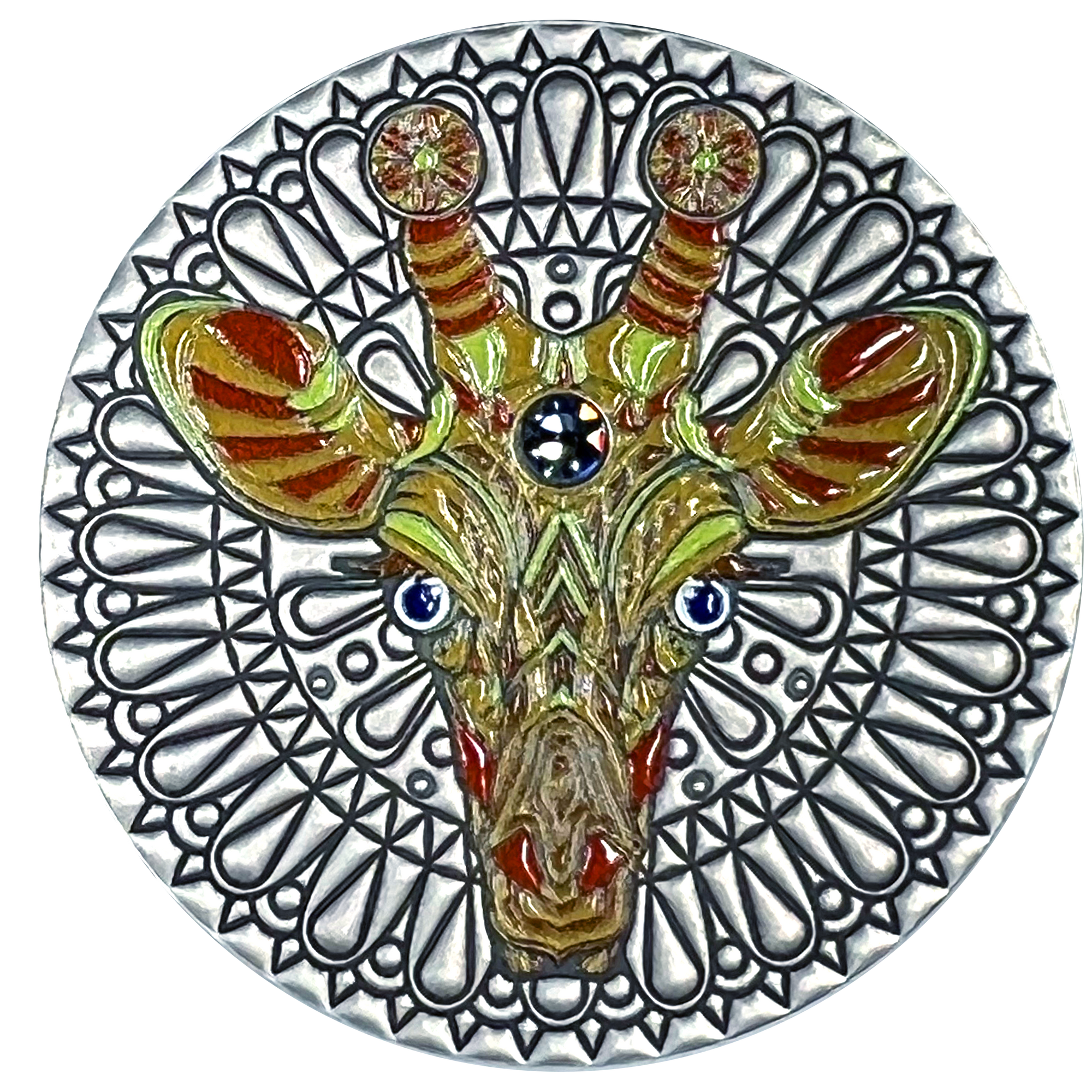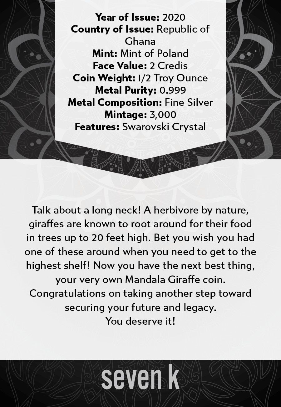 Talk about a long neck! A herbivore by nature, giraffes are known to root around for their food in trees up to 20 feet high. Bet you wish you had one of these around when you need to get to the highest shelf! Now you have the next best thing, your very own Mandala Giraffe coin.