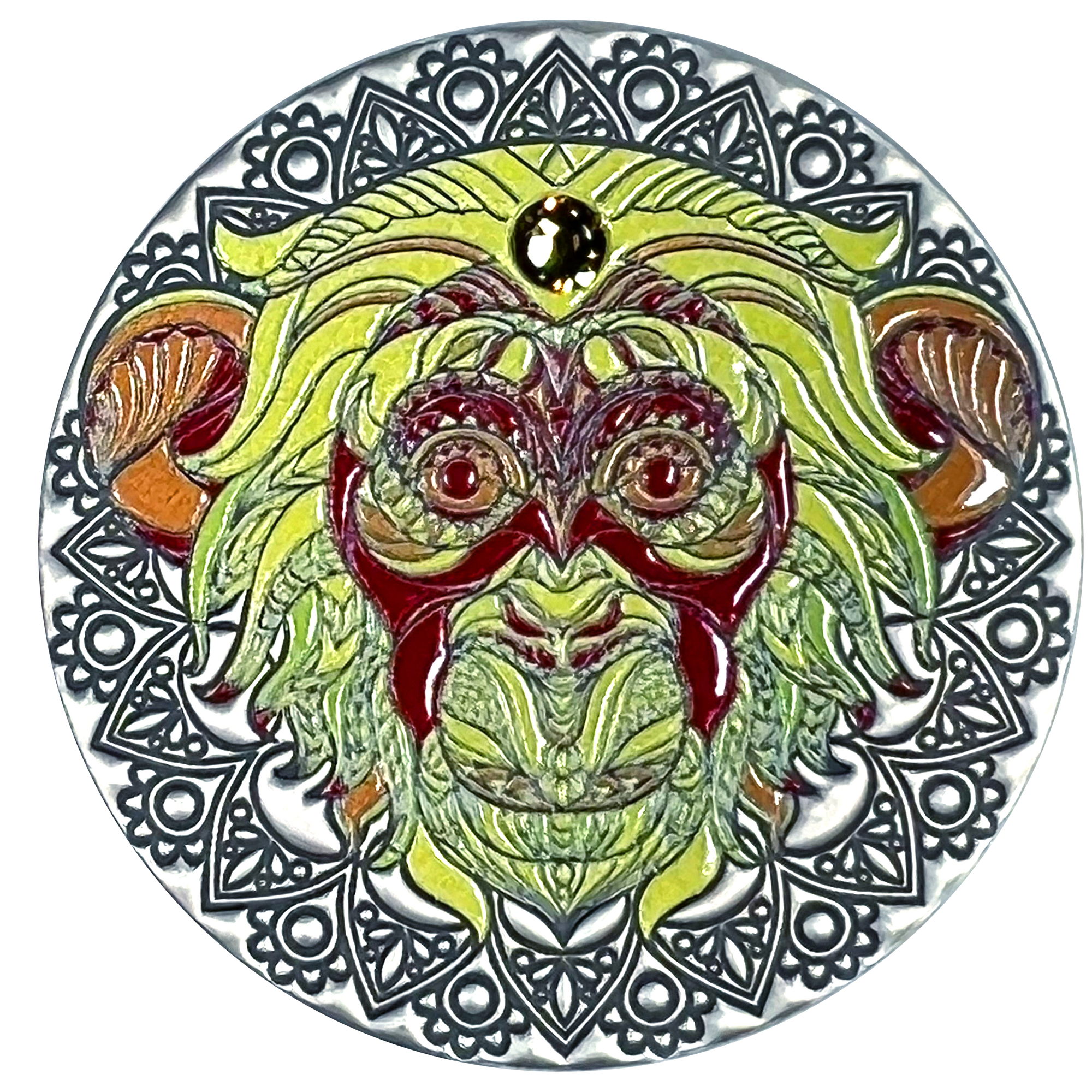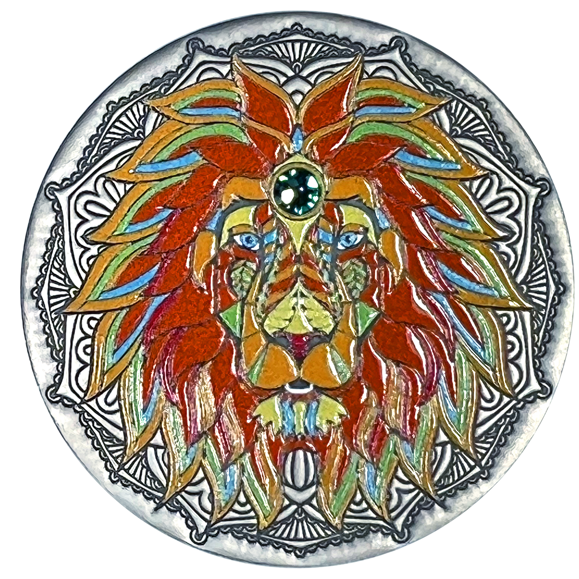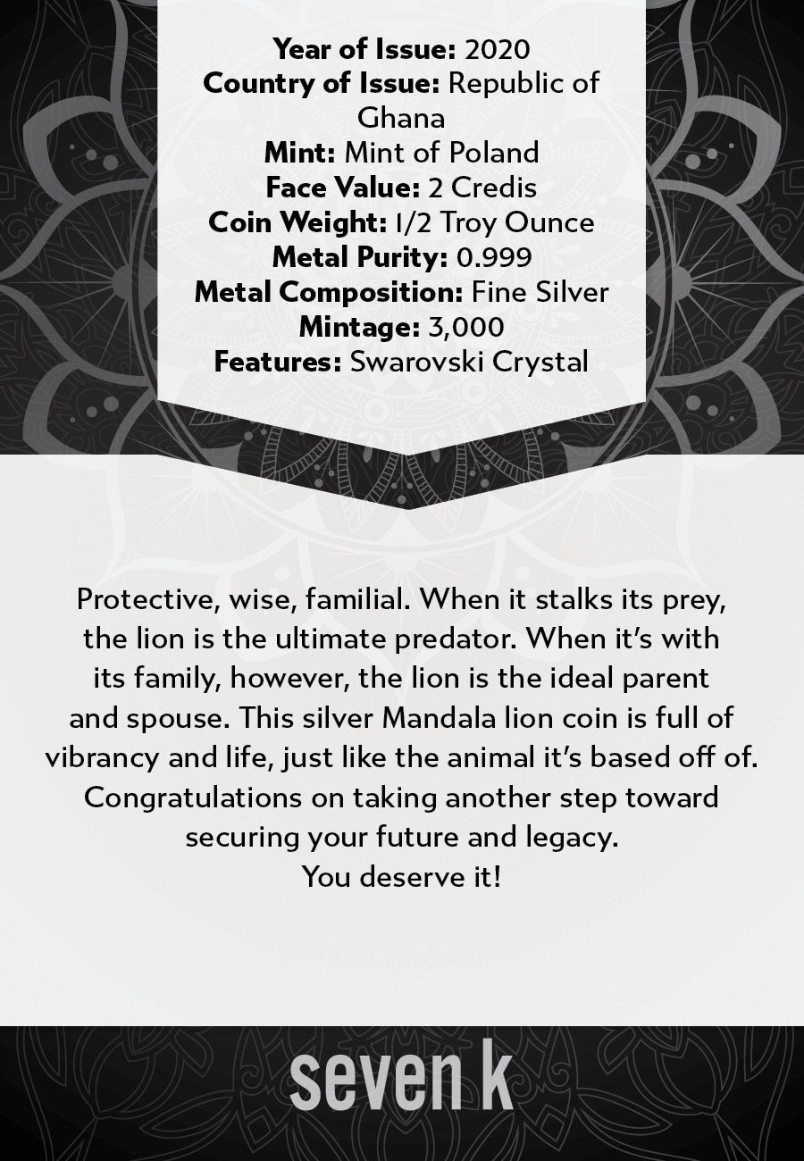 Protective, wise, familial. When it stalks its prey, the lion is the ultimate predator. When it's with its family, however, the lion is the ideal parent and spouse. This silver Mandala lion coin is full of vibrancy and life, just like the animal it's based off of.