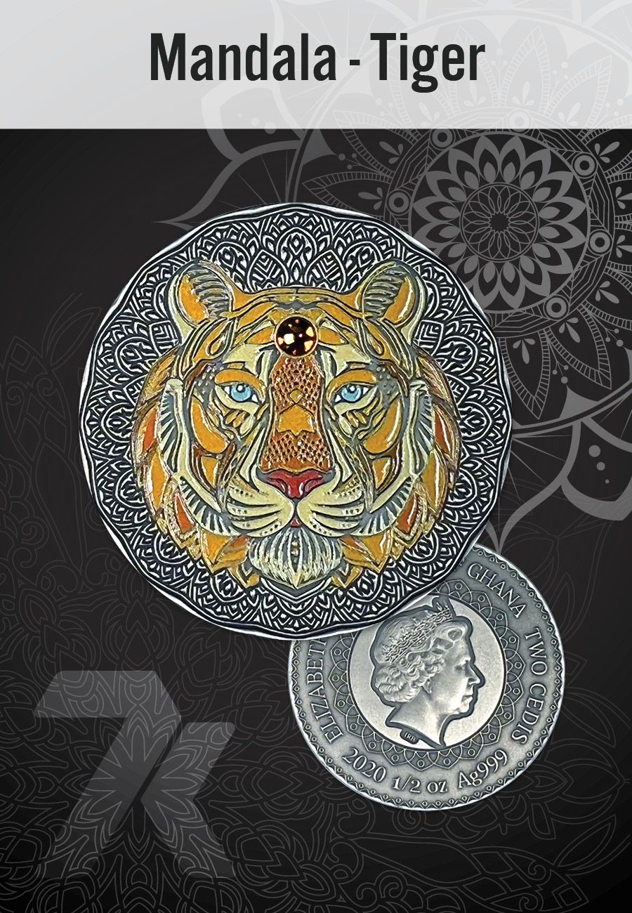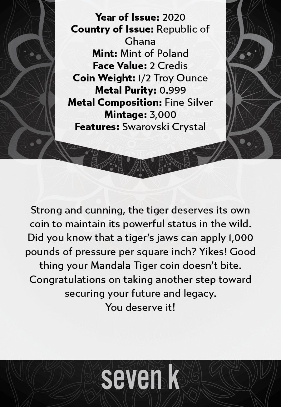 Strong and cunning, the tiger deserves its own coin to maintain its powerful status in the wild. Did you know that a tiger's jaws can apply 1,000 pounds of pressure per square inch? Yikes! Good thing your Mandala Tiger coin doesn't bite.